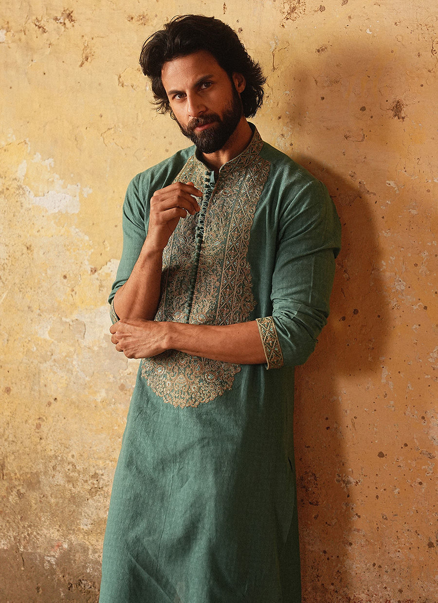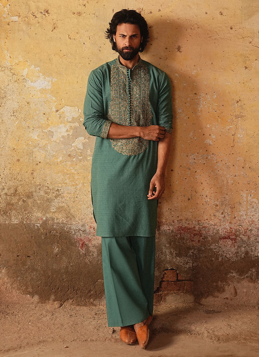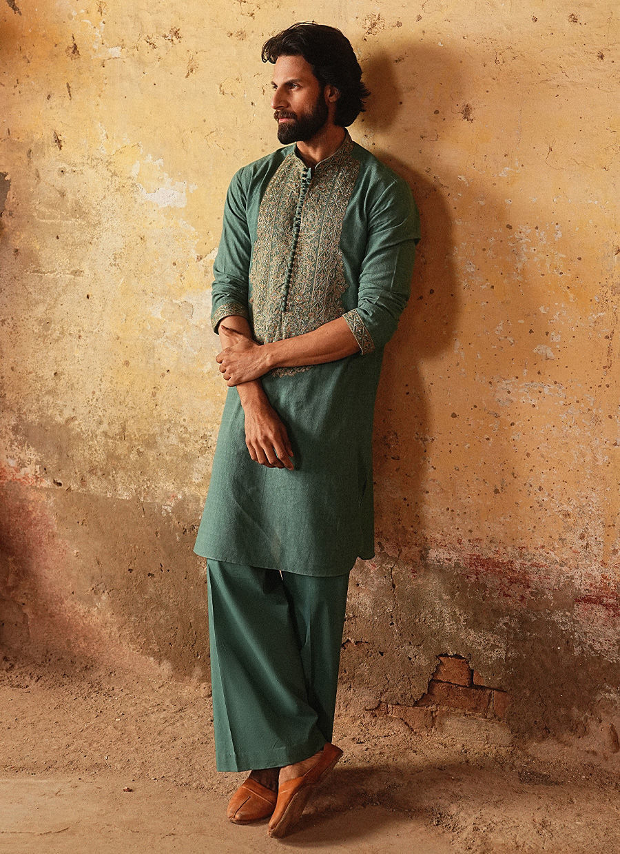 Designed for effortless style and comfort, this ensemble features a kurta crafted from self cotton (jacquard), offering a soft feel with subtle woven texture. The look is elevated with an anchor embroidered neckline and delicately detailed side pockets, adding a touch of refined craftsmanship. Paired with a breathable cotton lawn trouser, this outfit ensures all-day ease while maintaining a polished and sophisticated appearance—perfect for both casual wear and semi-formal settings.