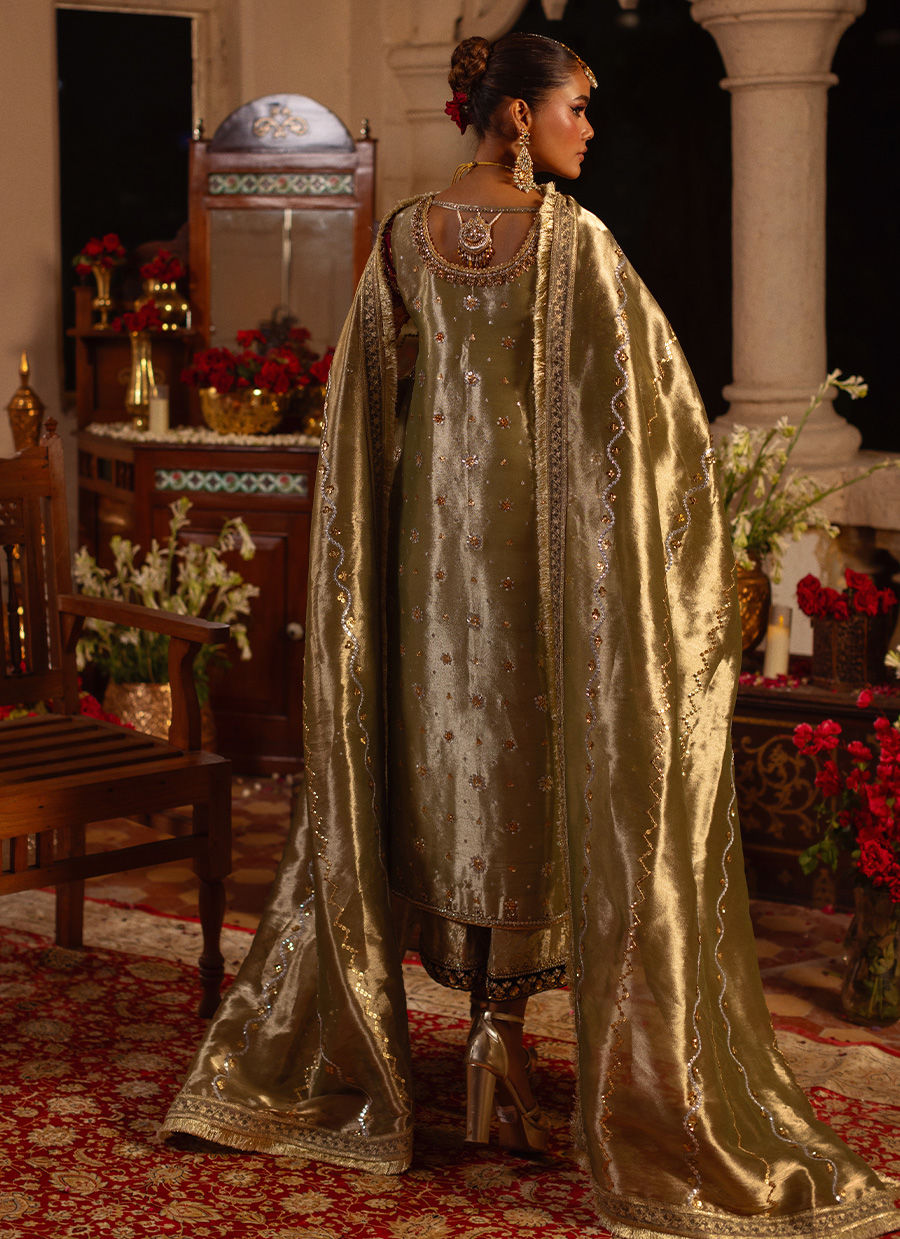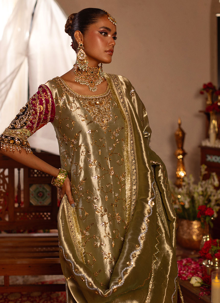 The long silhouette shirt is crafted from a glistening lamé canvas in an olive green hue, featuring an intricate antique and gold zardozi jaal on the center front. The neckline is elegantly enhanced with meticulously handcrafted miniature zardozi details. The color-blocked velvet and jamawar sleeves add a touch of glamour, adorned with classic zardozi elements. This ensemble is paired with a matching izaar, embellished with velvet appliqué and a zardozi border along the hem. Additionally, the outfit is complemented by a matching lamé dupatta, which showcases exquisite sequin details and is bordered with zari, featuring fringe accents on each side.