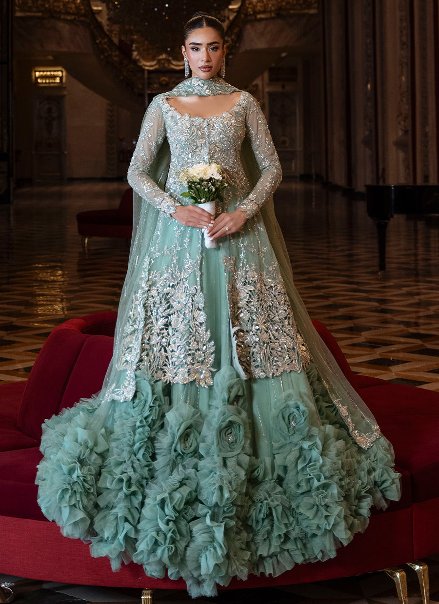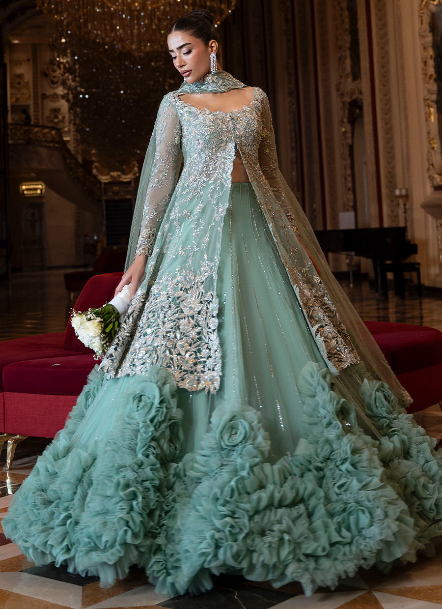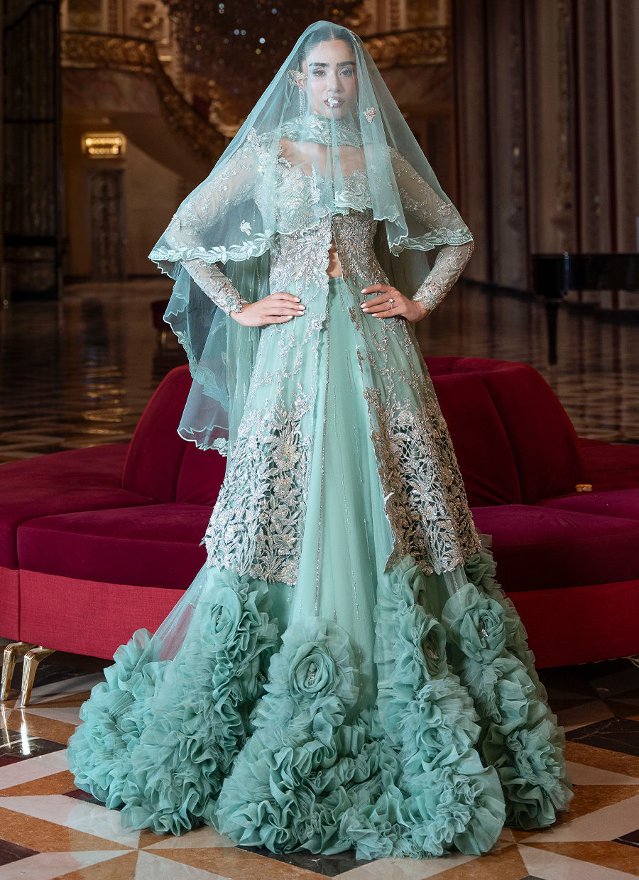 An elegant ice-blue jacket, lavishly hand-embellished with Swarovski crystals, nakshi, dabka, resham, and contrasting sequins, meticulously crafted to exude regal sophistication. Paired with an extravagant ruffle skirt featuring delicate floral detailing and beadwork, the ensemble radiates modern luxury and glamour. A matching net dupatta, intricately hand-embellished, completes the look, making this timeless piece a true embodiment of grandeur and sophistication for the contemporary bride.