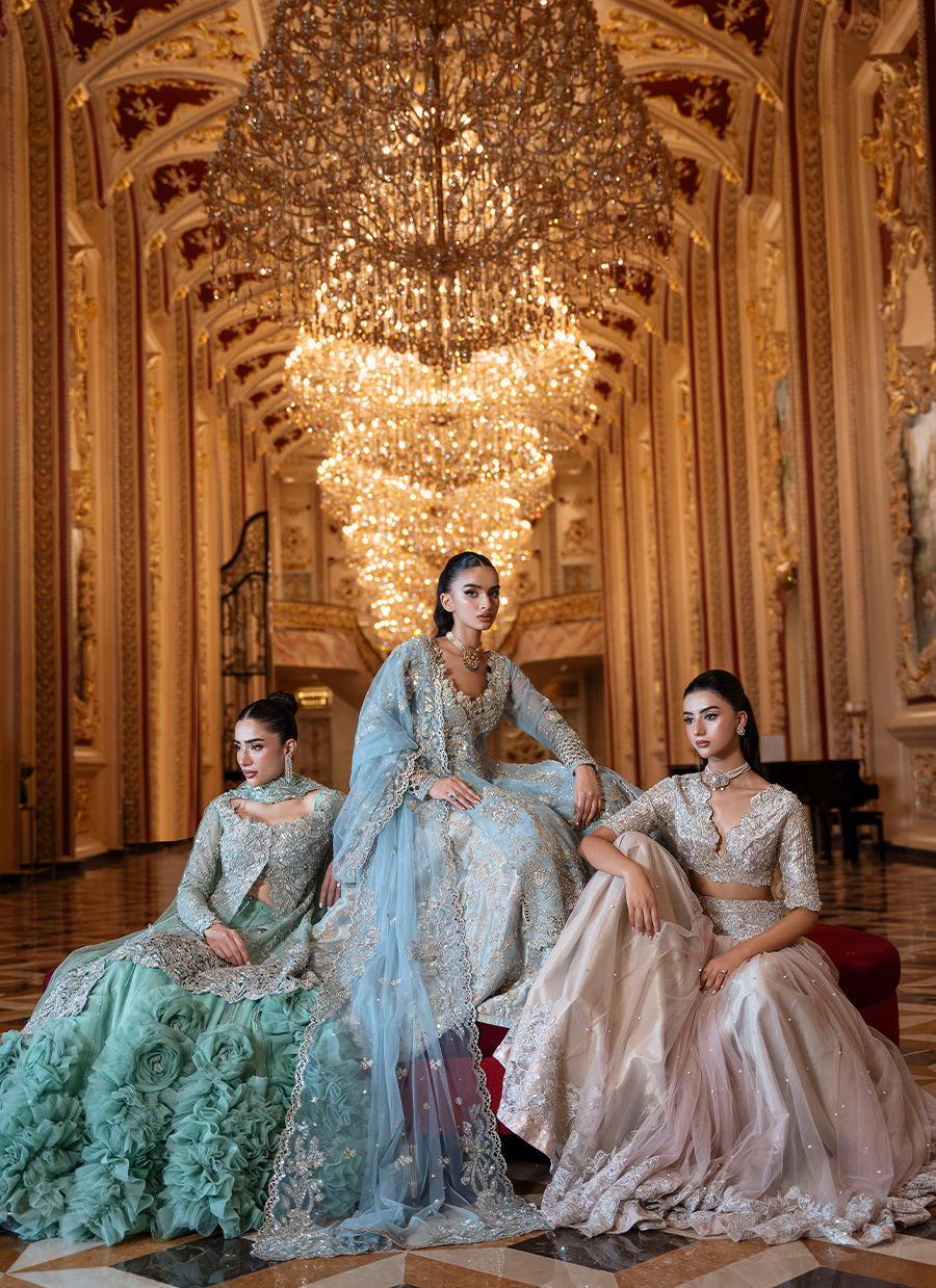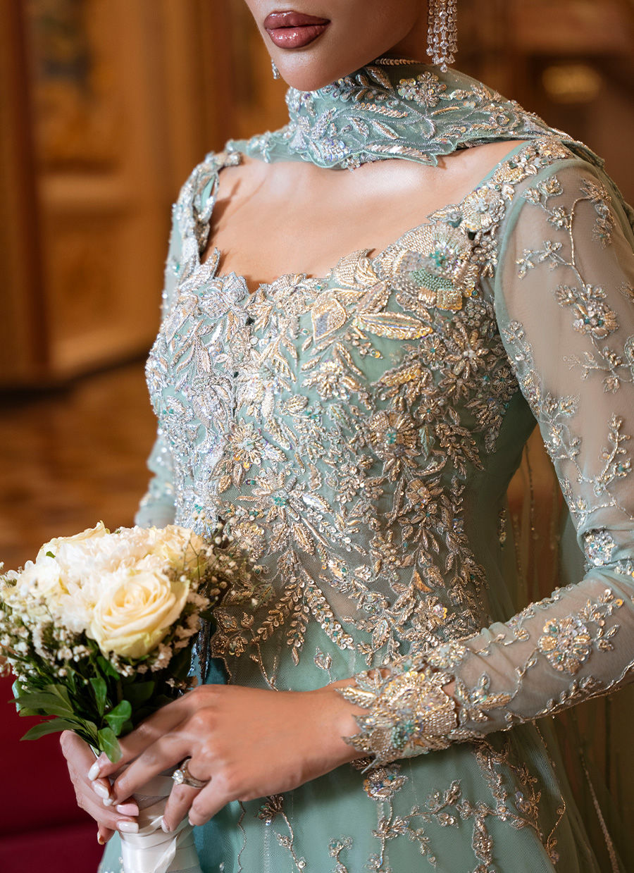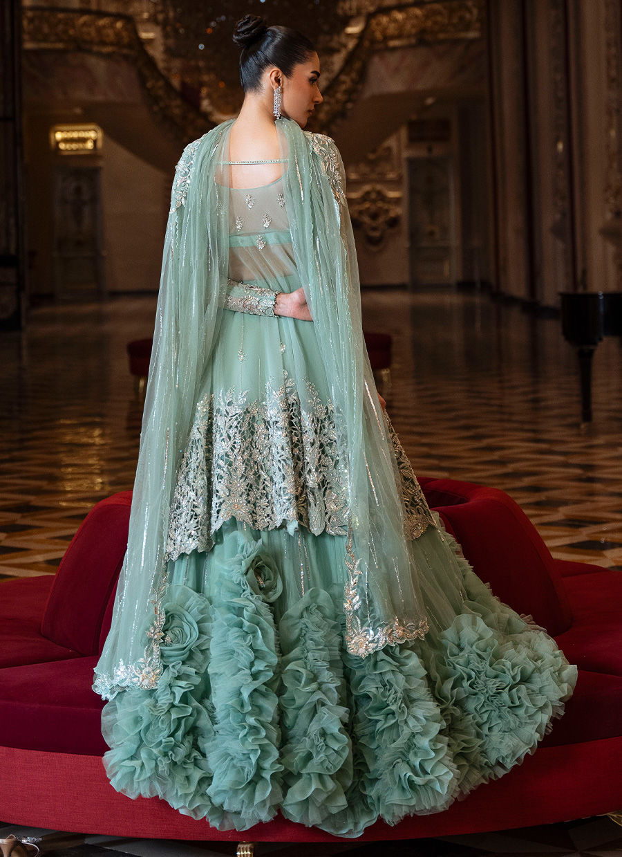 An elegant ice-blue jacket, lavishly hand-embellished with Swarovski crystals, nakshi, dabka, resham, and contrasting sequins, meticulously crafted to exude regal sophistication. Paired with an extravagant ruffle skirt featuring delicate floral detailing and beadwork, the ensemble radiates modern luxury and glamour. A matching net dupatta, intricately hand-embellished, completes the look, making this timeless piece a true embodiment of grandeur and sophistication for the contemporary bride.