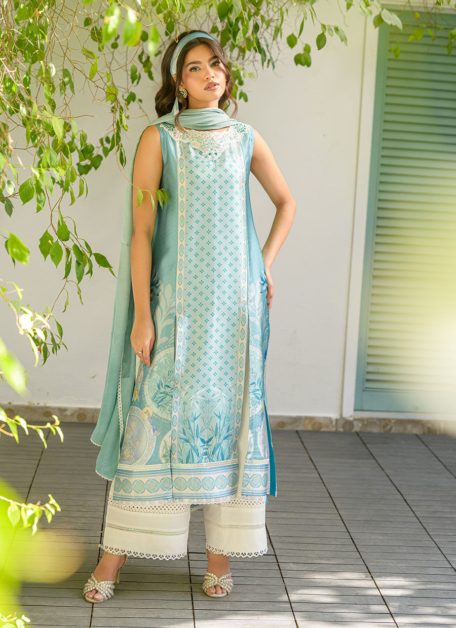 This modern article features a pastel teal blue silk printed long shirt with front slits and an embellished and embroidered white neckline and white lace finishing, all finished with a pastel teal cotton silk dupatta and white cotton culottes with lace and pleats finishing.
