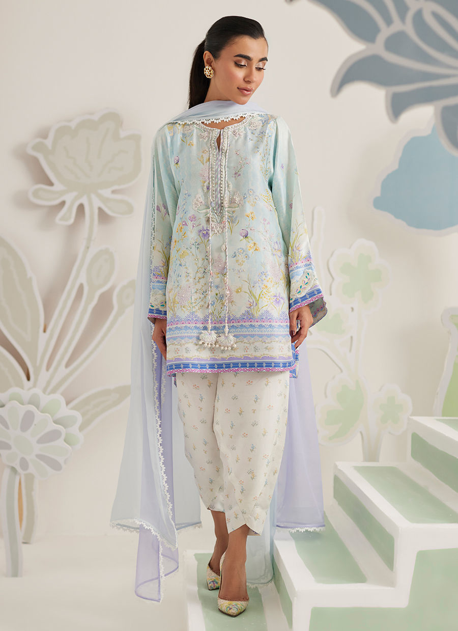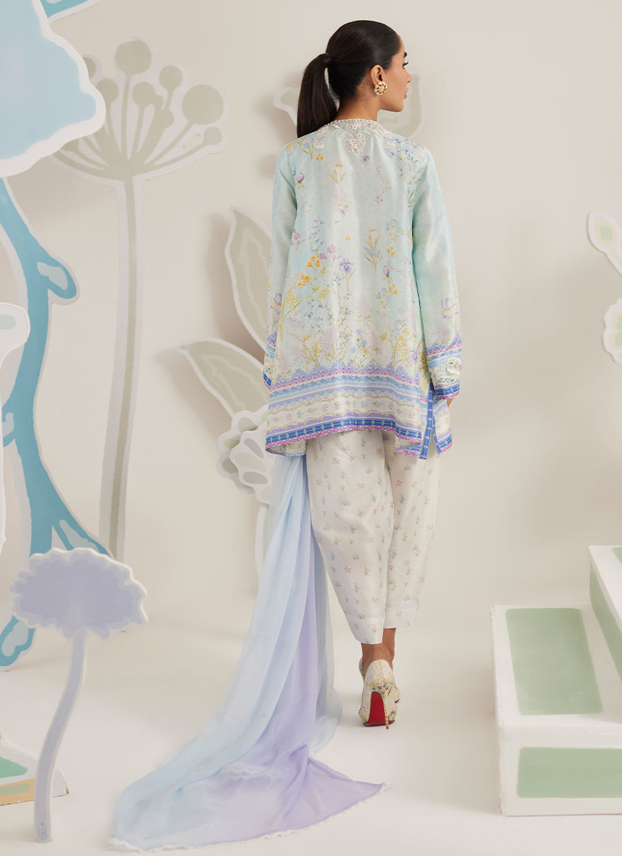 Paired with printed raw silk pants for a coordinated finish and complemented by an ombre-dyed chiffon dupatta, softly edged with scalloped lace, the look feels light, fluid, and impeccably balanced. Ideal for occasions that call for understated sophistication, this ensemble transitions seamlessly from daytime celebrations to elegant evening affairs.