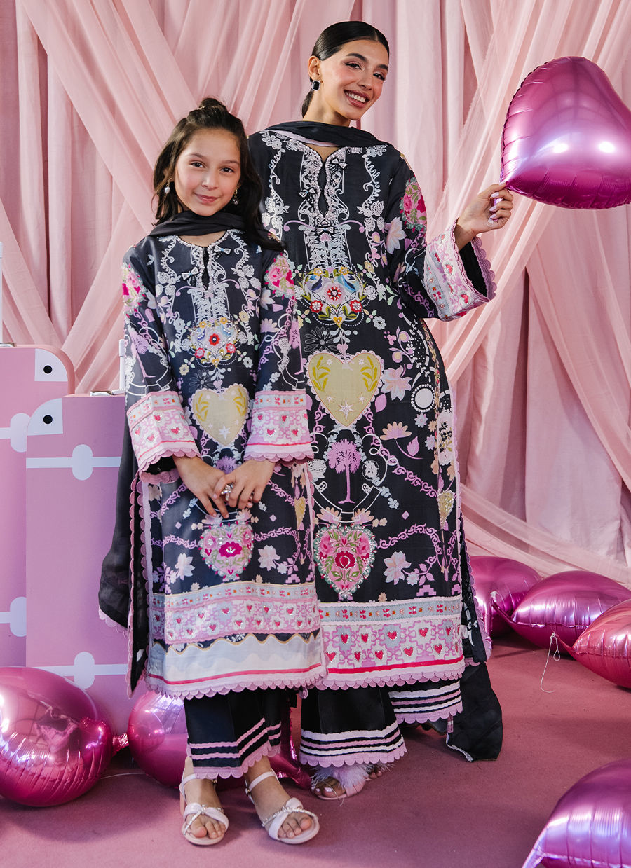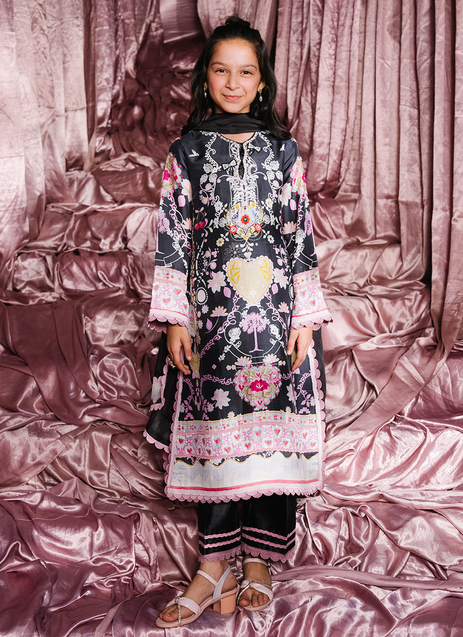 A timeless black long shirt elevated with an embellished neckline, delicately finished with bow details for a touch of understated glamour. Intricate lace detailing adds depth and refinement to the silhouette, enhancing its elegant appeal. Paired with a medium silk dupatta featuring a printed border and lace accents, the look is completed with luxurious sheesha silk pants adorned with subtle lace detailing. A classic ensemble that blends sophistication with modern femininity.