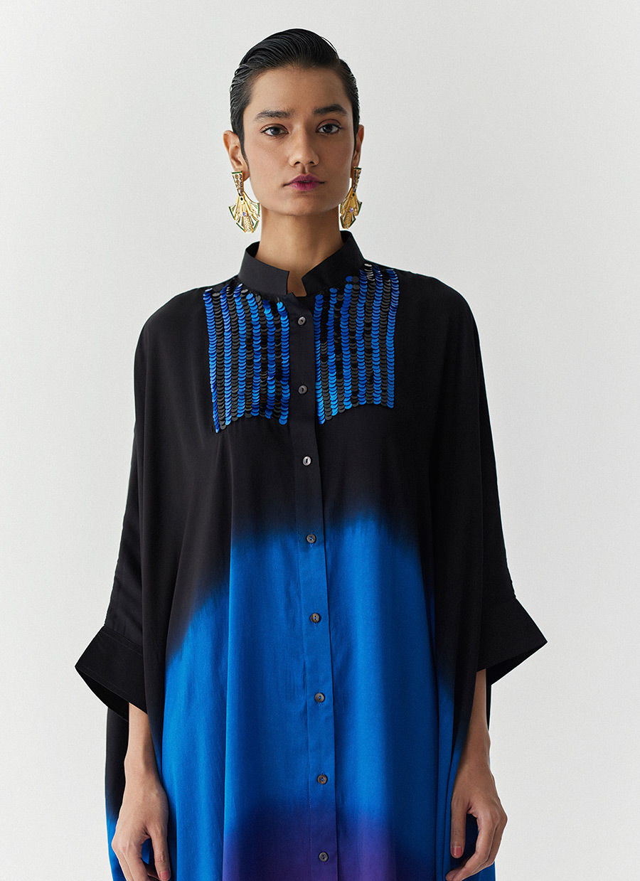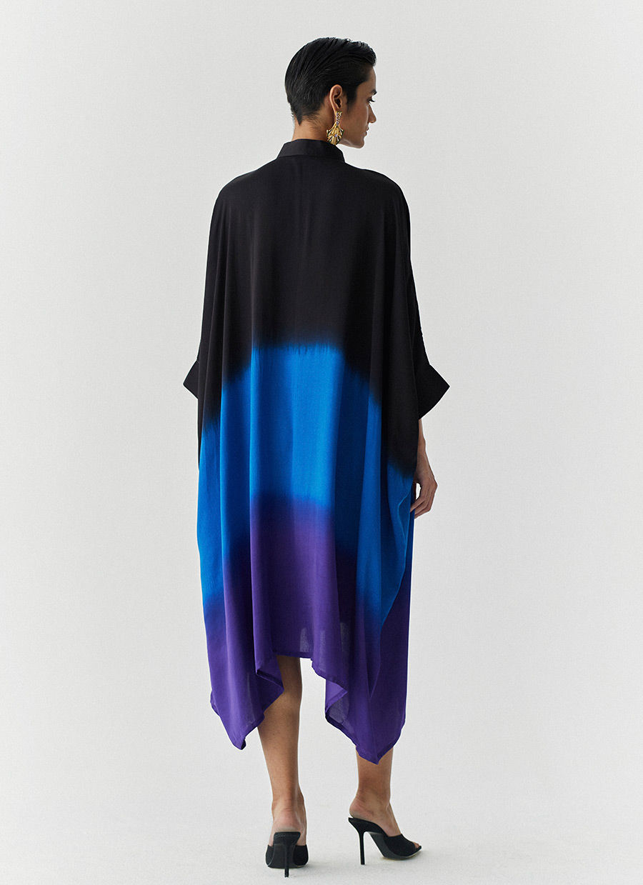 The Thames Kimono crafted from our stunning Vegan silk fabrication, trans-seasonal, is a statement piece. Made in our Signature Ombrè style, this piece is Free Size and has a relaxed fit. Featuring a centre button opening, the dress has hand embroidered sequinned yoke and can be styled in different ways. Wear it with heels for an elegant look.