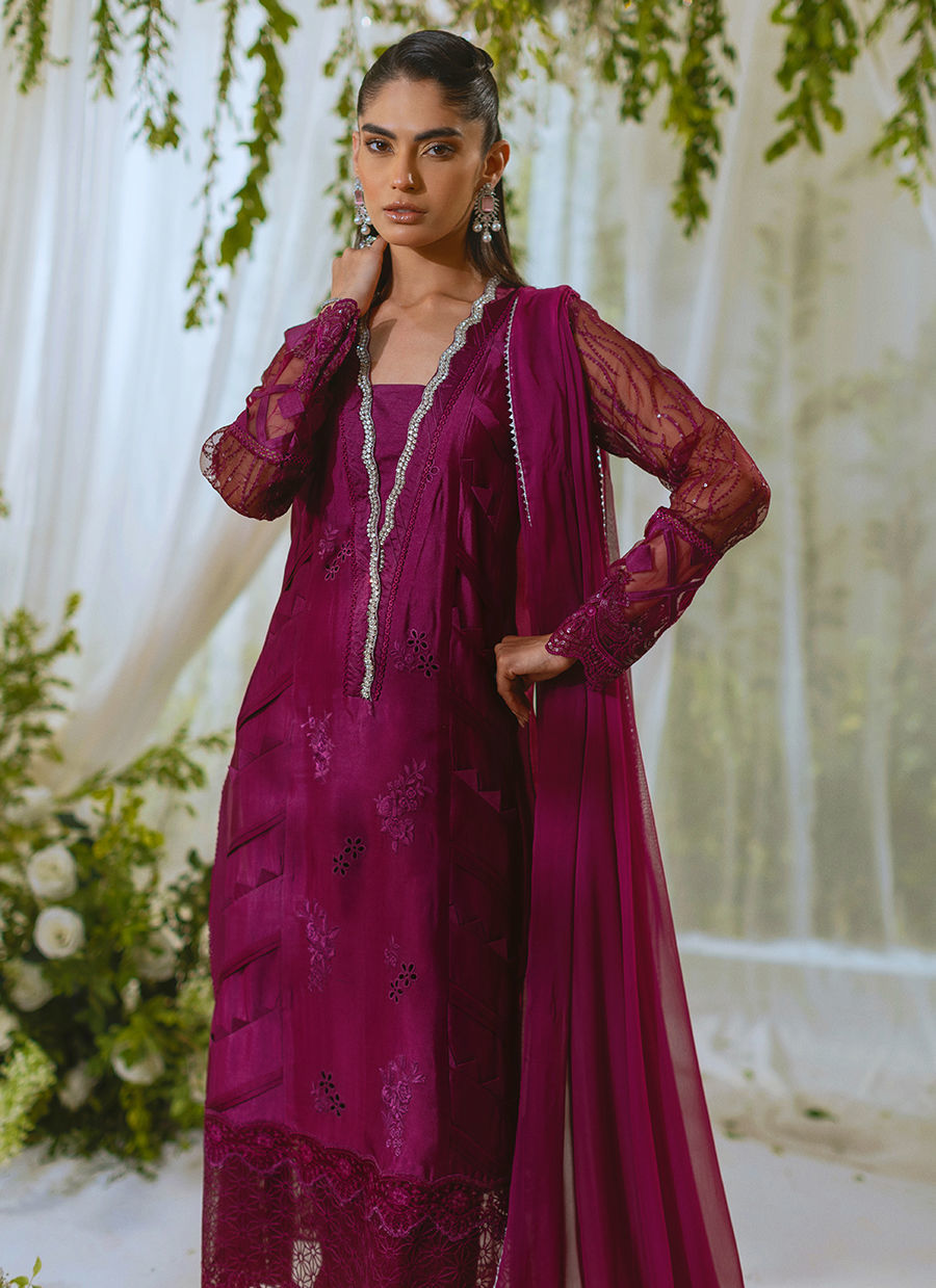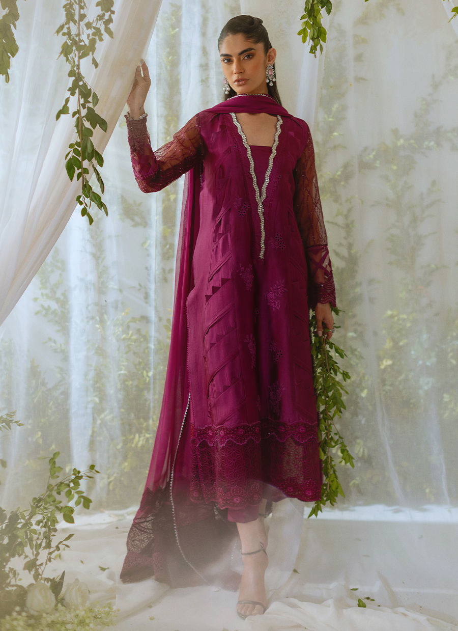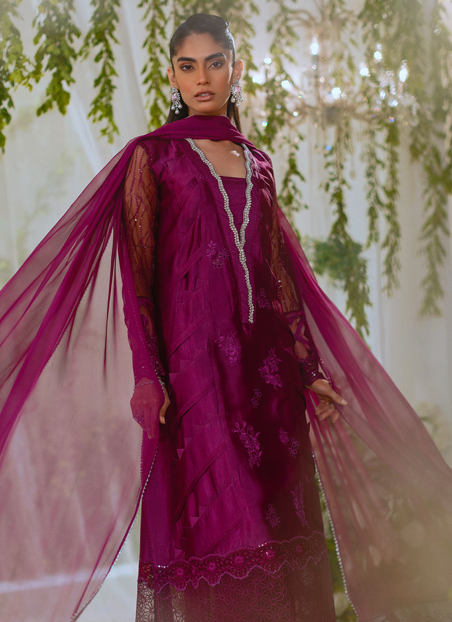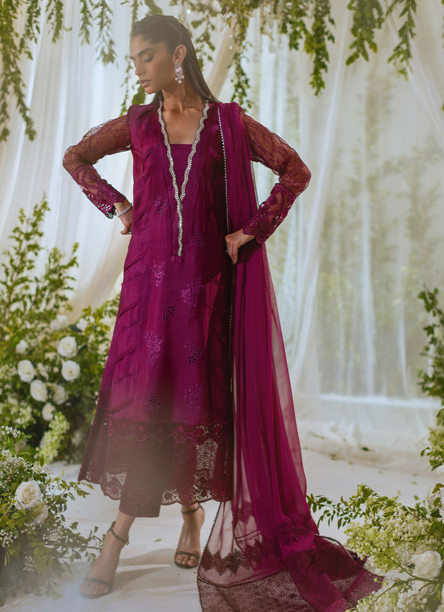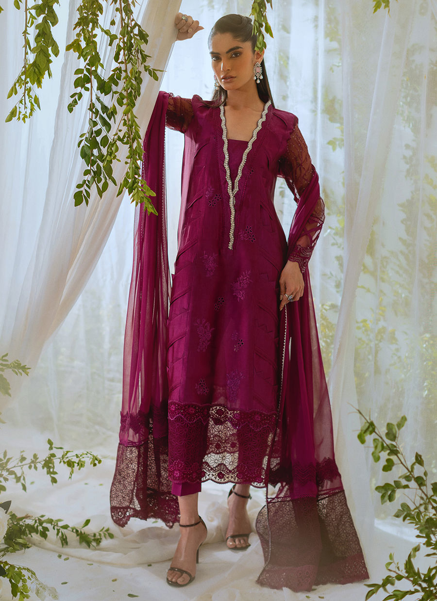 Long silhouette shirt in deepest shade of plum featuring fabric manipulation details on side panels. The neckline is adorned with light catching crystal details. The outfit is paired with signature AA dupatta and matching raw silk pants to turn heads this festive season