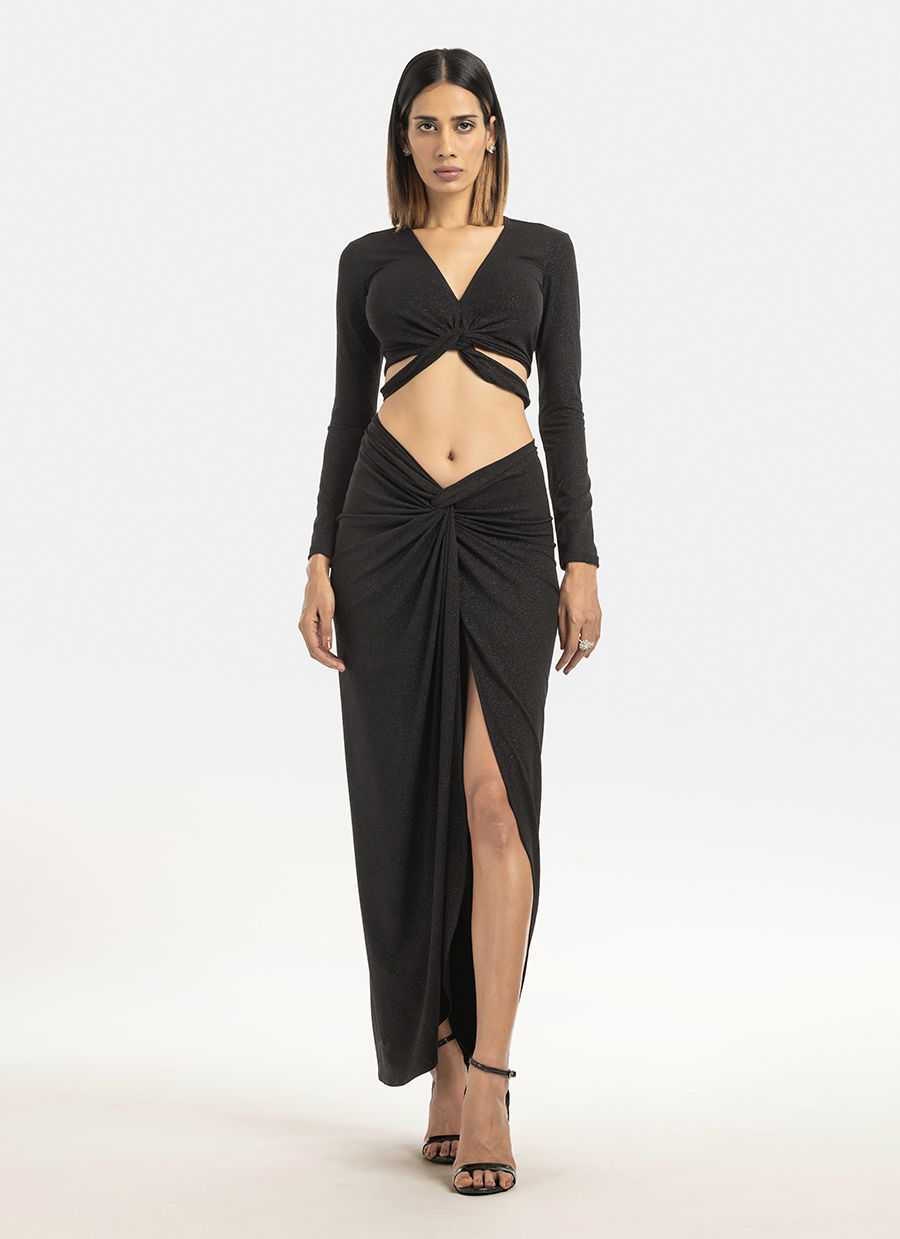 A fitted Tie Up Top in shimmer jersey with a V neck and a tie detail from the front that hooks at the back. You can pair it with our skirts or our sari for a festive look. A draped Shimmer Knot Skirt made in a jersey fabric that shapes the body well. It has a twist detail on the waist and a slit down the hem. It is perfect for a night out.