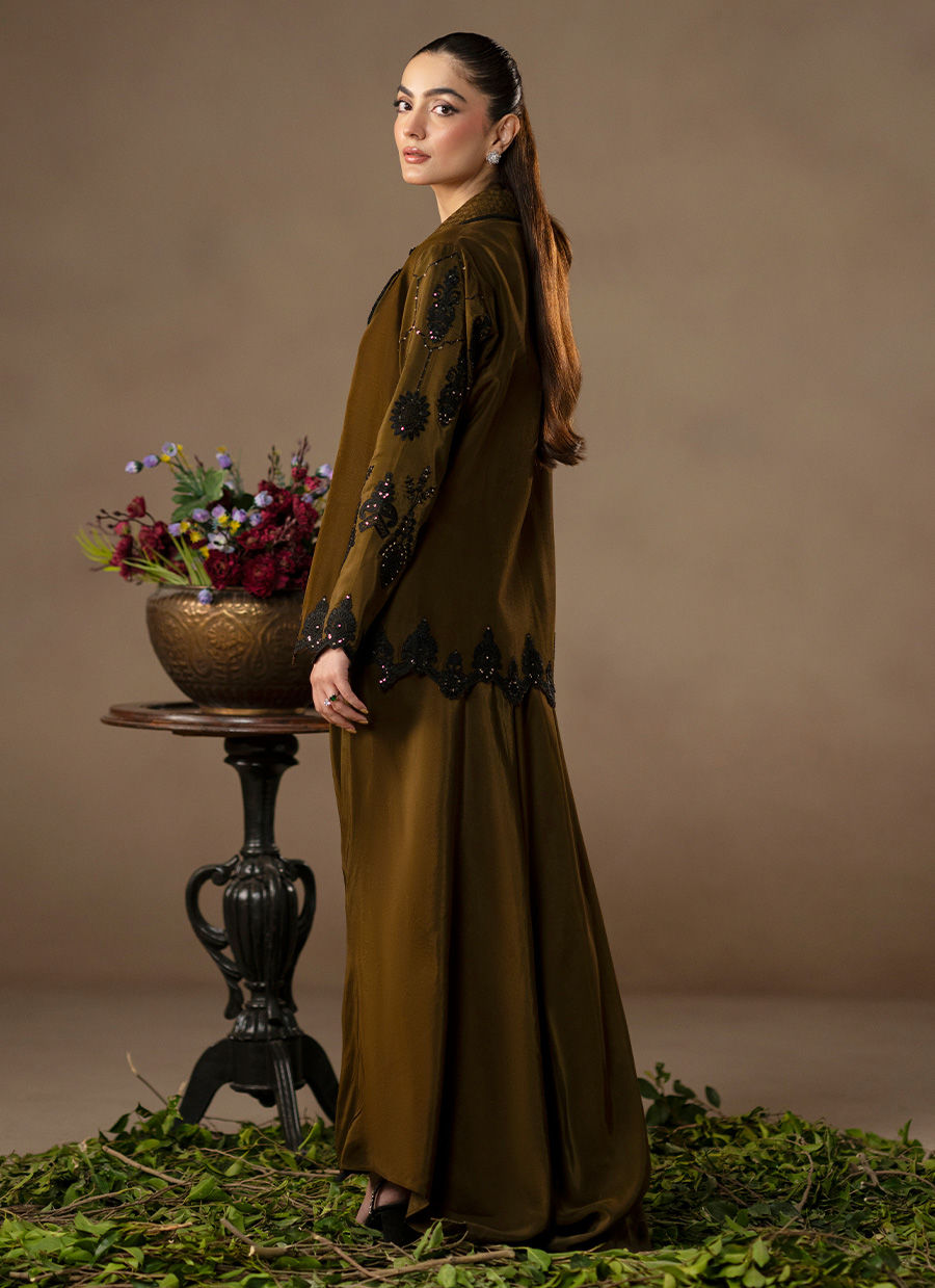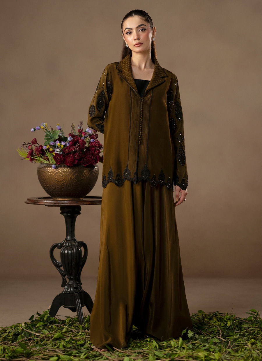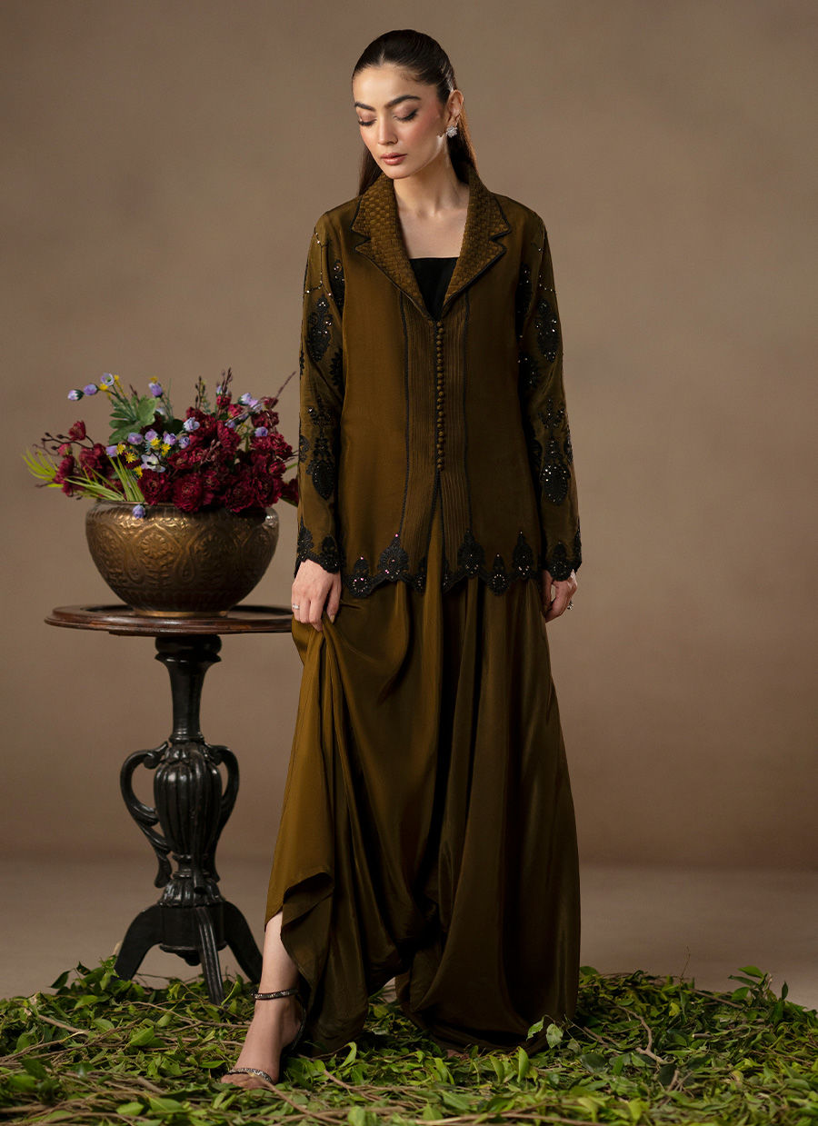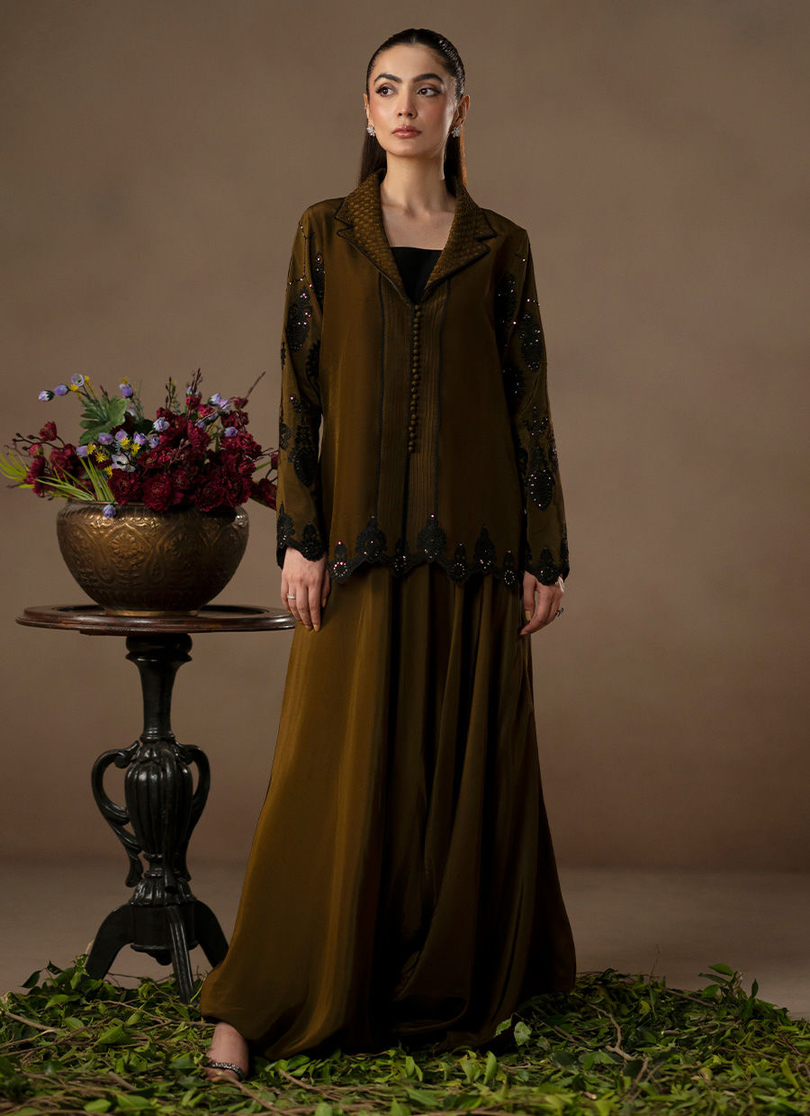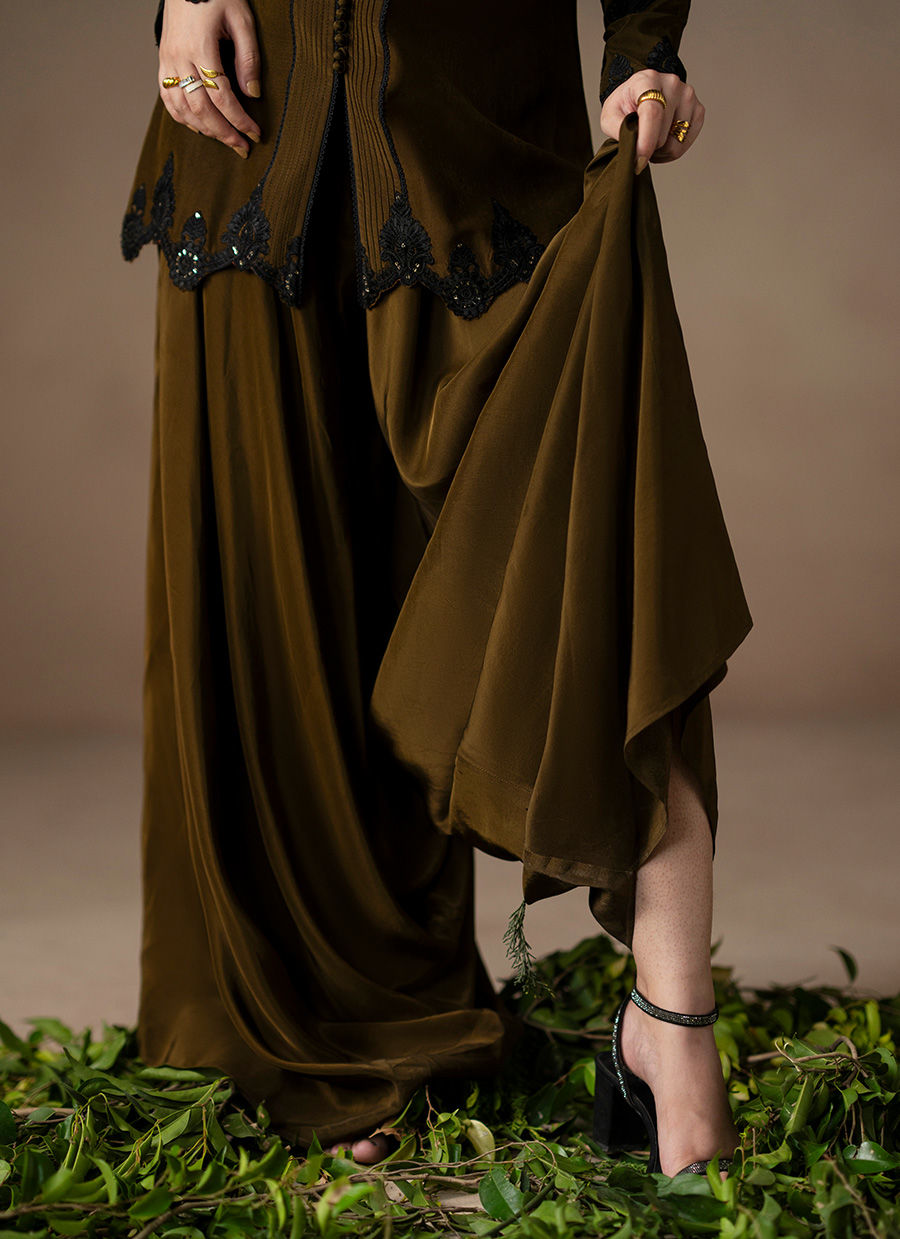 Tailored for chai, built for showing up. For those who prefer their tea plans with a side of edge, the Tiva ensemble serves up just the right mix of structure and fluidity. In a deep moss green, the jacket features a standout lapel, woven in basket weave-like effect and outlined in black thread that leads the eye straight into the details. Embroidery traces the sleeves and hem, while the front fastens neatly with loop buttons. Paired with matching flared trousers, this look is all presence without ever raising its voice.