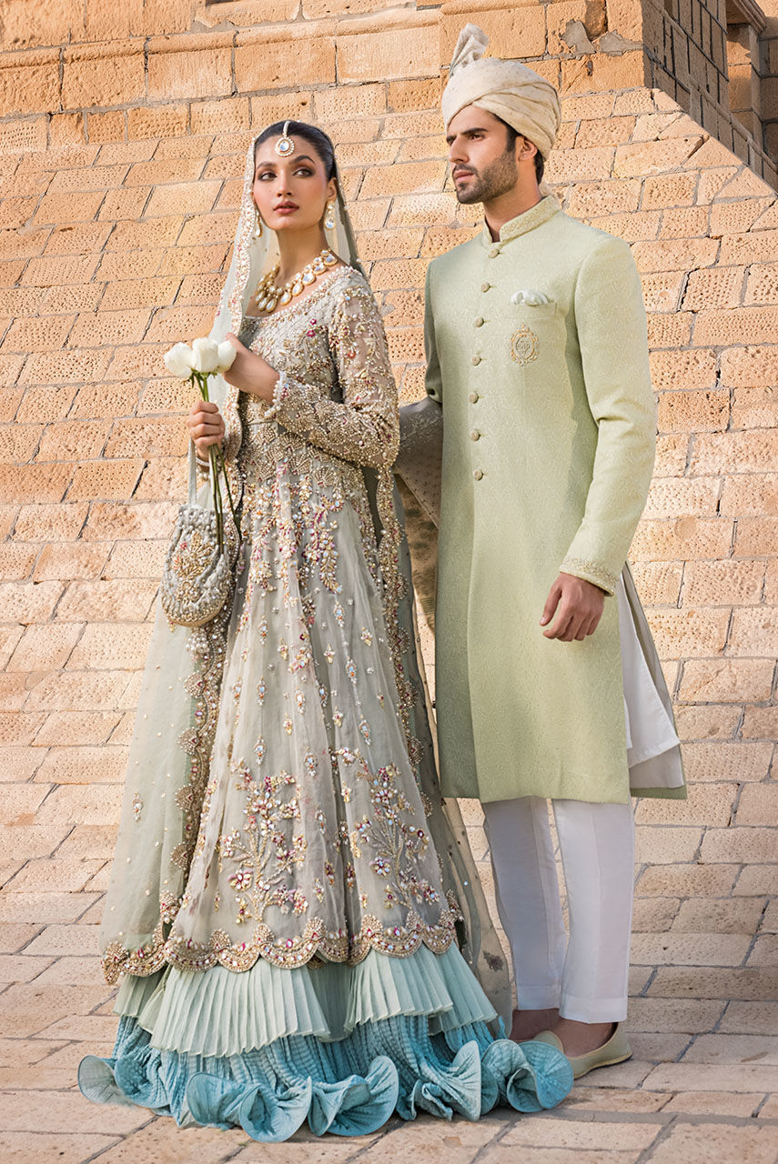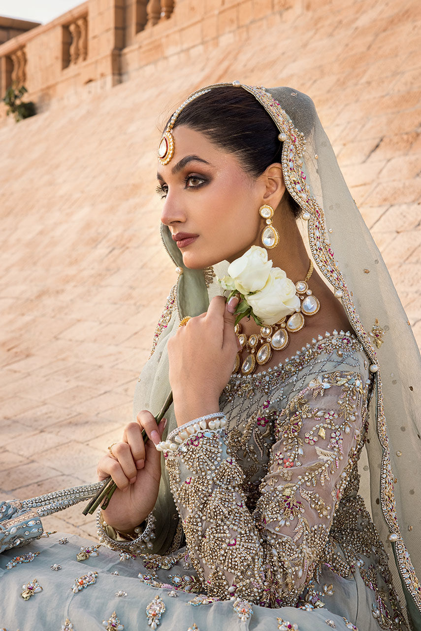 On the wedding day, our bride wants something which can relate to her devotion of heart and her spirit of soul something that brings more light out of her. This is a beautifully embellished mint blue organza dress having decorated motifs of buds and vines in the materials of traditional embroidery such as resham, zardozi, and stones. The crushed fabric with pleated organza circles under the dress gives off more volume and length to the figure. This bride is not urging additional attention she knows who she is and she shines brightly like a diamond.