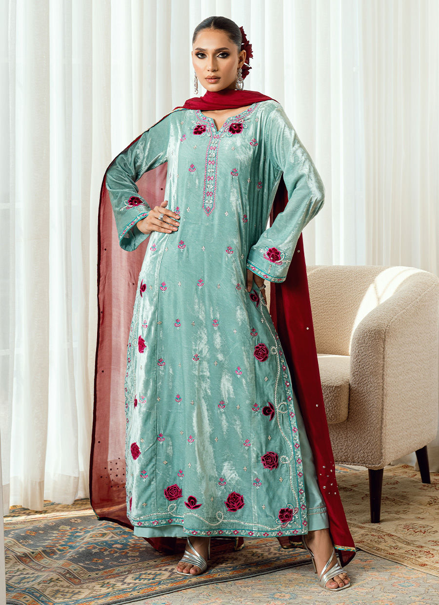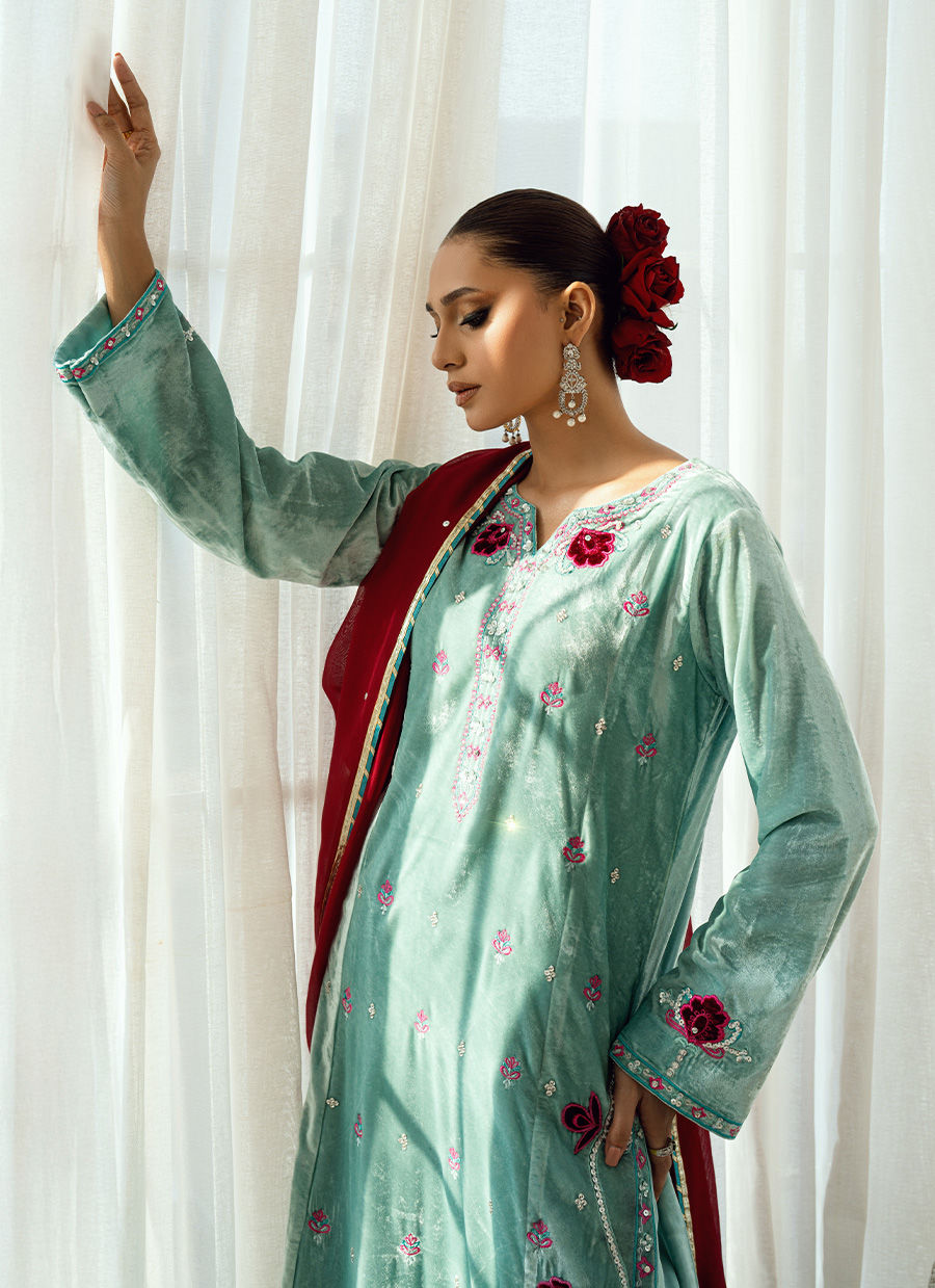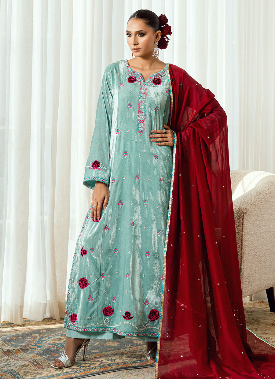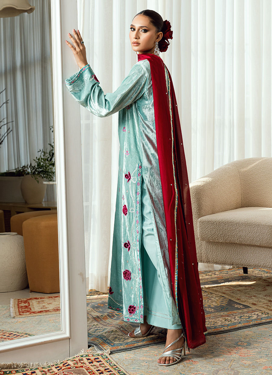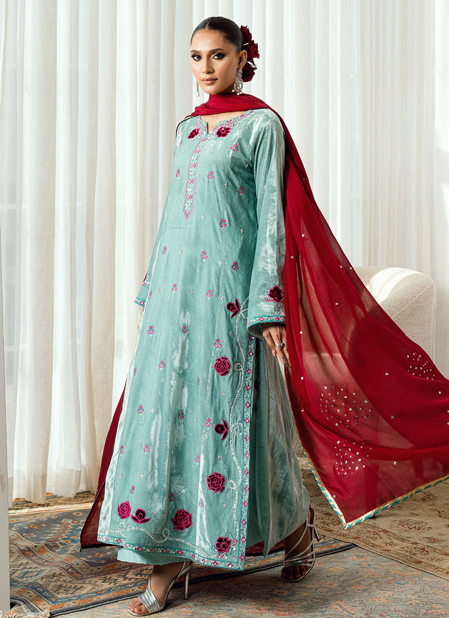 A vision of contrast and couture artistry, Twilight Rose captures the magic of dusk—where serenity meets vibrance. The ensemble is rendered in a soft light blue base, exquisitely adorned with hot pink velvet appliqués and rose-inspired detailing that create a stunning interplay of color and texture. The hot pink silk dupatta, light yet commanding, adds a bold flourish against the calm blue canvas, transforming the look into a statement of modern femininity. Each applique is placed with precision, lending depth and dimension to the silhouette—delicate yet daring, refined yet radiant. Paired with matching trousers for balance, Twilight Rose stands as a symbol of elite elegance and contemporary artistry, perfect for evening soirées and festive occasions that call for effortless grace with a touch of bold charm.