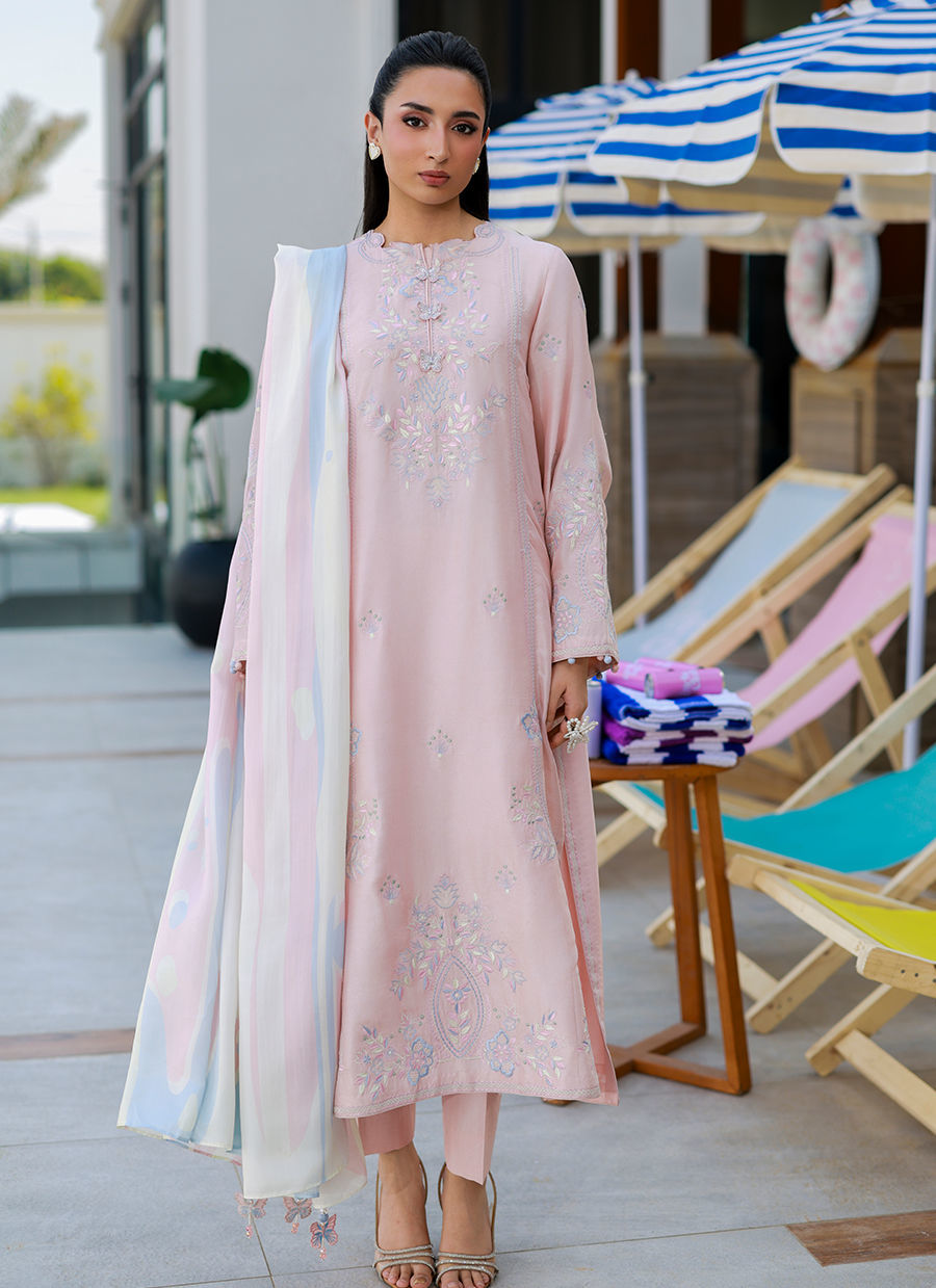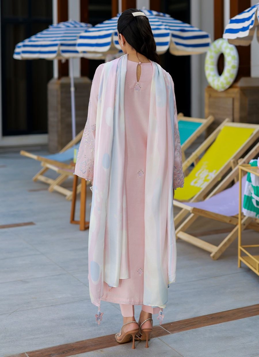 Pink raw silk long shirt with flowing bell sleeves, brought to life with delicate periwinkle, ivory, and pink embroidery. The cutwork neckline, adorned with whimsical butterfly buttons, adds a touch of artisanal charm. Styled with raw silk straight pants and a printed medium silk dupatta, this ensemble effortlessly balances modern elegance with poetic craftsmanship.