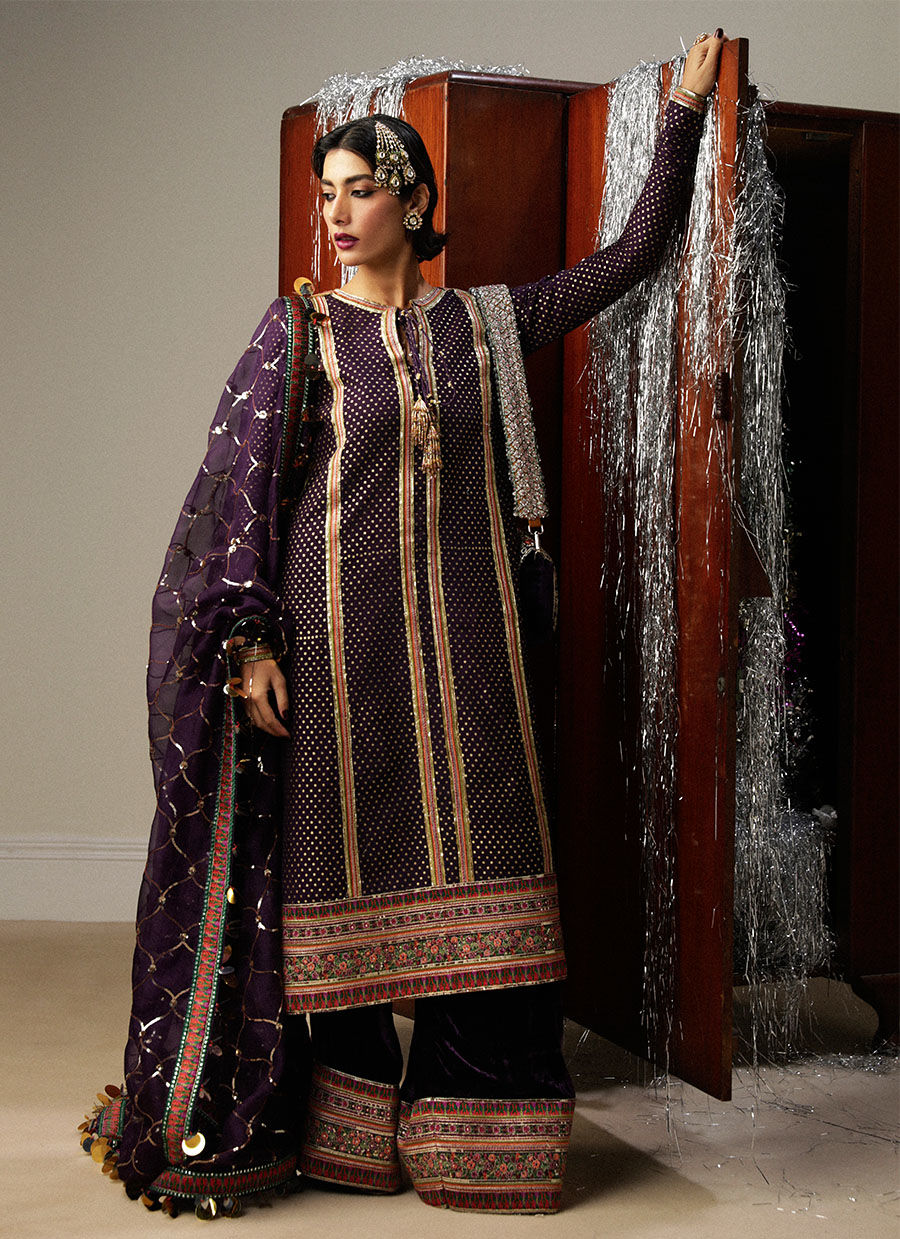 A chic deep purple shirt with delicately embroidered and embellished hem and inserts with gold polka dots printed all over. And it is then paired with this gorgeous shalwar and organza duppatta with sequined jaal over. This outfit surely is a vision of beauty and grace.