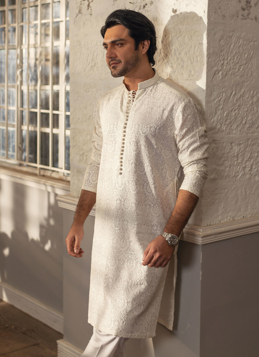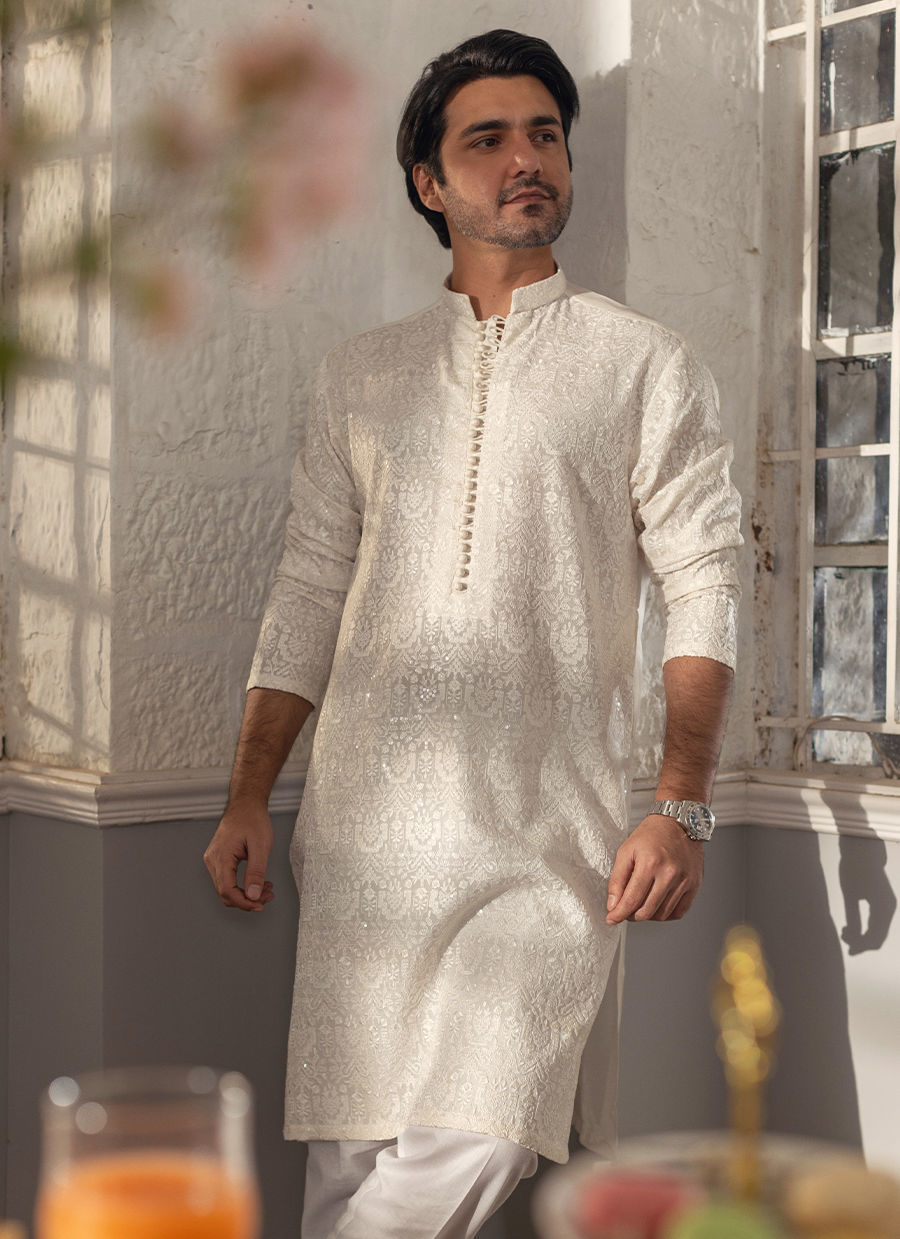 Embroidered raw silk kurta in elegant white featuring self-pattern details adorned with light catching sequins.The neckline is accentuated with loop buttons and the kurta can be elegantly paired with straight white pants to complete the ensemble.