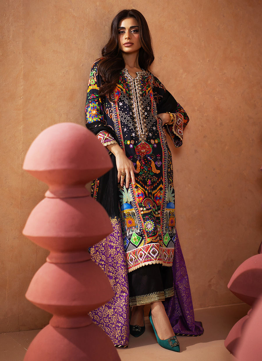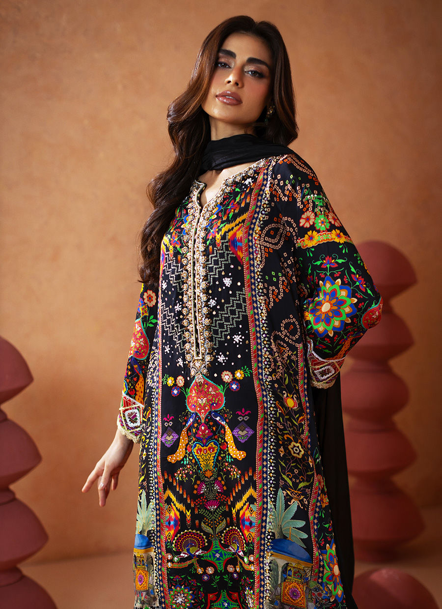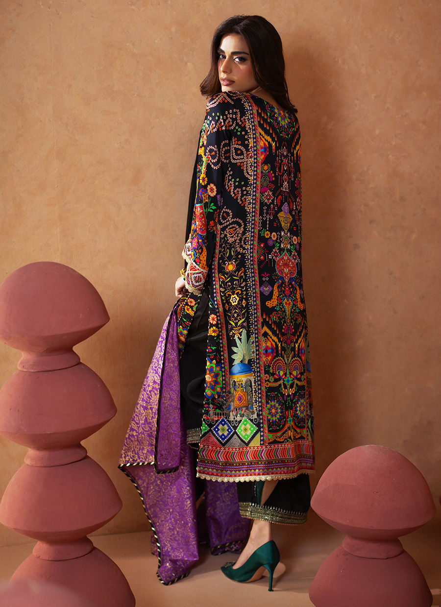 A-Line shirt presented in a myriad of eye-catching colors, showcasing intricate zardozi embellishments on the neckline. The hem of the shirt is accentuated with gota detailing. This ensemble is complemented by an ombré silk dupatta in black and deep lilac, adorned with hand block-printed gold accents, and is accompanied by a matching izaar featuring aari embroidery along the hemline.