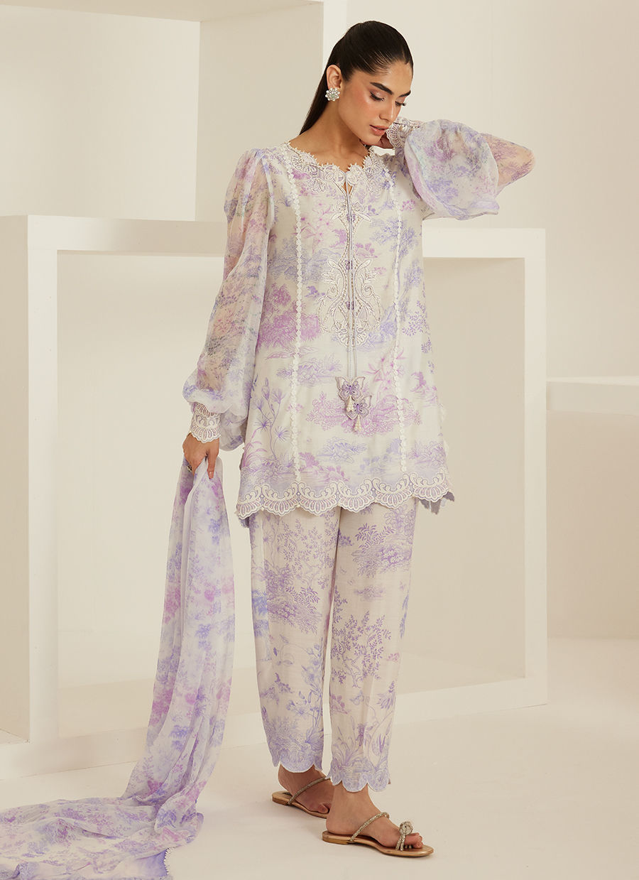 The silhouette flows gently, enhanced by a finely detailed neckline and delicate lace accents that add a touch of femininity. Sheer sleeves bring a sense of softness and movement, while the overall composition remains light and balanced. Paired with a fluid dupatta and coordinating printed pants, the ensemble feels complete — airy, elegant, and timeless.