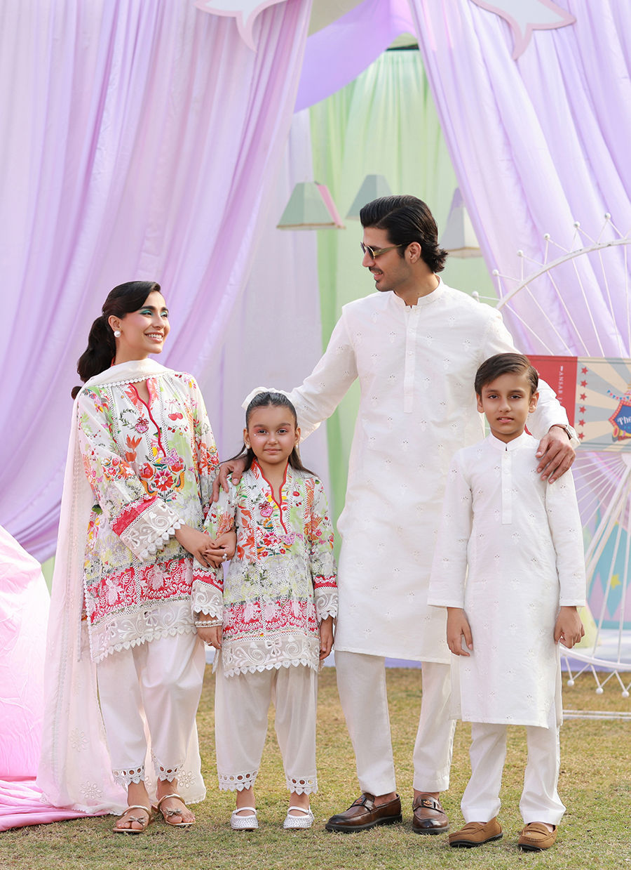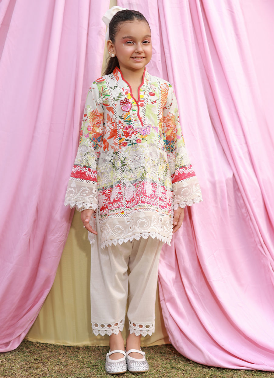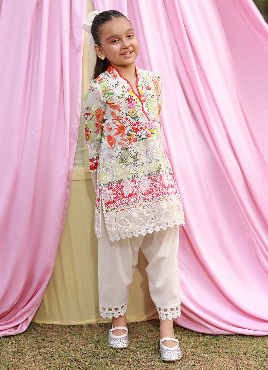 Short white schiffli kurta with a playful multicolor print, featuring delicate cutwork embroidery on the sleeves and hem. The neckline is accented with charming heart-shaped buttery embellishment buttons. Paired with a white shalwar with cutwork lace and a medium silk white dupatta with lace edging, creating a fresh and elegant ensemble.
