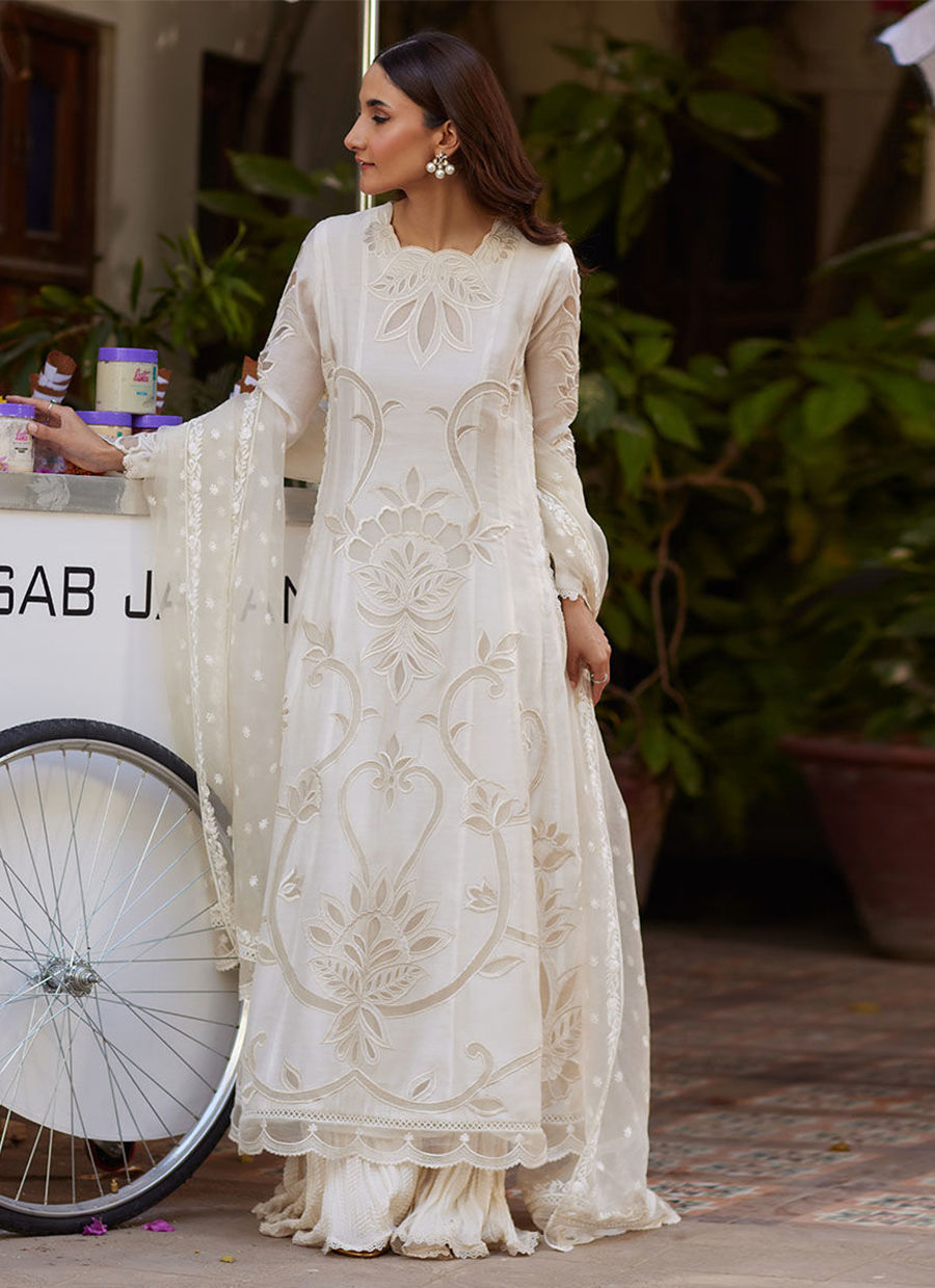 A pristine white-on-white kalidaar, featuring exquisite organza and resham appliqué detailing for a truly refined look. Paired with an intricately embroidered organza dupatta, and complemented by crushed dhaaka for an elegant, textured finish.