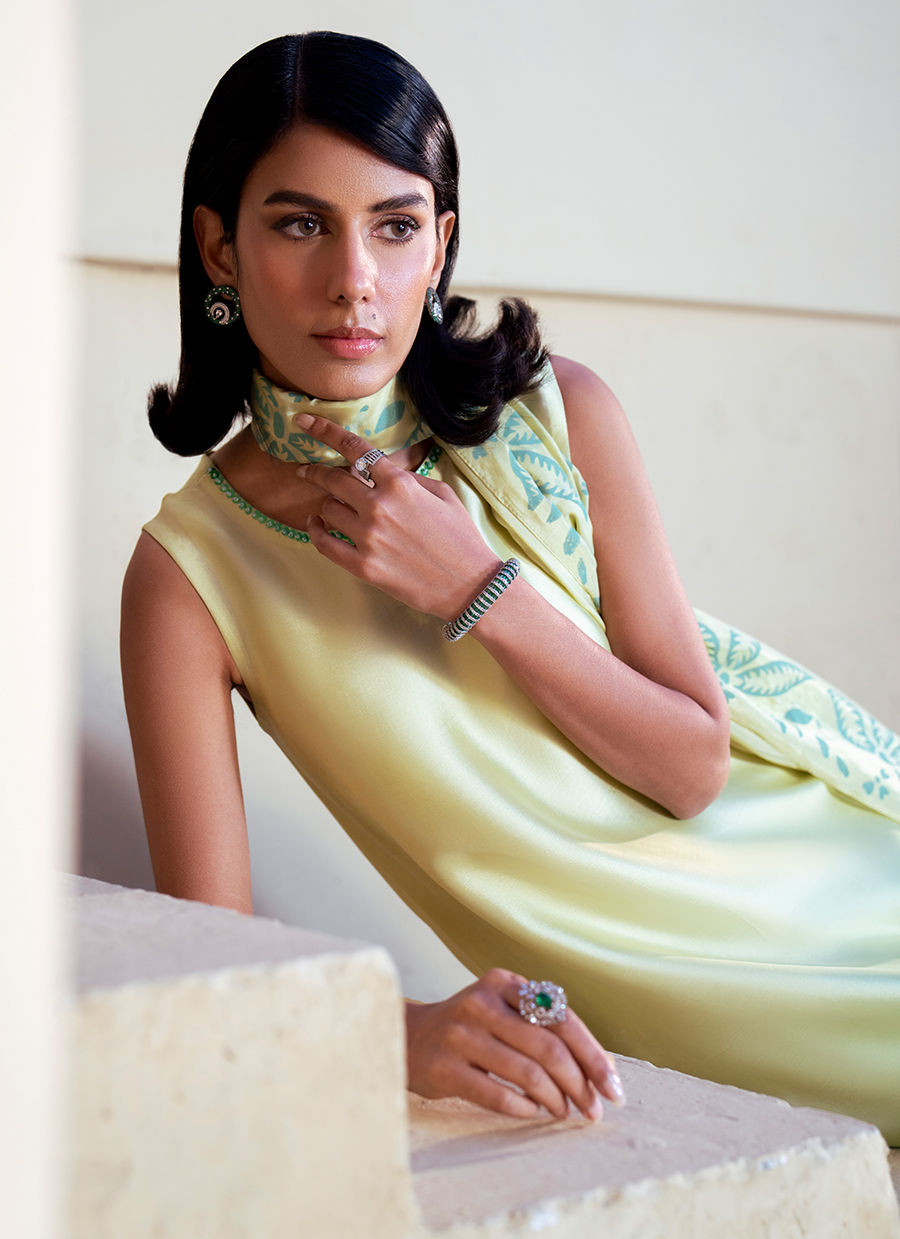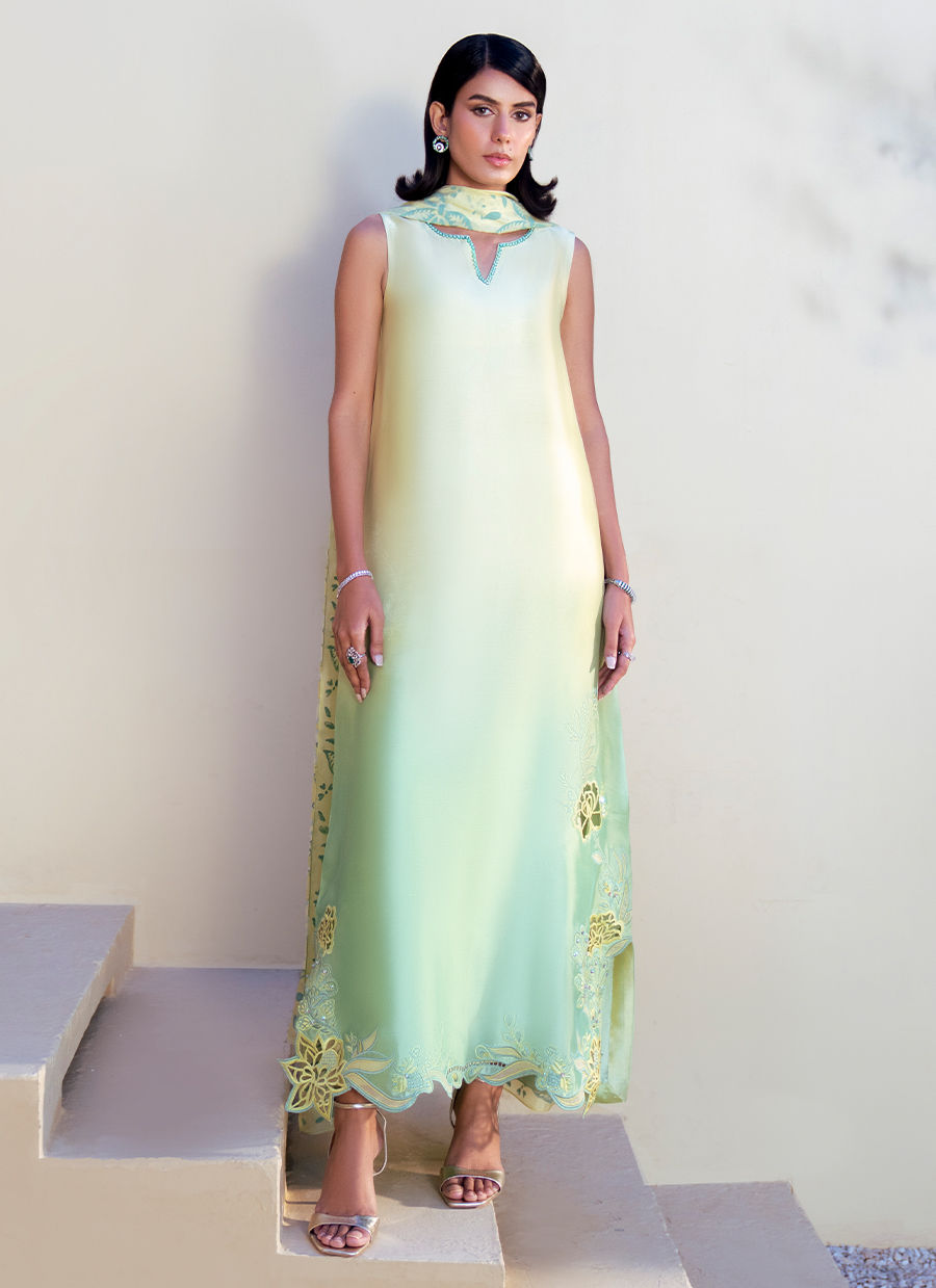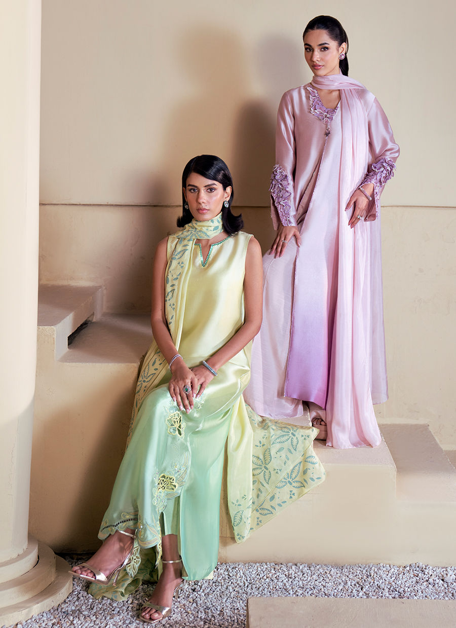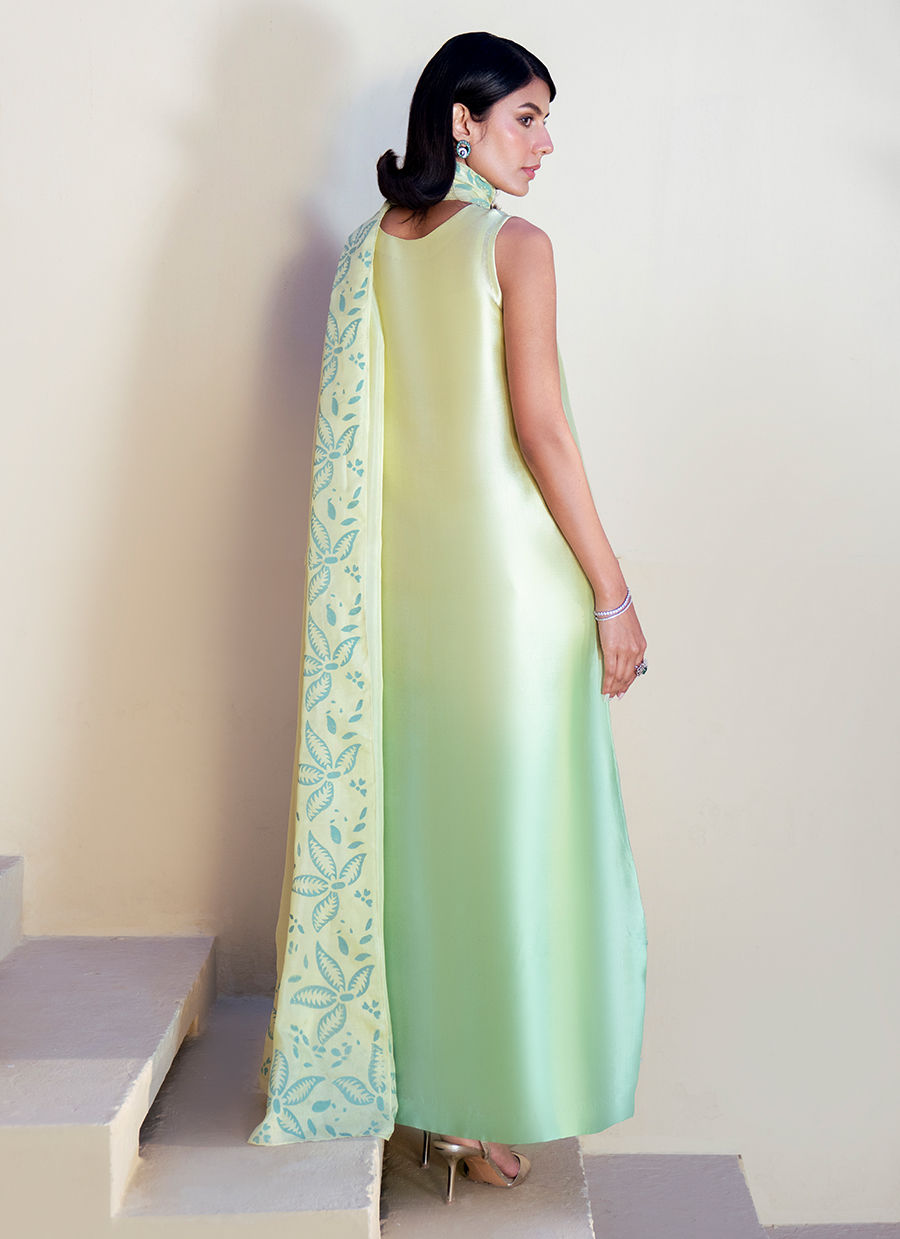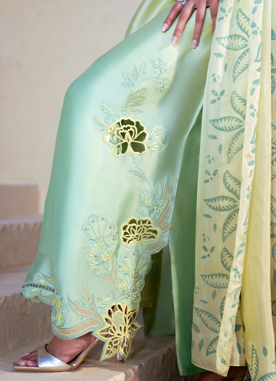 This flowing ombre silk shirt, blending soft yellow into green, is a statement of refined elegance. The neckline is kept minimal and composed, allowing the artistry of the garment to shine. Along the hemline, a graceful floral appliqué pattern unfolds, enriched with cutwork and resham outlines, balanced with delicate embellishment for a sophisticated finish.The silk dupatta complements the kaftan with block‑printed floral and leafy motifs, harmonizing the contrasting tones of mint yellow and mint green. Paired with silk trousers, the ensemble embodies a perfect fusion of heritage craftsmanship and contemporary luxury, ideal for festive and formal occasions.
