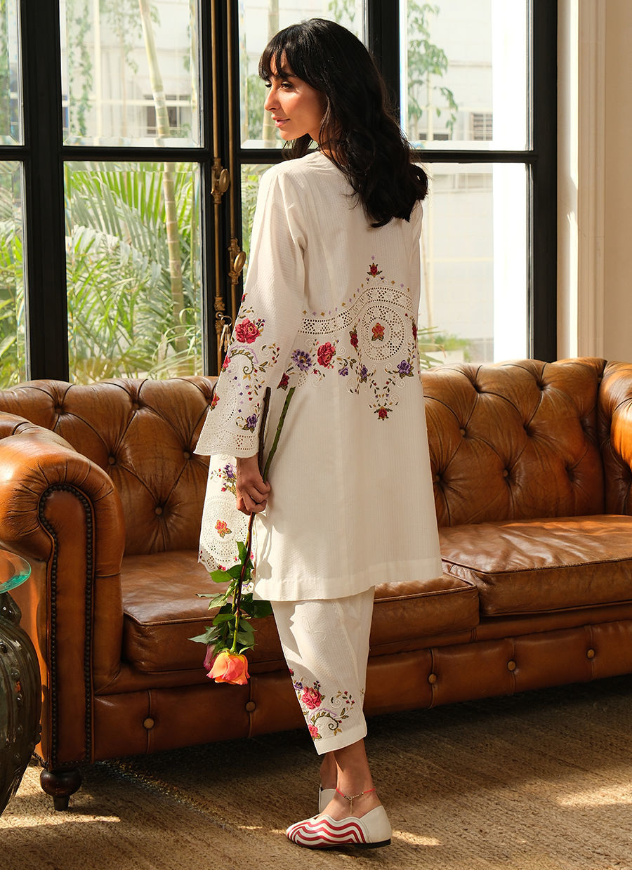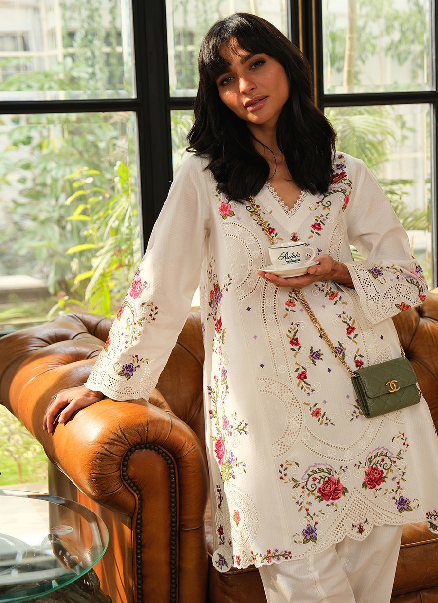 “An elegant pure cotton co-ord inspired by timeless craftsmanship, featuring intricate cross-stitch floral embroidery and cutwork detailing. Finished with delicate scalloped edges and coordinated embroidered shalwar, this ensemble blends artisanal charm with effortless comfort—perfect for graceful Ramadan days and beyond.”
