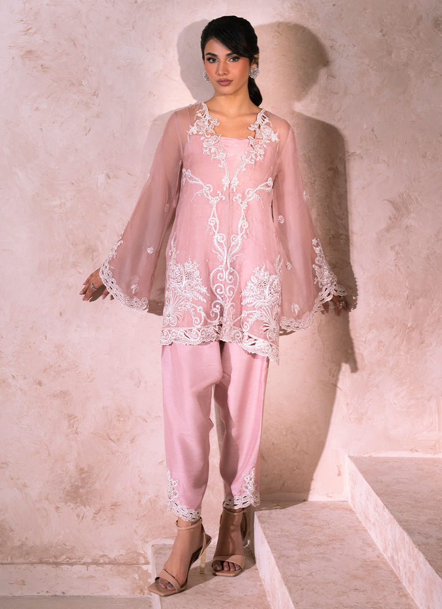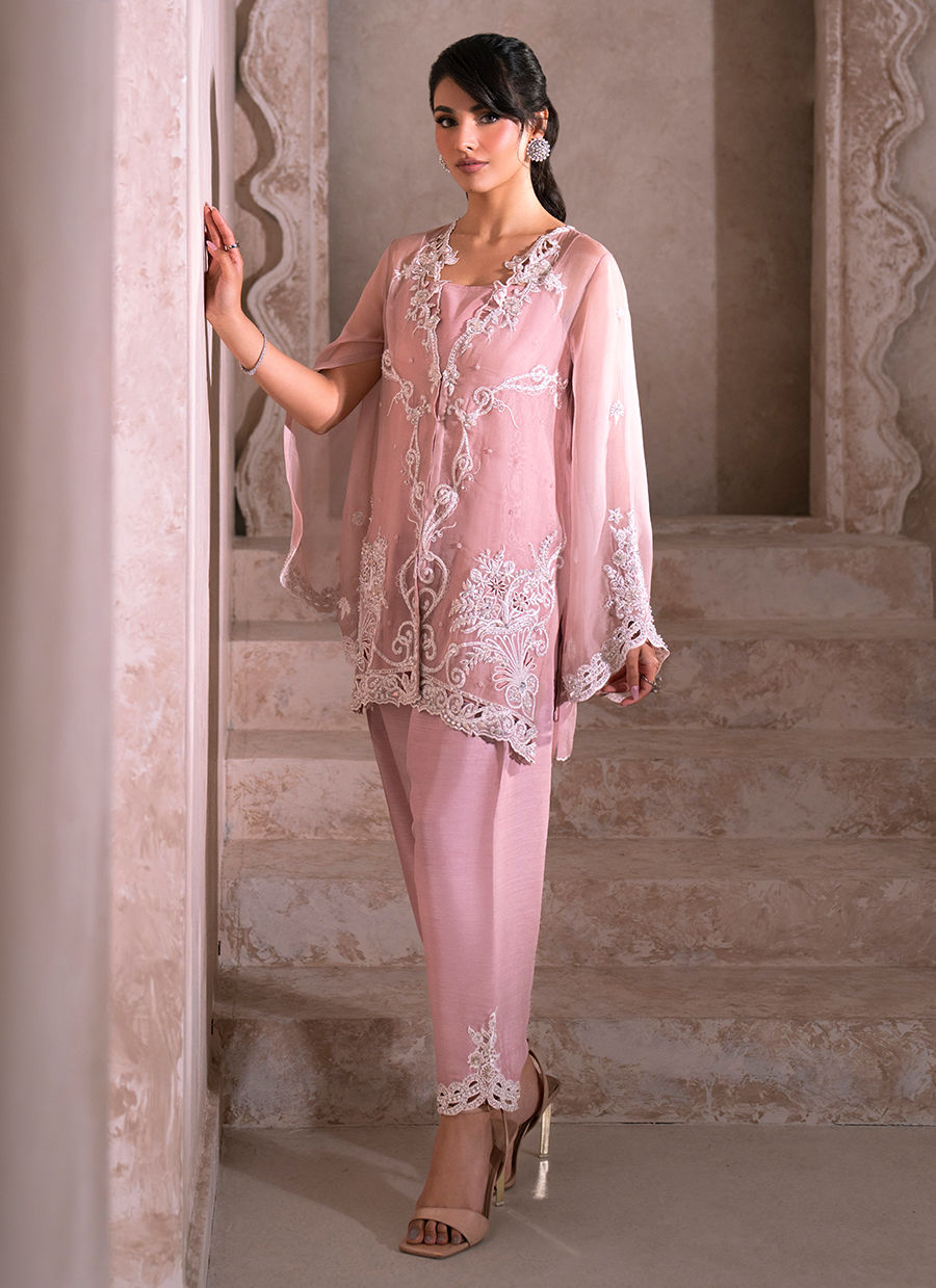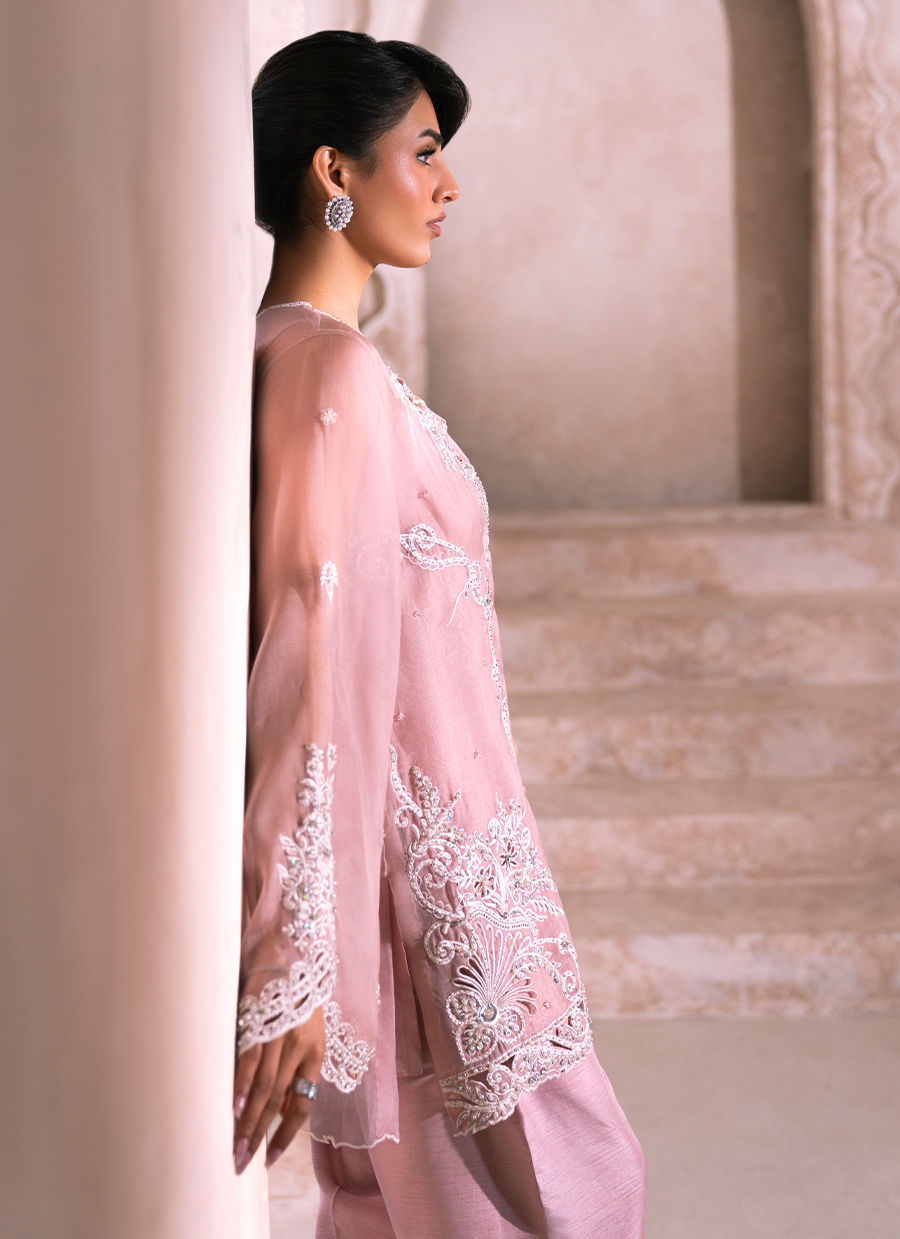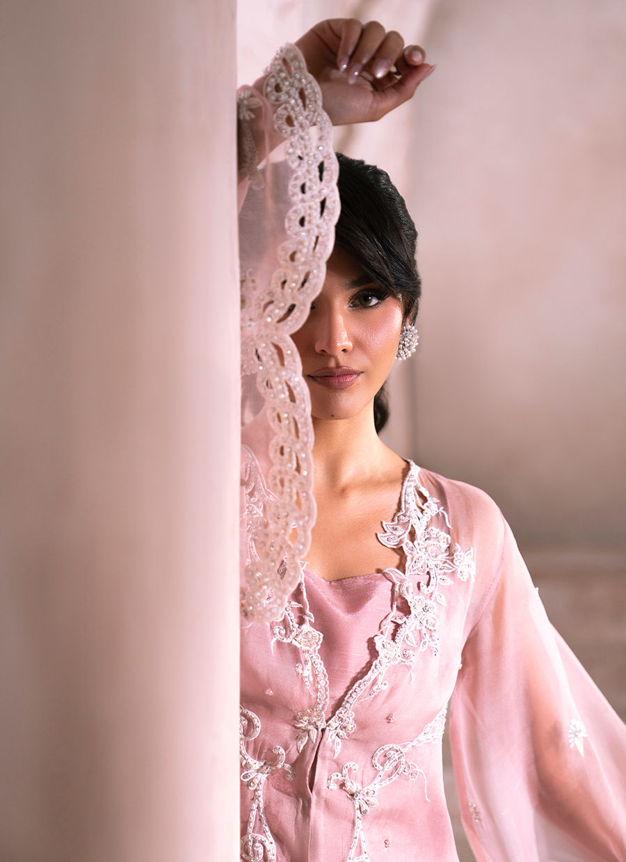 An old rose organza short jacket, exquisitely adorned with delicate white floral motifs that gracefully cascade across the jacket panels, flowing from the neckline down to the hem. The surface is softly illuminated with a refined spray of sequins and beads, while intricate resham embroidery and crystal craftsmanship enhance the piece with subtle opulence. Meticulously detailed cutwork adds depth and finesse, perfectly balanced to maintain an airy elegance. The bell sleeves are beautifully embellished with floral motifs and finished with intricate cutwork at the hems, reinforcing the jacket’s artisanal character. Paired with a silk inner slip for effortless structure, the ensemble may be complemented with an optional shalwar featuring an embellished hem with cutwork and resham crystal detailing. A coordinating dupatta is available as an add-on, completing the look with timeless sophistication and couture refinement.