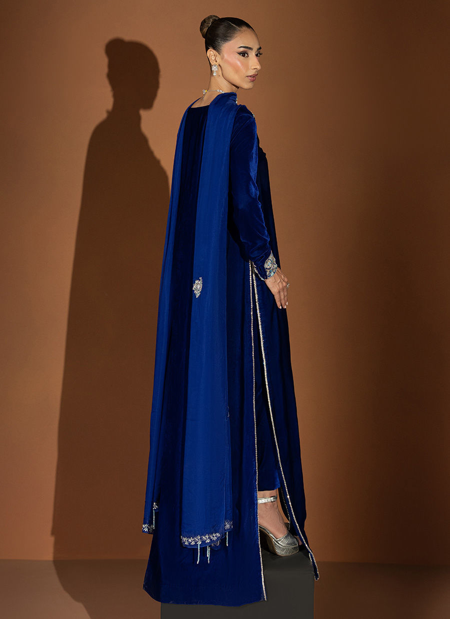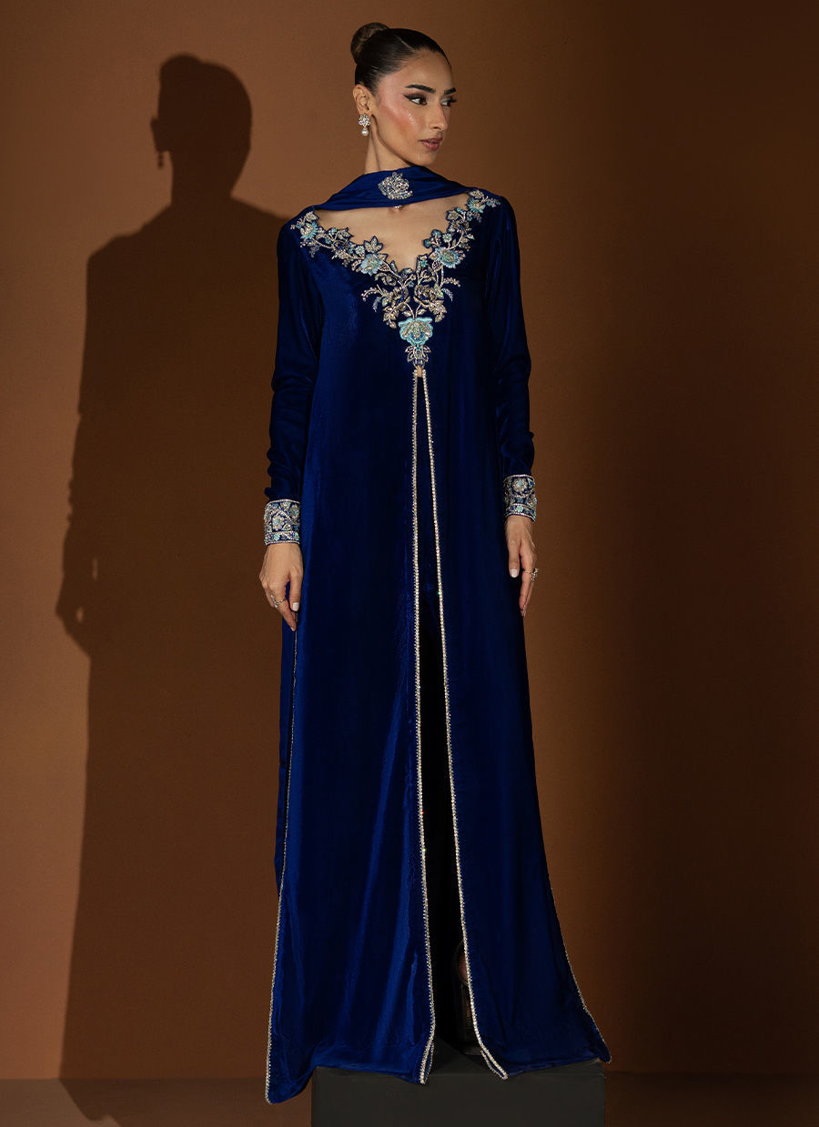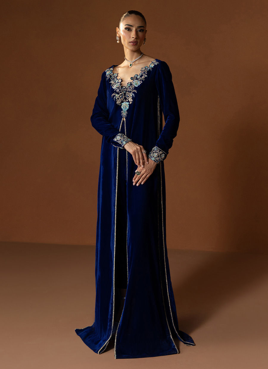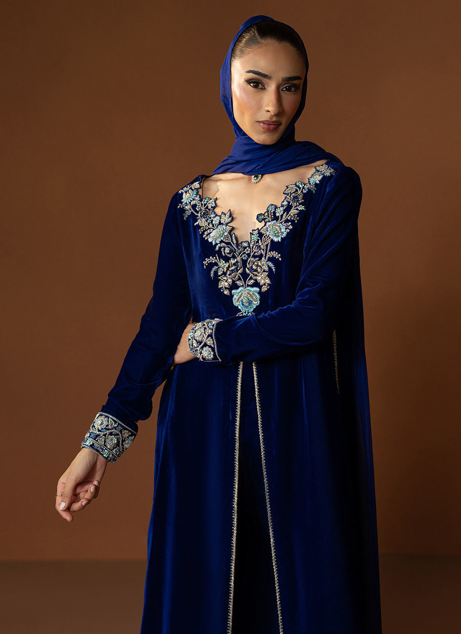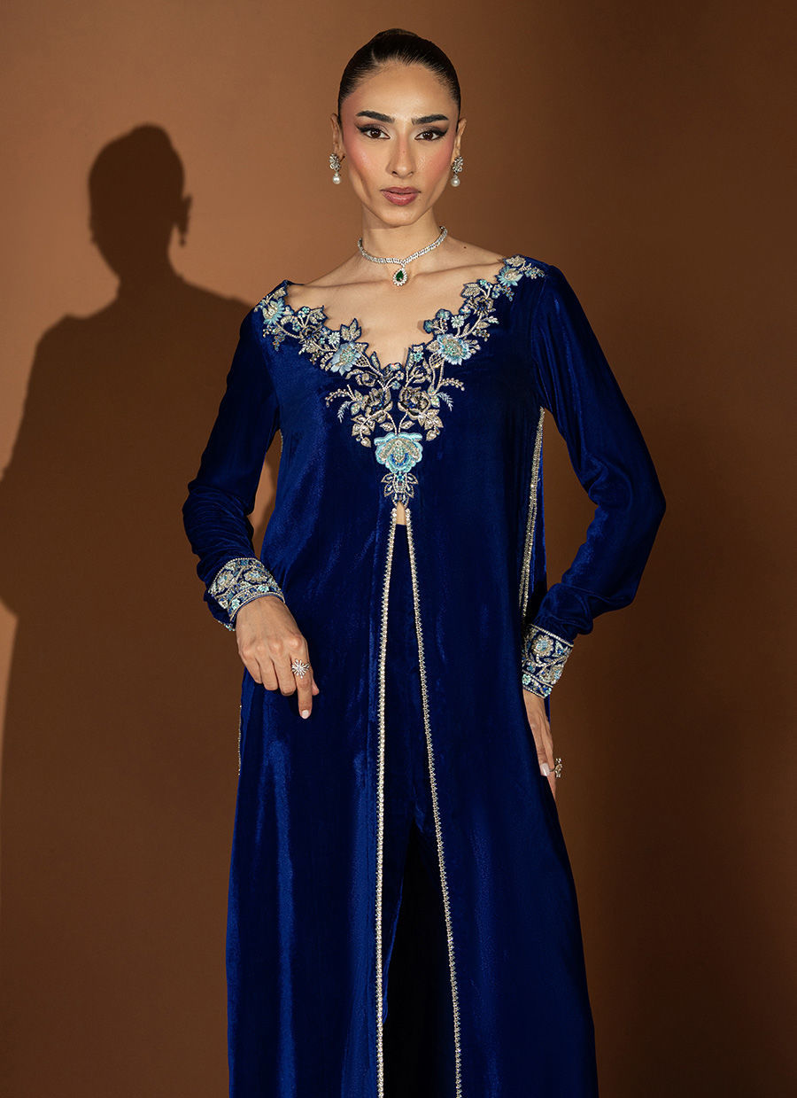 In a serene royal hue of blue, this velvet outfit speaks of quiet grace. The long front-open shirt is detailed with delicate cutwork floral detailing along the neckline and refined accents on the cuffs, creating a look of effortless grace. Paired with sleek cigarette pants, Vionna is a timeless expression of true elegance.