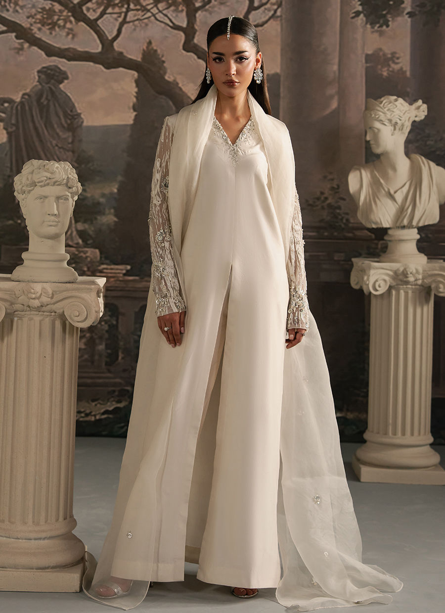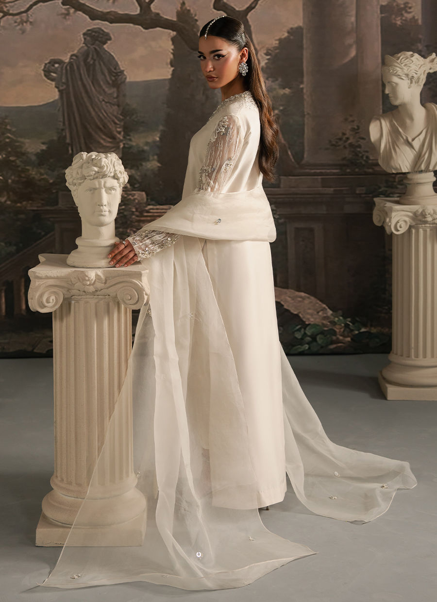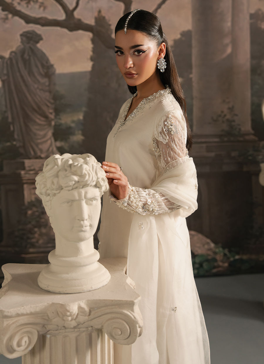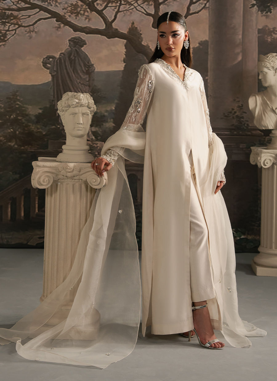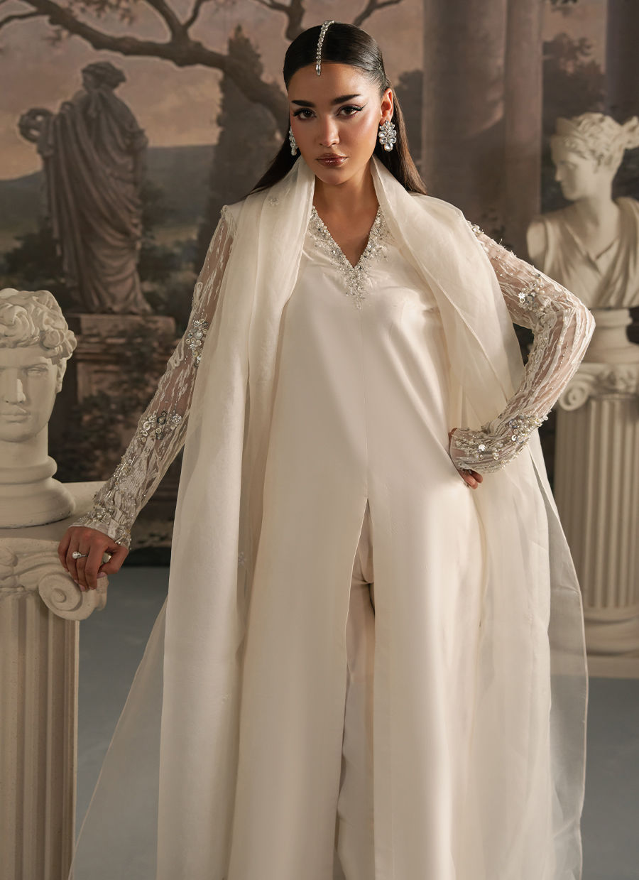 Vittoria is timeless sophistication with a three-paneled long shirt, refined with delicate detailing on the neckline and cuffs. Paired with sleek straight pants and an organza dupatta finished with intricate spray work, the silhouette embodies graceful elegance. Adorned with intricate hand embellishments of pearls, beads, cut dana, and silver chains, the ensemble strikes the perfect balance between refined artistry and luxurious allure.