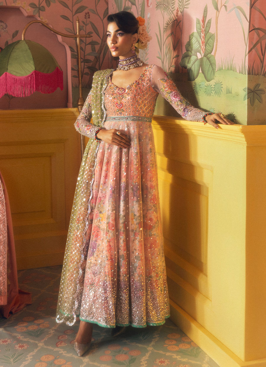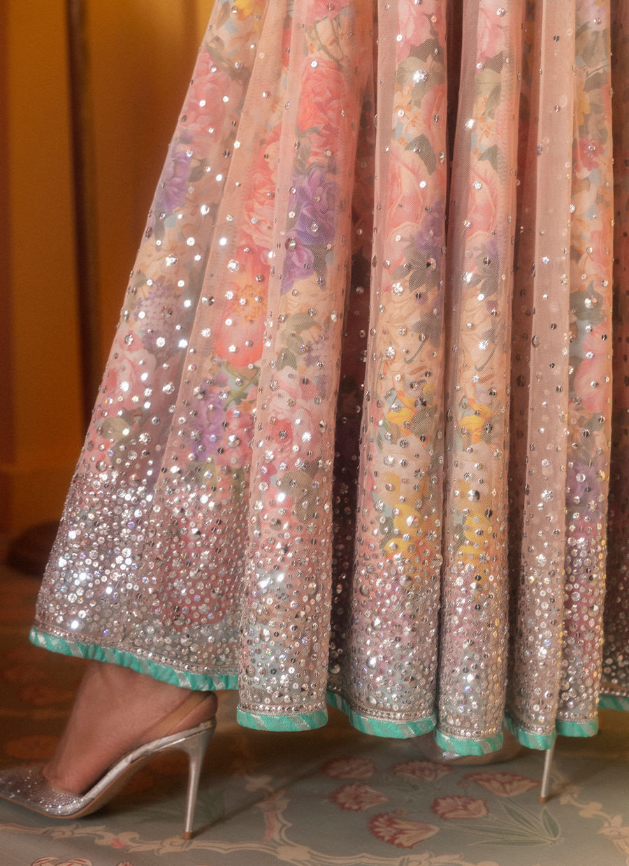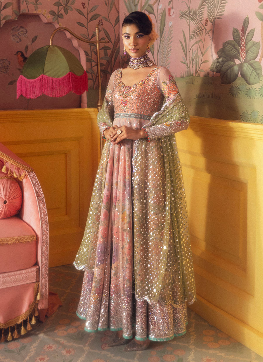 A classy pastel peshwas, featuring multi-coloured soft hues and intricate sequin work, perfect for daytime weddings and celebrations.
