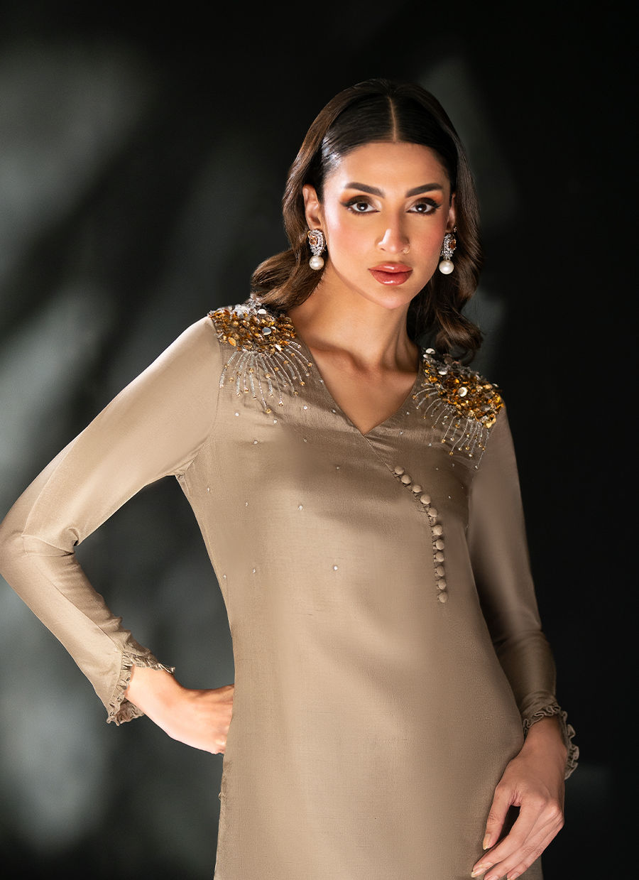 A dull gold raw silk front-open shirt adorned with subtle silver and golden sequin work on the shoulders, paired with sleek straight pants — understated, graceful, and effortlessly refined.