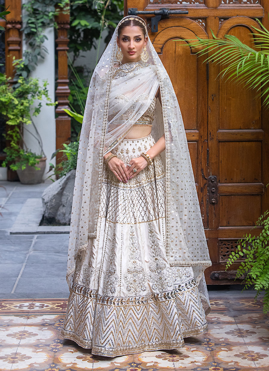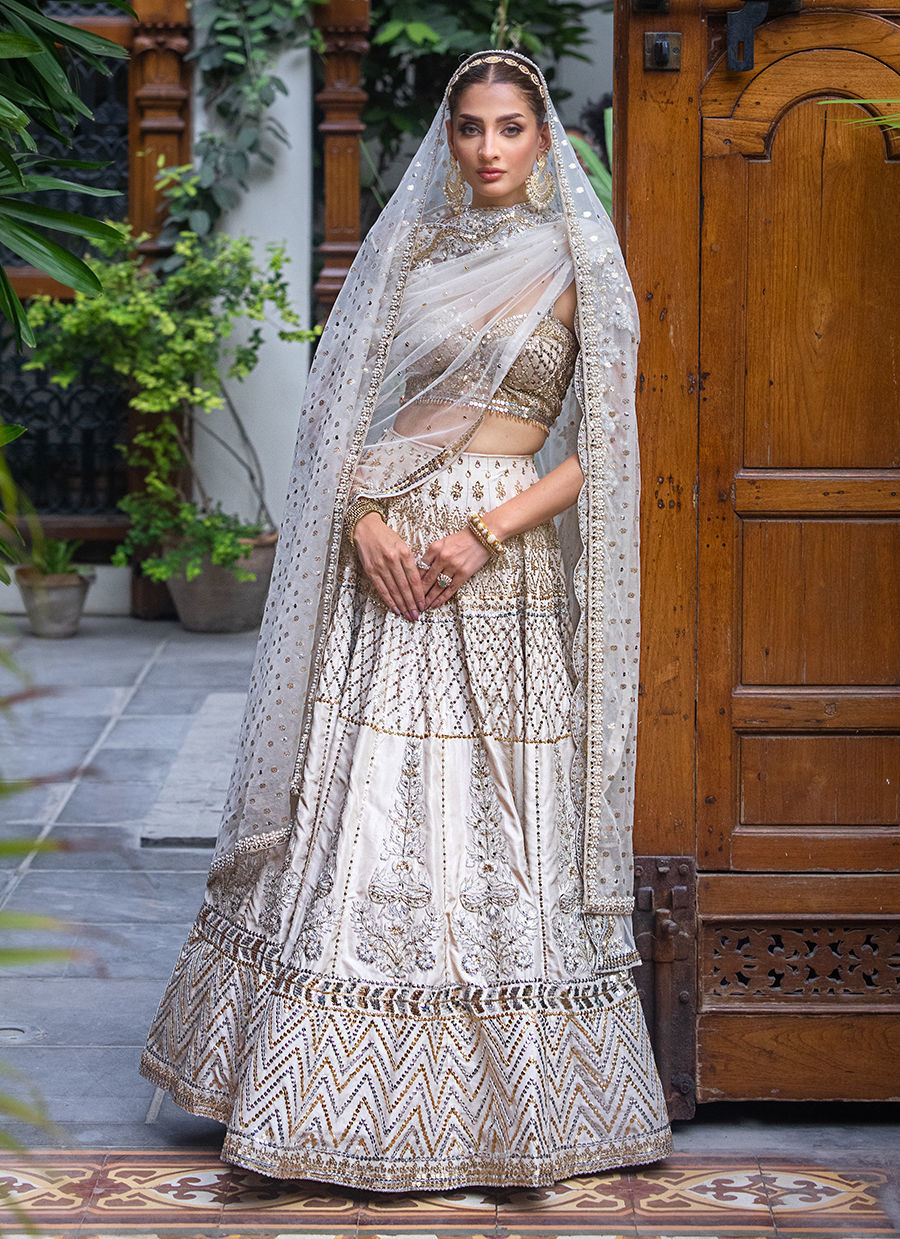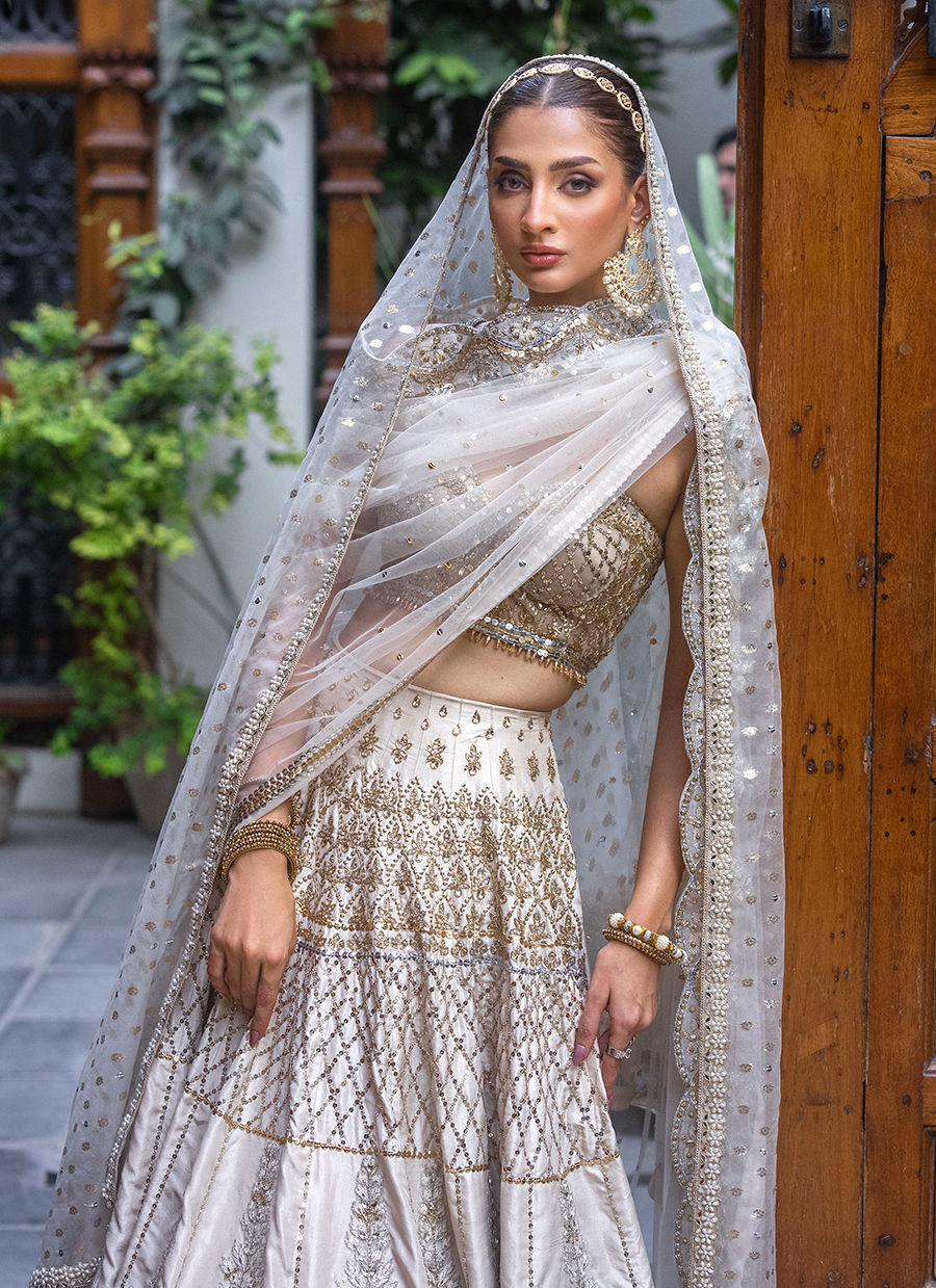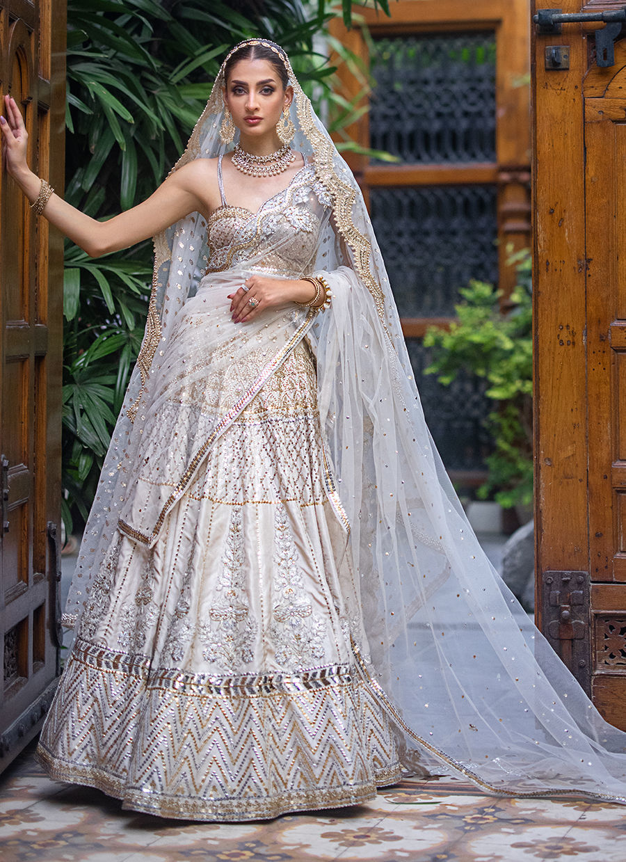 This dreamy bridal lehnga choli exudes modern and feminine charm. It is crafted in raw silk and tulle hand worked like a jewel piece In sequin, resham, zardozi and crystals. The bousteir shaped choli is extensively hand worked in crystals and sequin. The main dupatta in net features extensive hand work in resham, crystals and sequin. The second dupatta is in badla boti In organza.