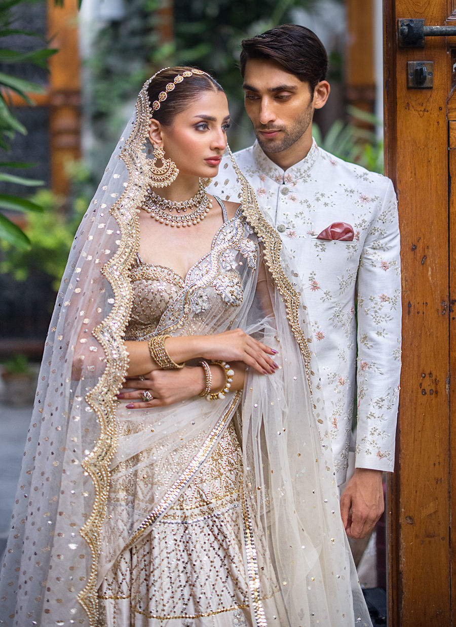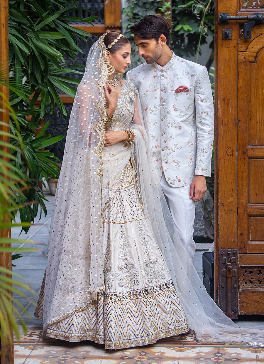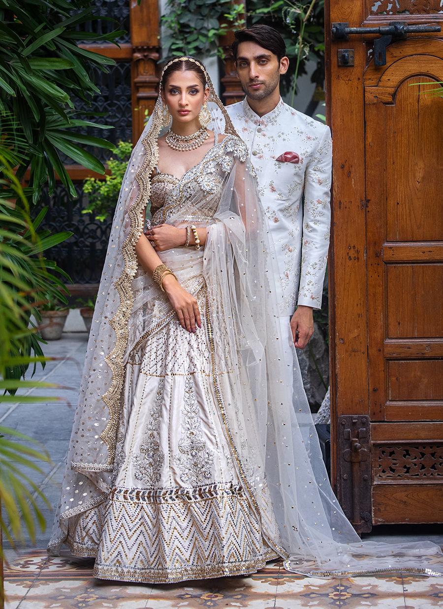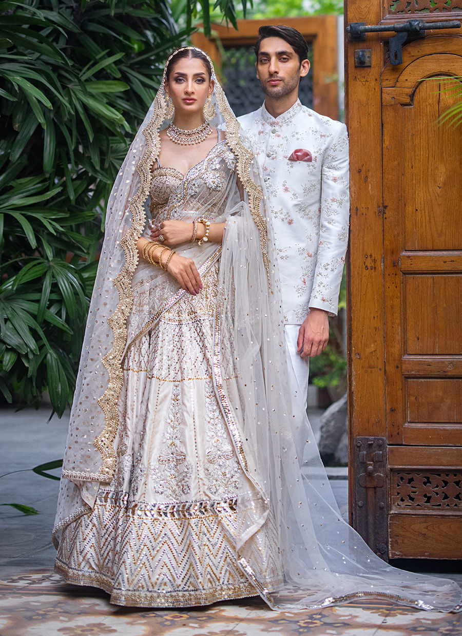 This dreamy bridal lehnga choli exudes modern and feminine charm. It is crafted in raw silk and tulle hand worked like a jewel piece In sequin, resham, zardozi and crystals. The bousteir shaped choli is extensively hand worked in crystals and sequin. The main dupatta in net features extensive hand work in resham, crystals and sequin. The second dupatta is in badla boti In organza.