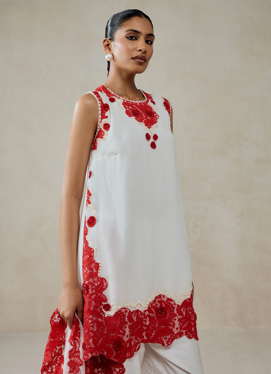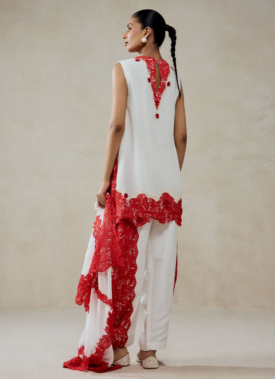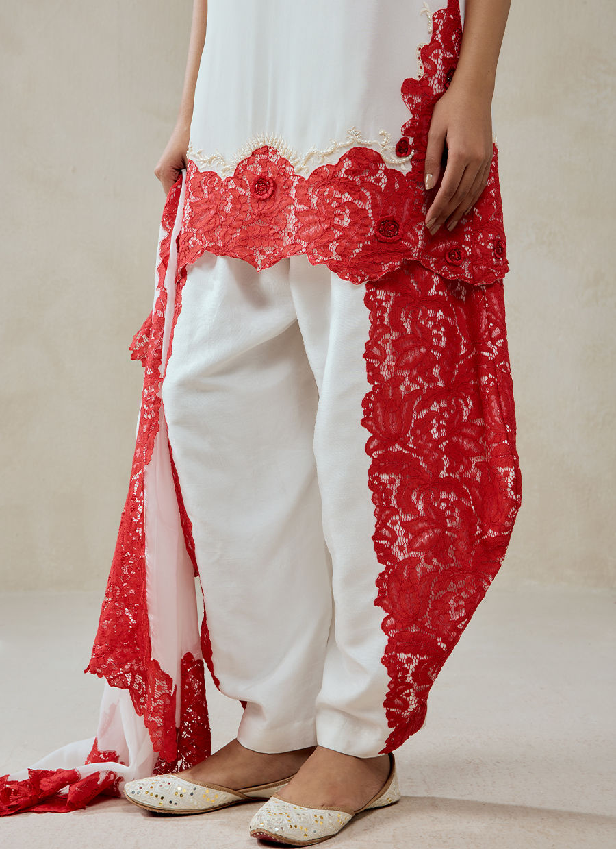 A contemporary kurta set with artistic lace detailing, blending modern minimalism with bold festive accents, crafted in a refined combination of georgette, shandlay net, and shantoon. Features intricate red lace appliqué placed asymmetrically across the kurta. A beautifully detailed lace border along the hemline, adding richness and definition. Statement lace panels cascading along the sides, creating movement and a layered visual effect. Finished with fabric buttons and minimal embellishments, keeping the focus on texture and contrast.