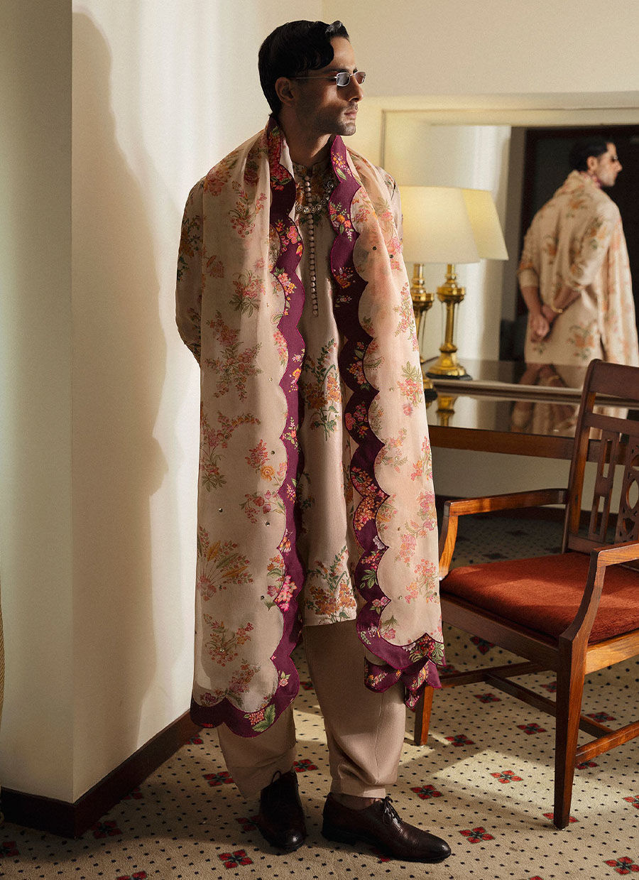 Elevate your traditional attire with this handsome screen-printed beige raw silk kurta, designed specifically for the man. The soft beige hue provides a versatile canvas, perfect for festive occasions. The kurta features exquisite loop button detailing at the neckline, adding a touch of sophistication while maintaining a classic aesthetic. Crafted from luxurious raw silk, it offers a comfortable fit that drapes beautifully, ensuring you look sharp and stylish. Paired with a plain shalwar, this ensemble effortlessly blends elegance with comfort, making it an ideal choice for any celebration or gathering. Embrace timeless style and make a statement with this elegant kurta-shalwar combination.