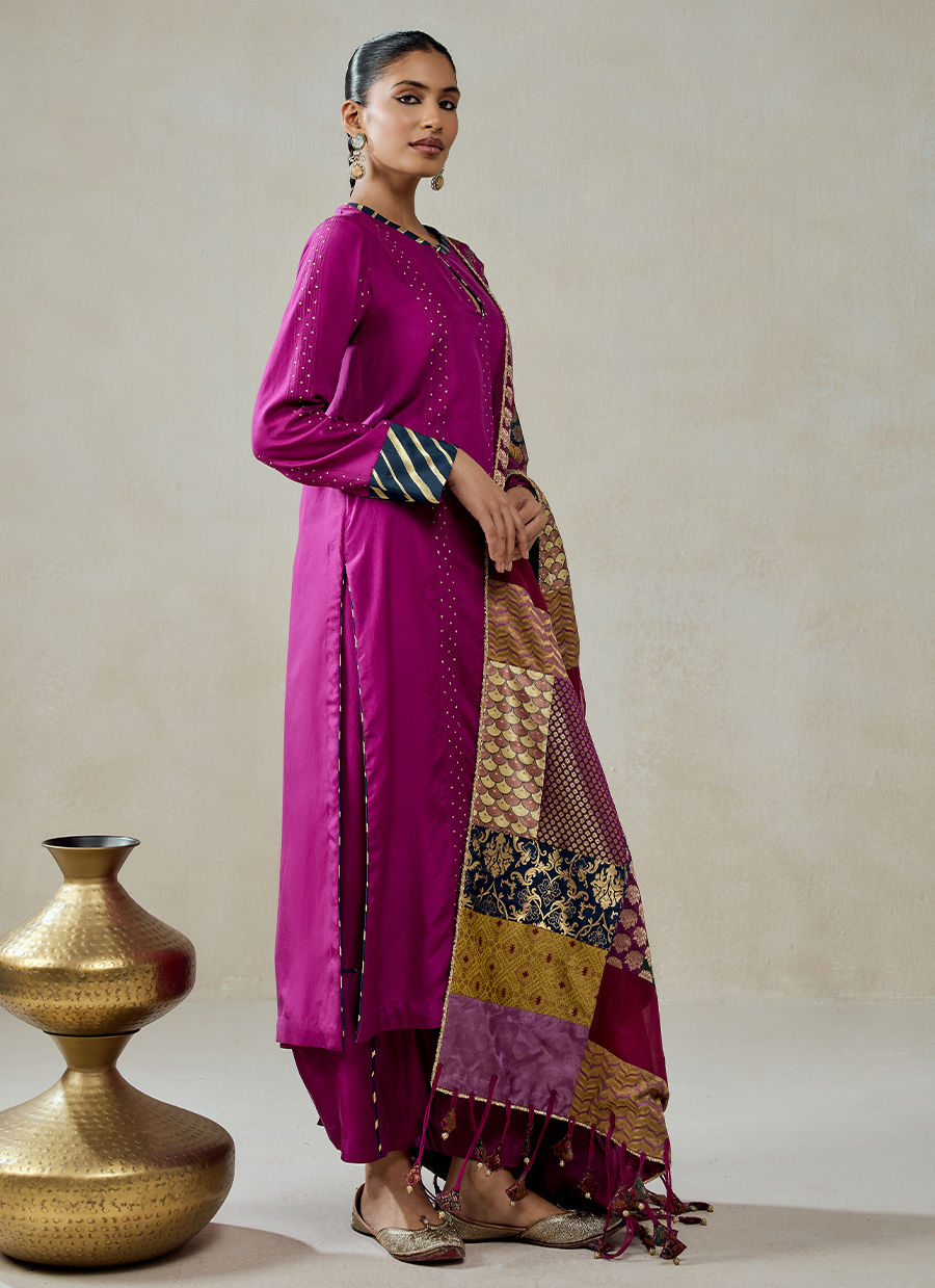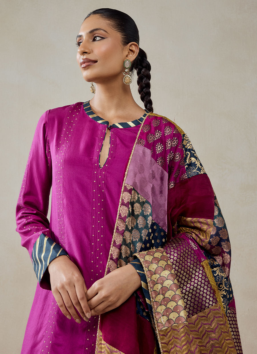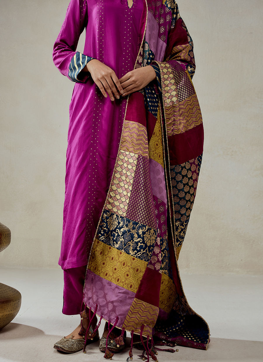 A classic two-piece kurta set paired with a statement dupatta, crafted in a luxurious blend of Habutai silk, brocade, and shantoon—bringing together fluid minimalism and opulent surface richness. The kurta is delicately enhanced with subtle linear embellishments and fine vertical detailing, adding texture without overwhelming the look. It features a minimal neckline with a slit and refined finishing, maintaining an elegant and modern appeal. The dupatta is the hero element, crafted in patchwork-style brocade panels featuring varied traditional motifs. Rich woven patterns in gold zari create a tapestry-like effect, while tassel detailing along the edges adds movement and artisanal charm.