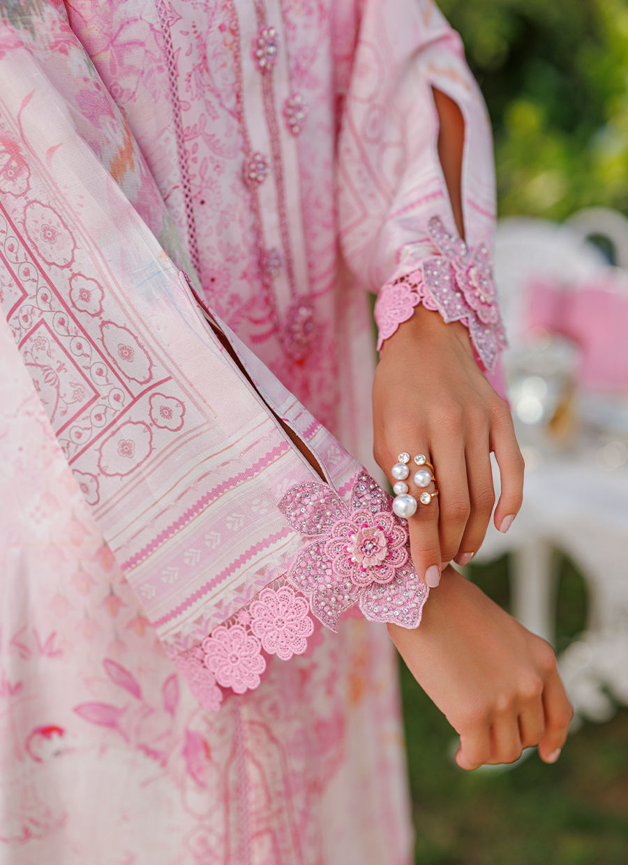 A graceful loose-fit A-line kurta designed with a distinctive nifti neckline, featuring delicate asymmetric 3D floral embellishments that add a touch of modern artistry. The bell sleeves, styled with subtle slits, are enhanced with a statement 3D floral bunch, creating an effortlessly elegant silhouette. It is paired with a powder pink sheesha silk izzar adorned with intricate appliqué work, while an ombré medium silk dupatta finished with a brooch completing the look. *Model is 5'10" and is wearing a size small.