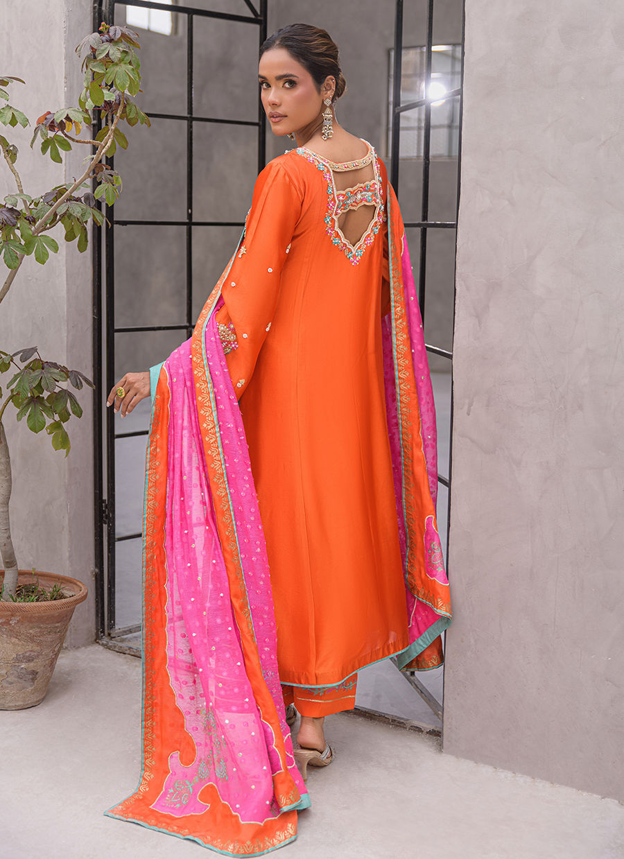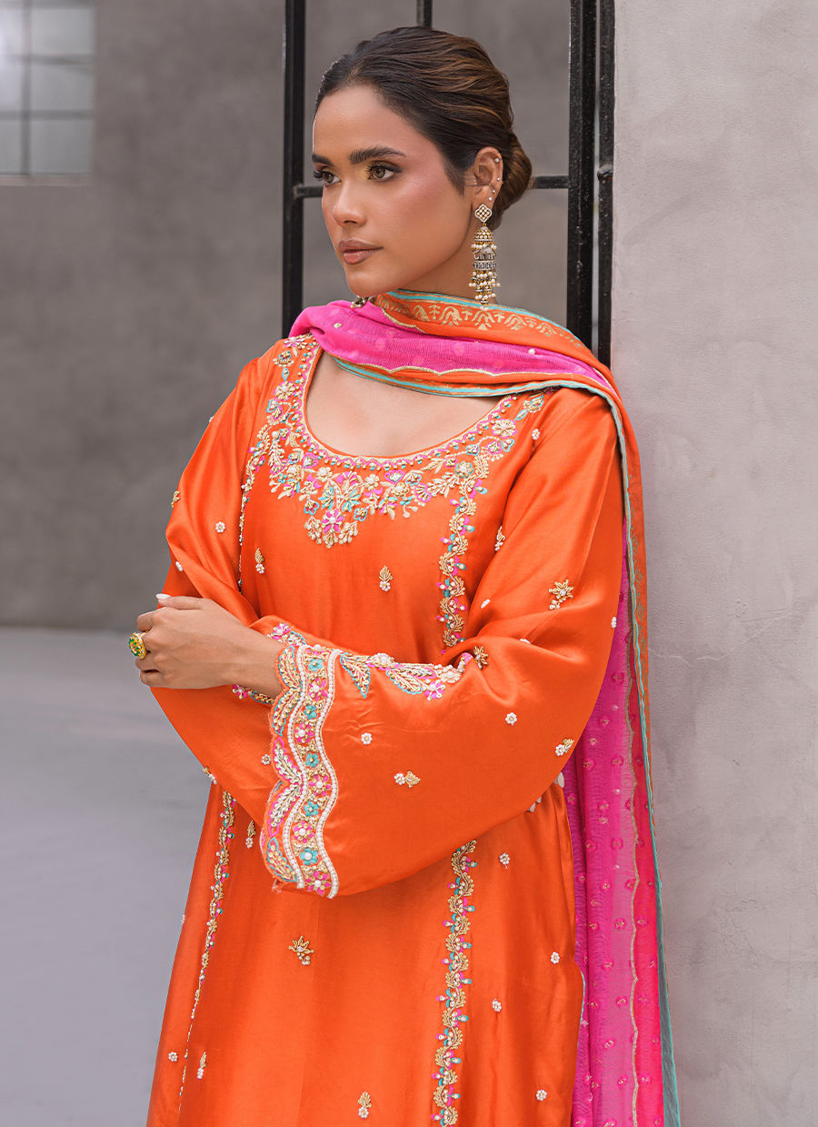 Color: Orange Fabric: Shirt: Sheesha Pant: Silk Work Details: Embroidered