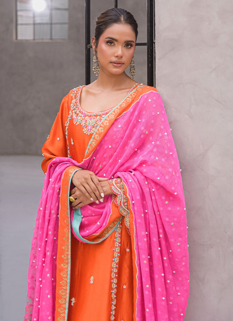 A vibrant burnt orange straight kameez, exquisitely detailed with silver and resham embroidery along the neckline, sleeves, and hemline. The look is elevated with a striking contrast dupatta in fuchsia pink and orange hues, adorned with delicate motifs and finished with a fine green edging. This ensemble is a celebration of festive charm, blending tradition with modern vibrance—perfect for mehndi festivities, dholkis, or day weddings