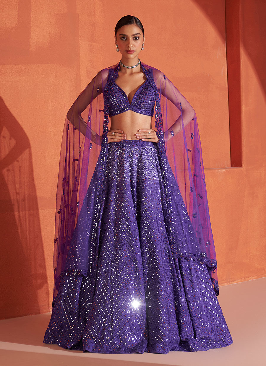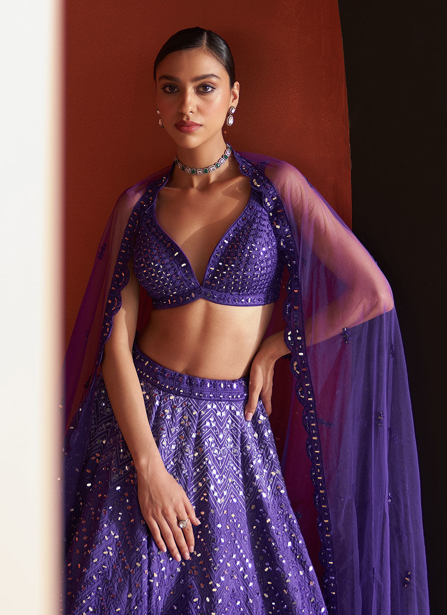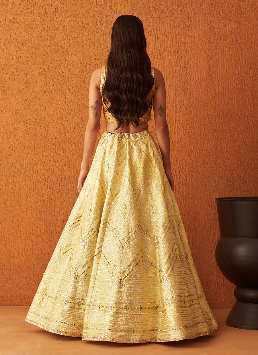 A yellow raw silk lehenga set embroidered with gota and mirror paired with a mustard blouse and purple silk dupatta.