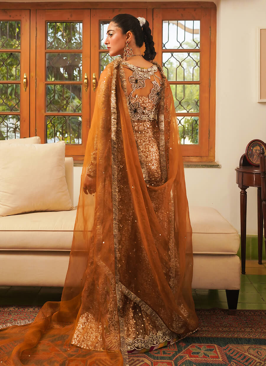Includes: Shirt, Trouser, Dupatta Description: Step into the world of elegance with 'Zafraan,' a captivating formal ensemble in the enchanting shade of dull mustard yellow. This all-inclusive set includes a fully hand-embellished shirt, resplendent with nakshi dabka, resham thread, and shiny stones, exuding luxury. The bodice cut shirt, crafted in net, boasts long side slits and a scalloped border for an elegant and contemporary silhouette. Complementing this is a pair of shiny badal zari organza flared trousers. The ensemble is completed with an organza dupatta featuring a chan and kiran lace border, adding a touch of sophistication. Zafraan seamlessly blends traditional charm with modern embellishments, making a lasting statement.