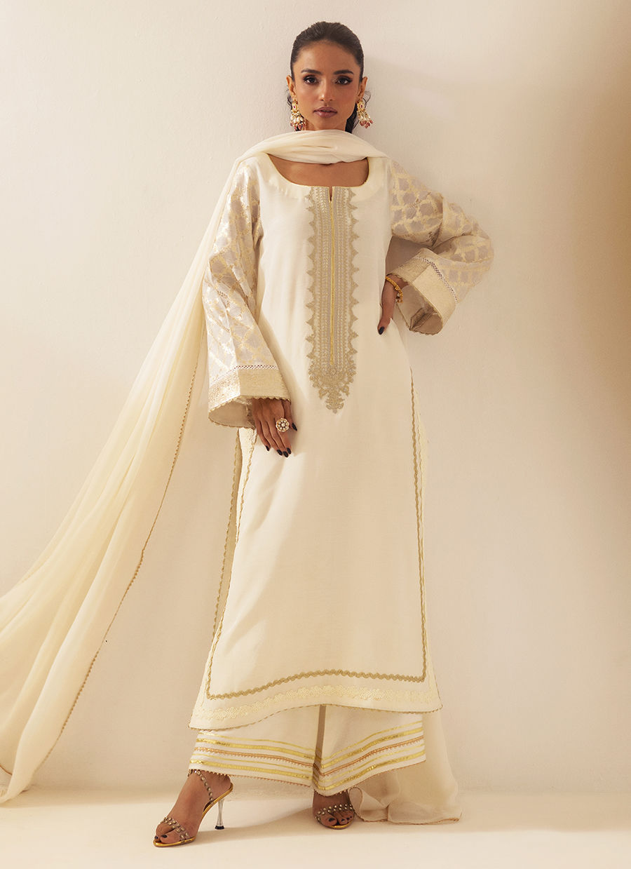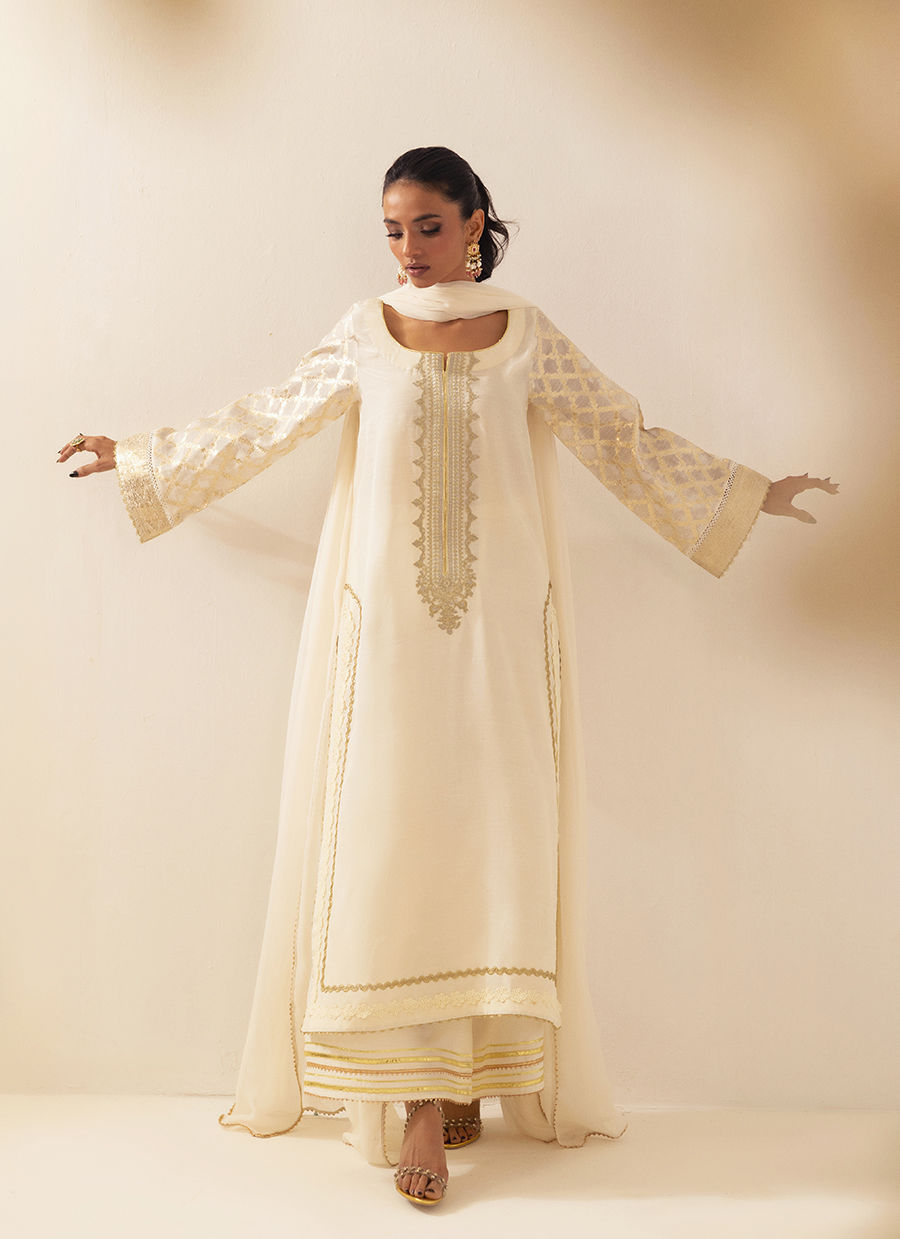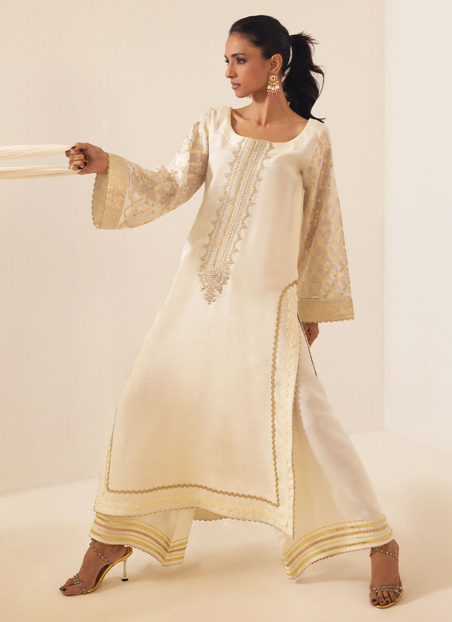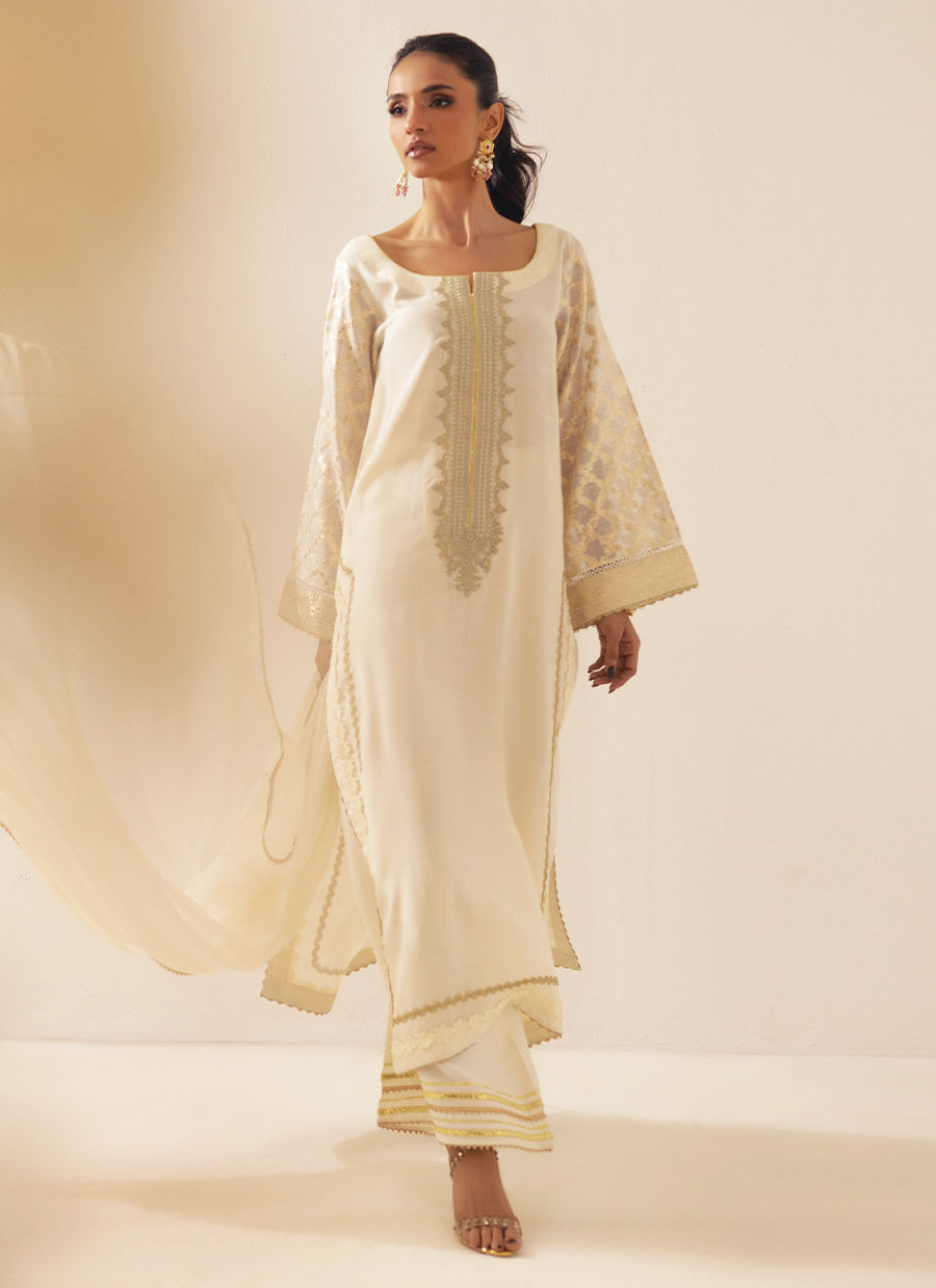 This long silhouette shirt in a delicate ivory is expertly crafted from raw silk canvas, showcasing intricate zari appliqué details along the neckline. The side slits are elegantly enhanced with gota and crochet lace embellishments. The sleeves are meticulously designed with shimmering lorex, and the ensemble is accompanied by matching straight pants and a chiffon dupatta, which is elegantly finished with gota edging, ensuring you stand out this festive season.
