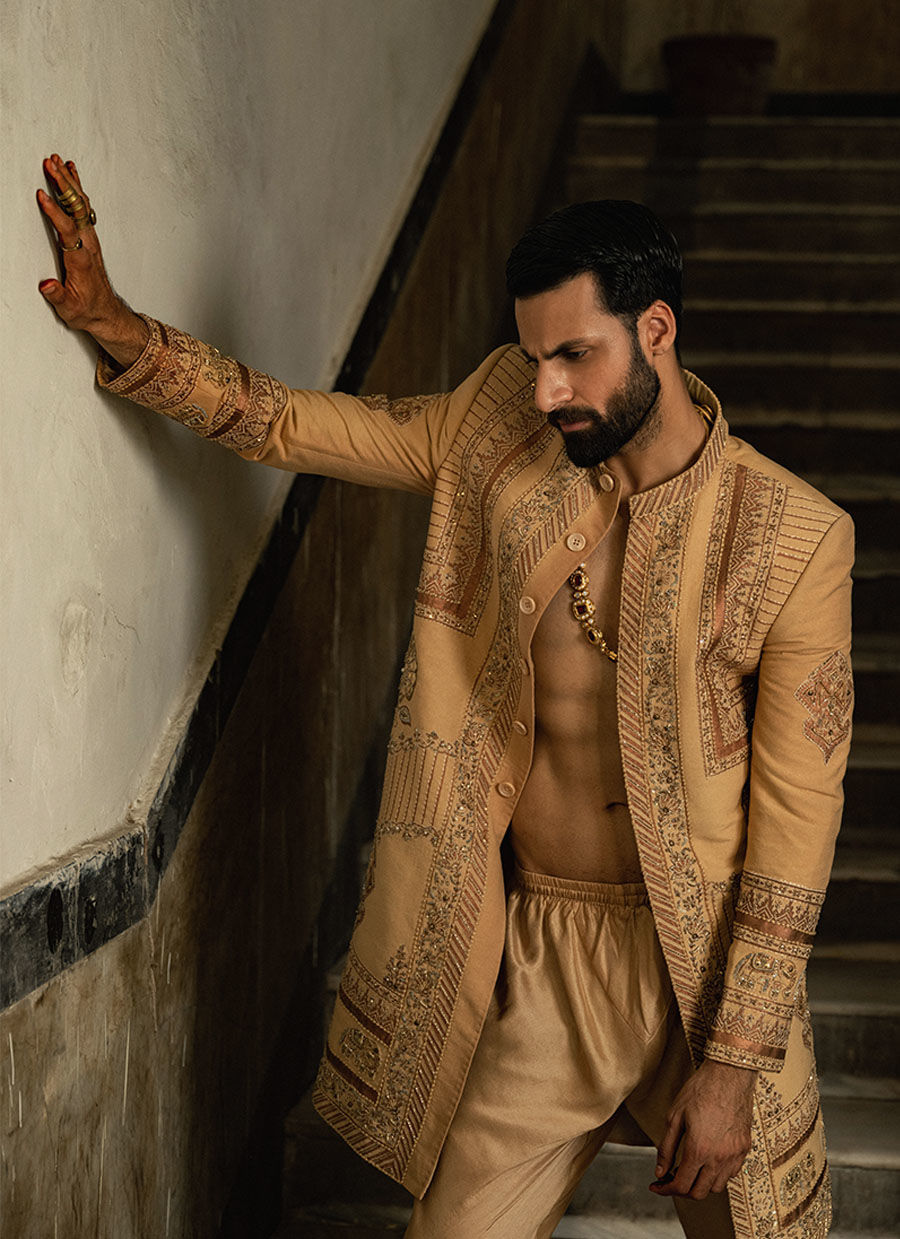 Zarrar is our golden-brown-hued signature MNR sherwani. It is made up of sophisticated silken fabric and features tonal embroidery inspired by Mughal architecture arranged in a grid-like manner, forming borders across the chest and hemline. The intricate niches and elephant motifs are done in hand-embroidered accents in tonal brown shades. Although lavish, they evoke a sense of tradition and groundedness.