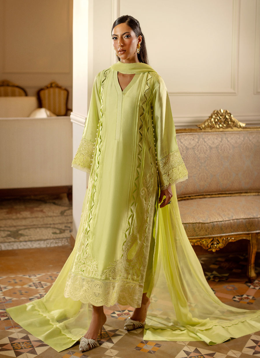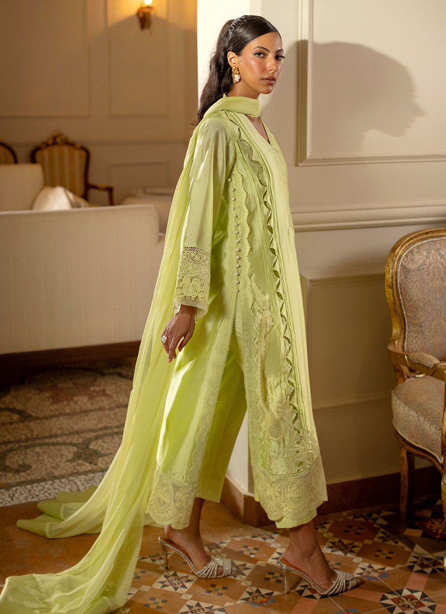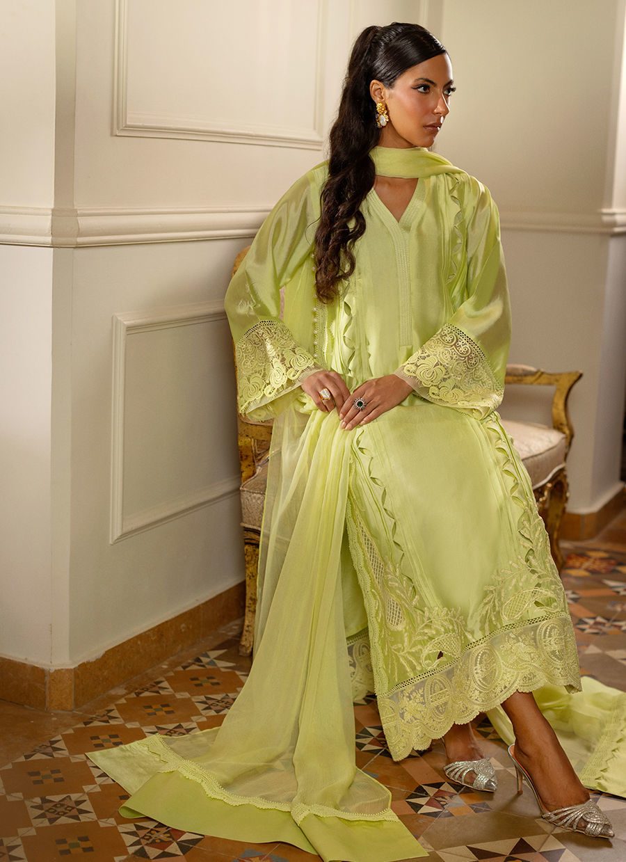 Zarrin - Long silhouette shirt in zesty lime silk canvas featuring fabric manipulation details on centre front. The hemline is enhanced with intricate appliqué details. The outfit comes with matching raw silk pants and a chiffon dupatta to set you apart this festive season.
