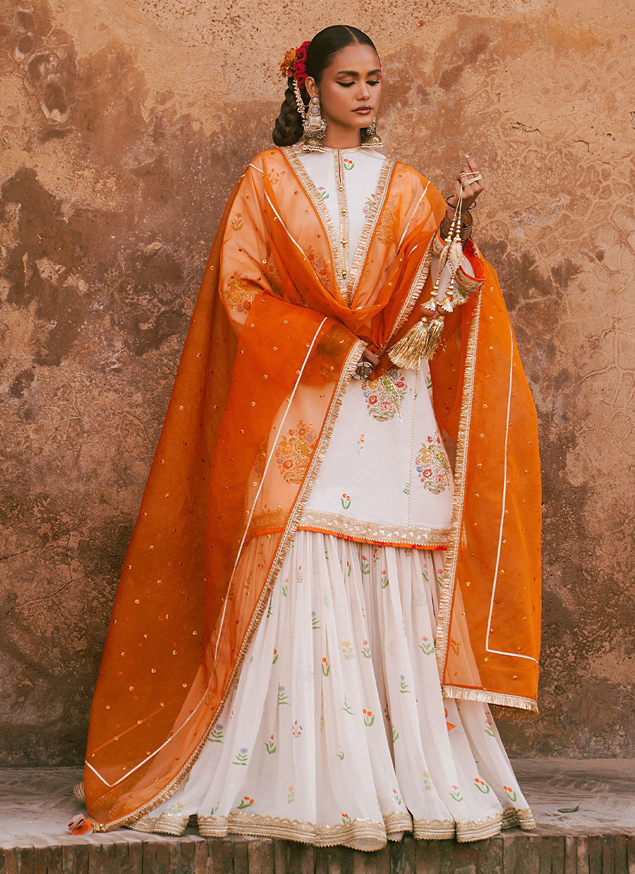 Color: Ivory Fabric: Shirt: Cambric, Gharara: Chiffon, Dupatta: Chaan Work Details: Embellished