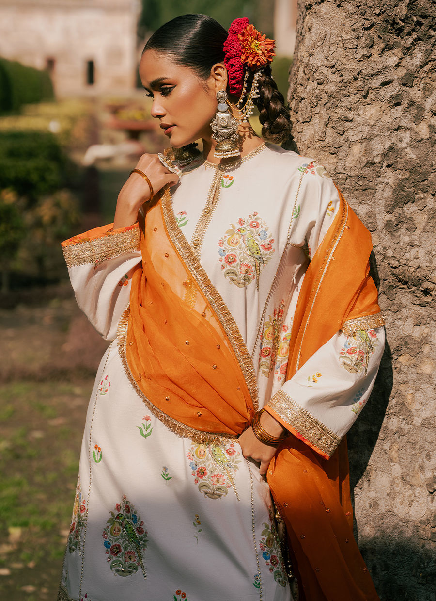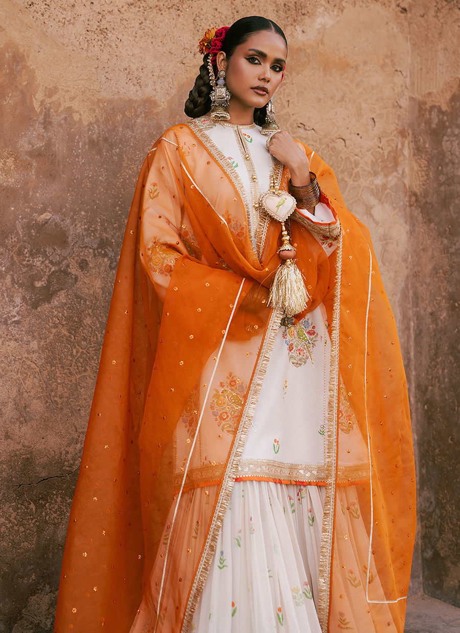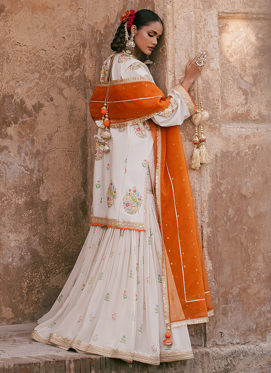 Zauq, An ivory cambric printed shirt, beautifully finished with refined trims and an elegant border, enhanced with delicate adda work for a handcrafted touch. It is paired with a flowing chiffon gharara, detailed with graceful trims that add movement and charm. The ensemble is completed with a single chaan dupatta, lending a subtle festive glow to this timeless and sophisticated look.