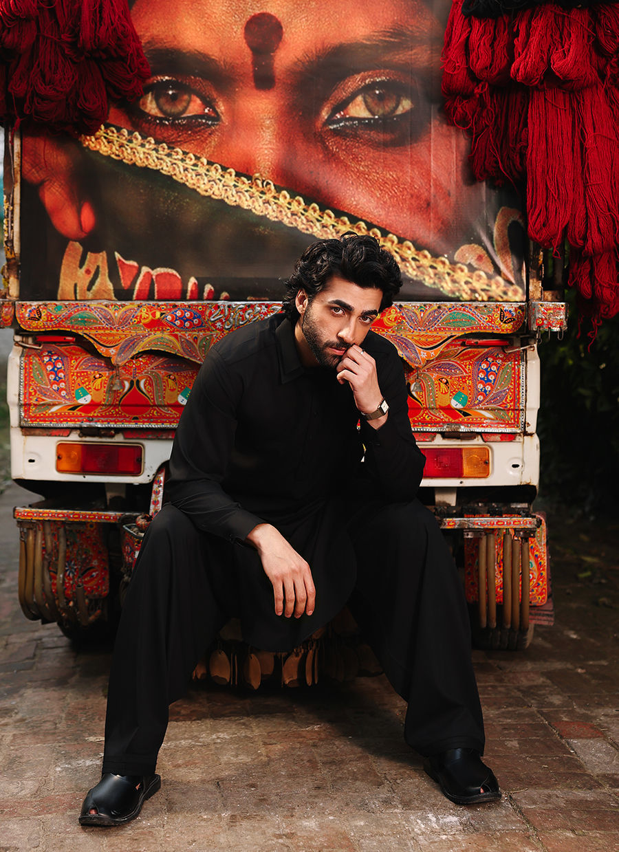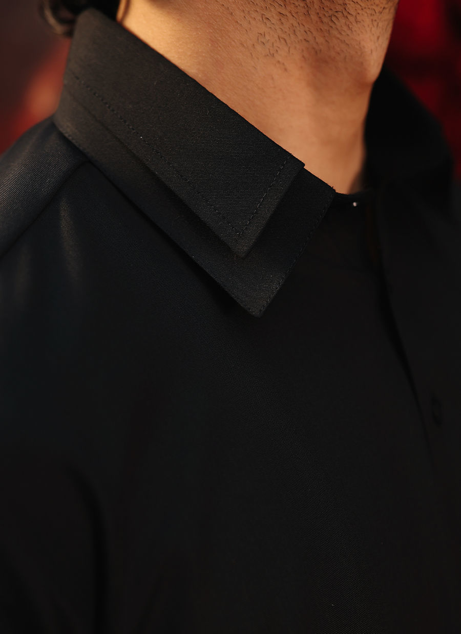 Striking black ensemble tailored for a bold and refined appearance. Designed with a distinctive double collar and a clean front-buttoned style for a sharp, structured look. The shalwar is finished with a traditional doori at the bottom, adding comfort and subtle detail to this timeless, elegant outfit.