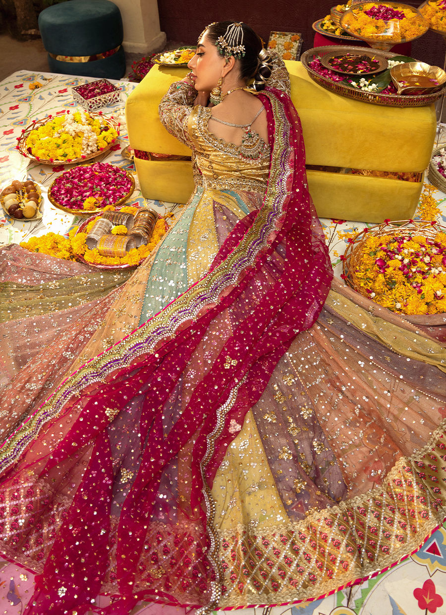 This multicolored zari net pishwas in muted shades enhanced with old school gota and sequin details on each panel. The lamé gold bodice is enhanced with age old antique zardozi, resham and gota details. The kalidar is paired with deep pink scalloped dupatta featuring multicolored appliqué details.