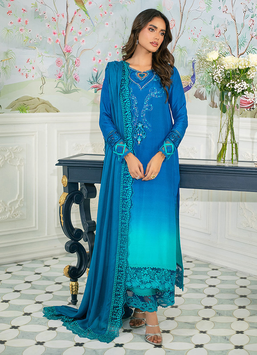 Long silhouette ombre shirt presented in exquisite peacock blue shades on pure raw silk canvas, featuring tone-on-tone embroidered detailing at the neckline. The sleeves are elegantly enhanced with fabric manipulation techniques, while the shirt is complemented by a medium silk dupatta showcasing intricate schiffli embellishments. The ensemble is completed with a designed raw silk izaar, thus creating a sophisticated overall appearance.