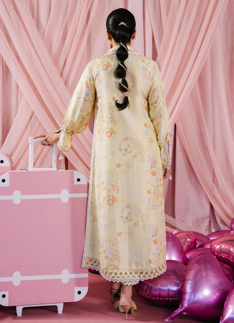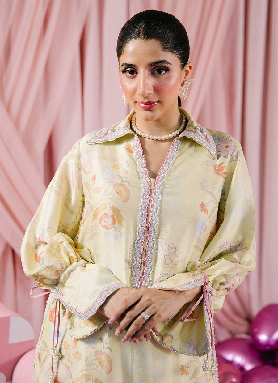 A seamless lemon-hued ensemble adorned with a delicate floral print, radiating freshness and effortless charm. The look is elevated with an embellished statement collar, intricately detailed with pearls and beads for a refined yet eye-catching finish. Designed with voluminous bishop sleeves featuring subtle slits, the silhouette feels graceful with a modern edge. Paired with a lemon izaar highlighted by contrasting details, this outfit is a perfect blend of softness, sophistication, and contemporary festivity.