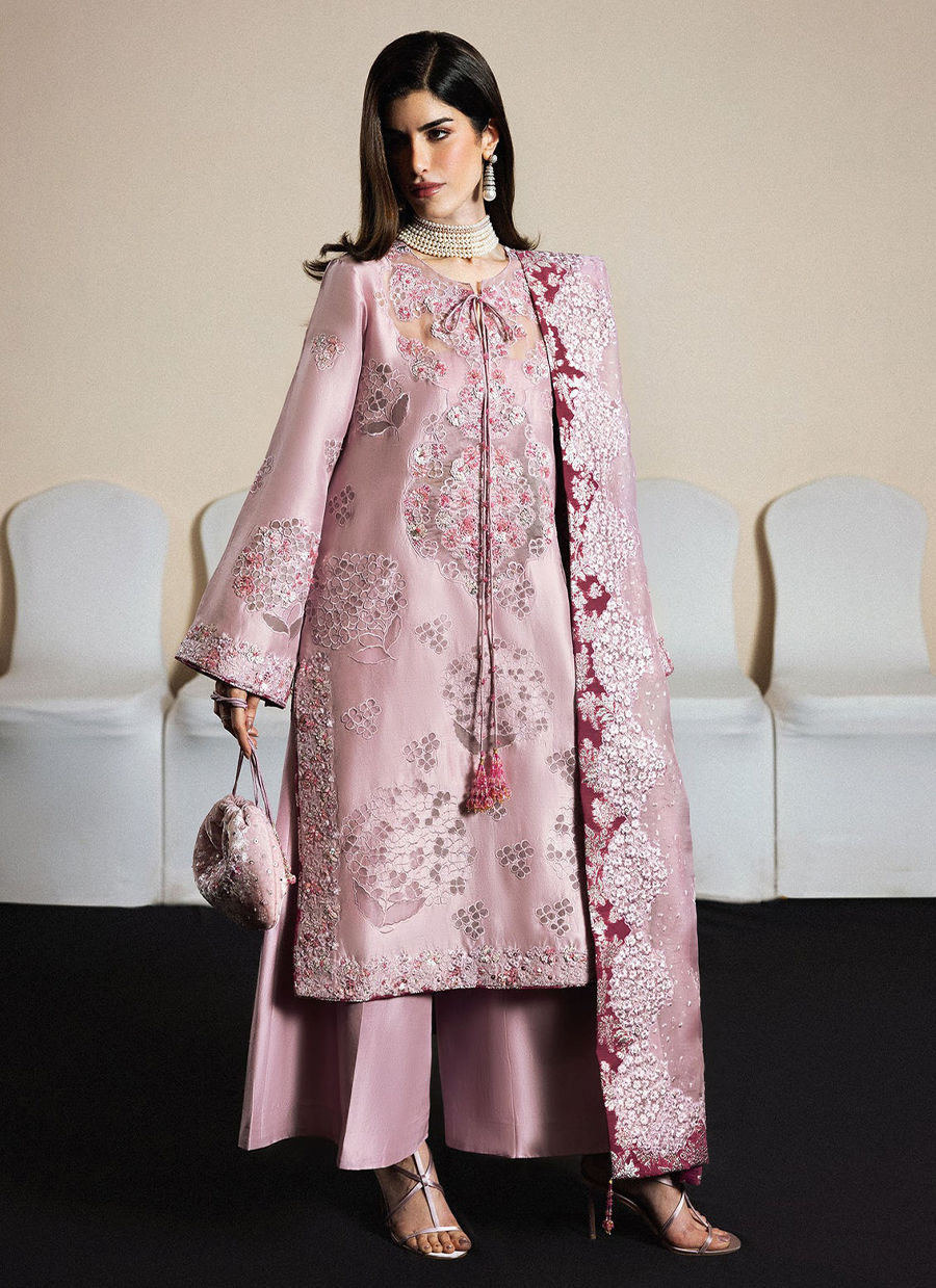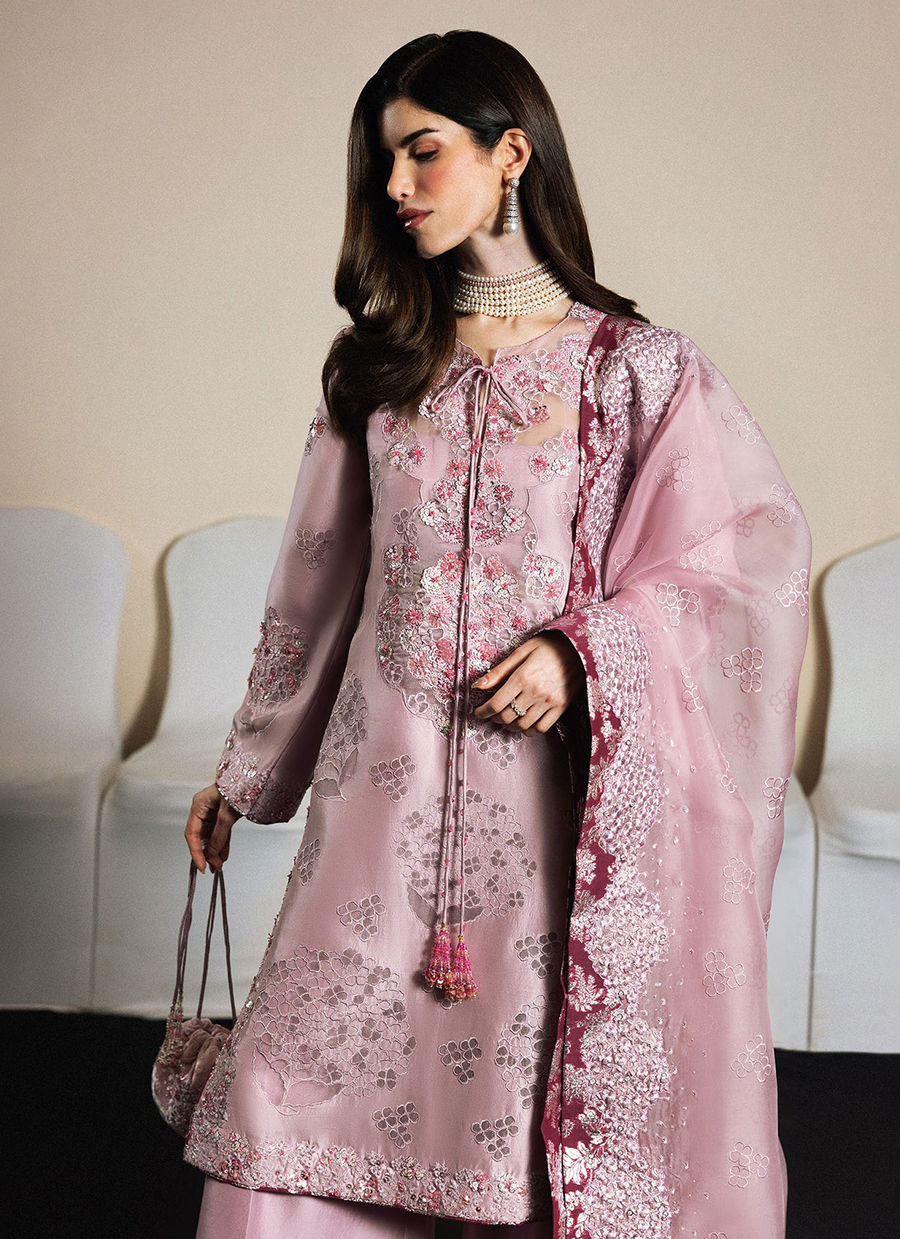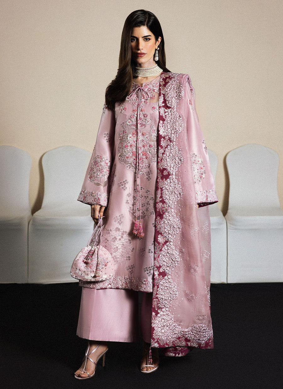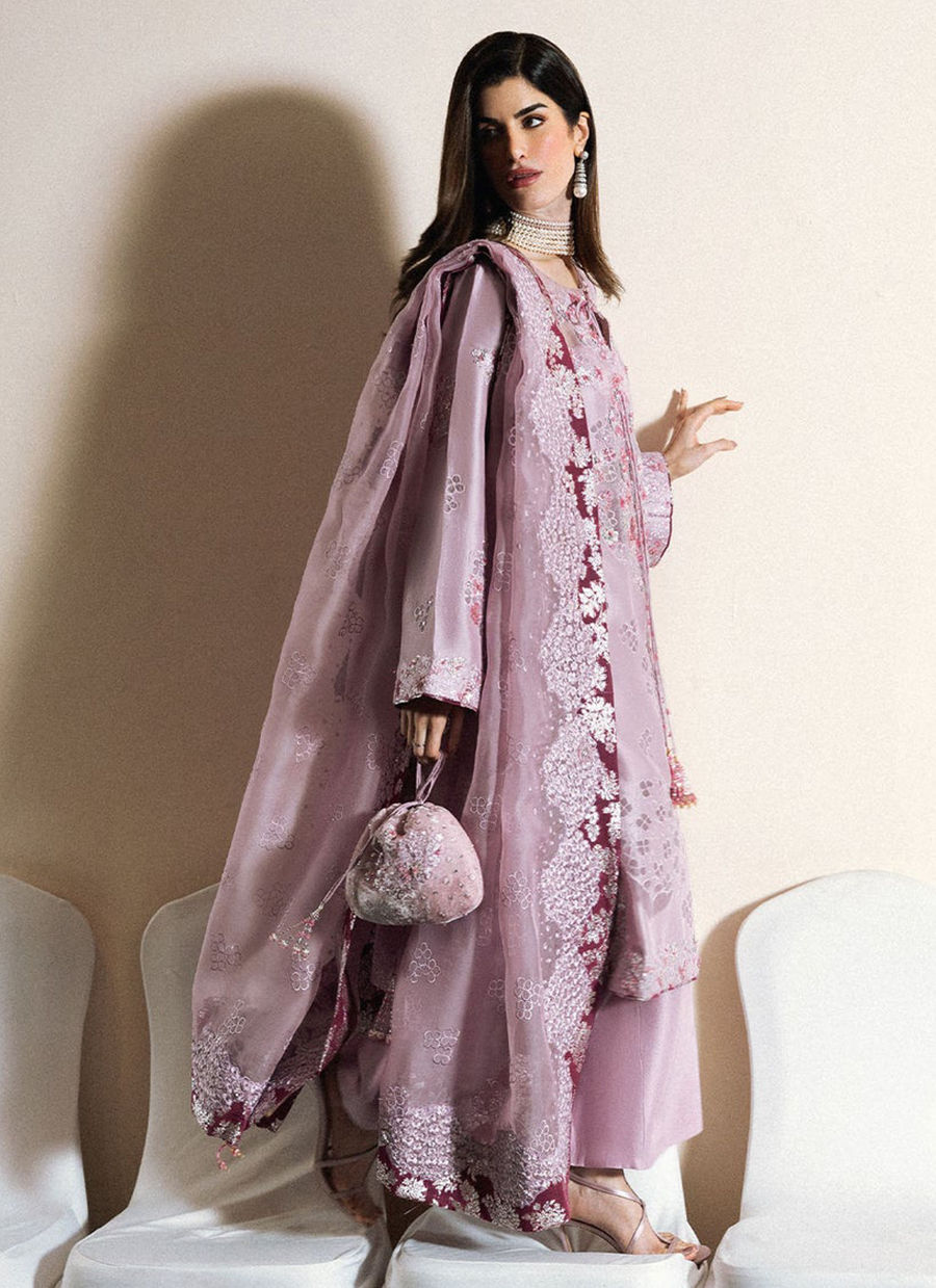 These designs utilise a mix of structured borders and flowing organic clusters to create a high-fashion aesthetic. This outfit is a traditional South Asian three-piece ensemble in a lilac colour. The shirt appears to be made from raw silk and sheer organza with a lining underneath. It features intricate floral embroidery across the front, possibly enhanced with subtle sequin detailing on the neckline. The neckline has delicate tassel ties, and the hem is finished with an embroidered border. The dupatta is made from matching organza and is beautifully embroidered throughout with a four-sided border. A comprehensive look at floral embroidery and print elements translates into finished garments.