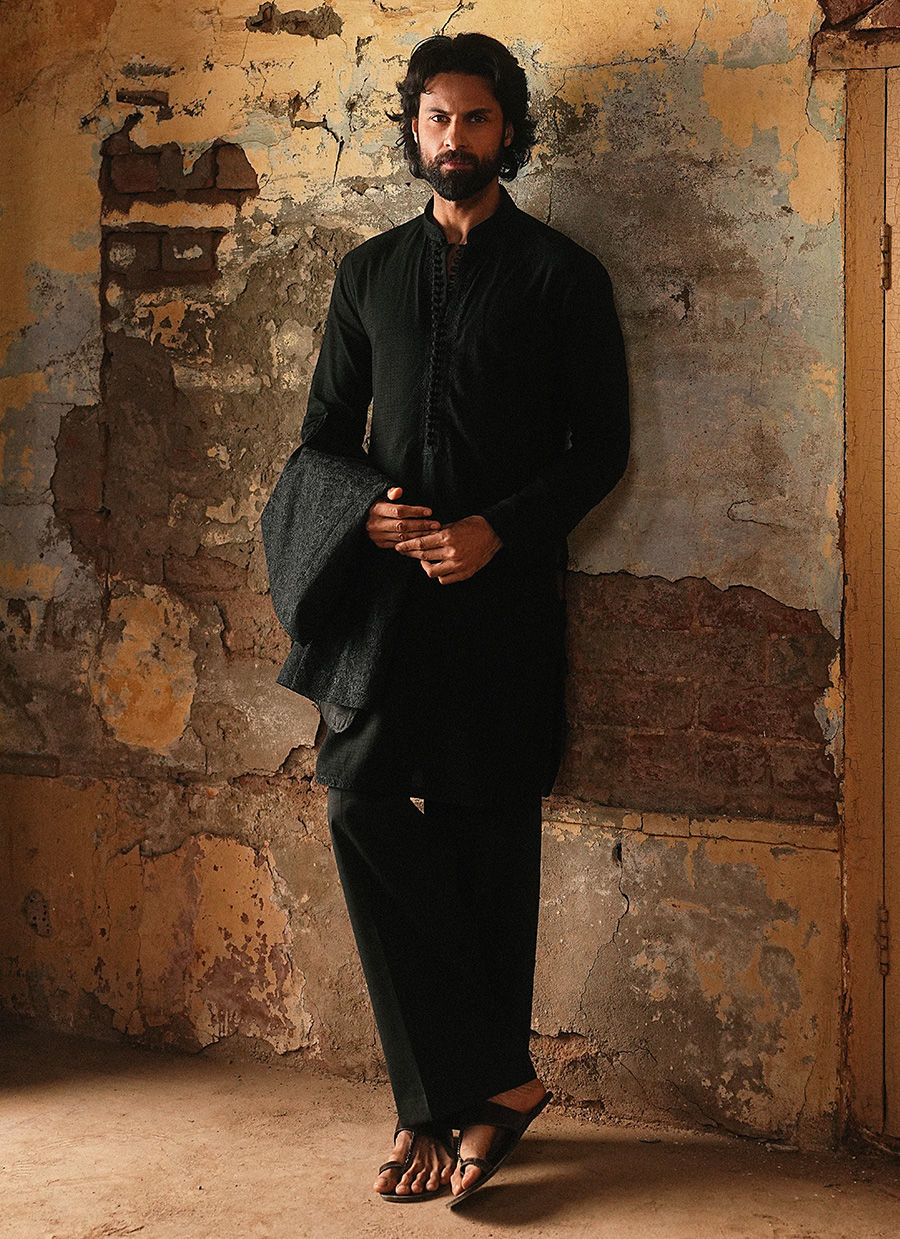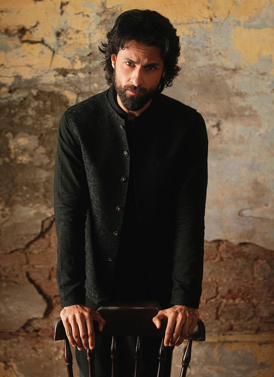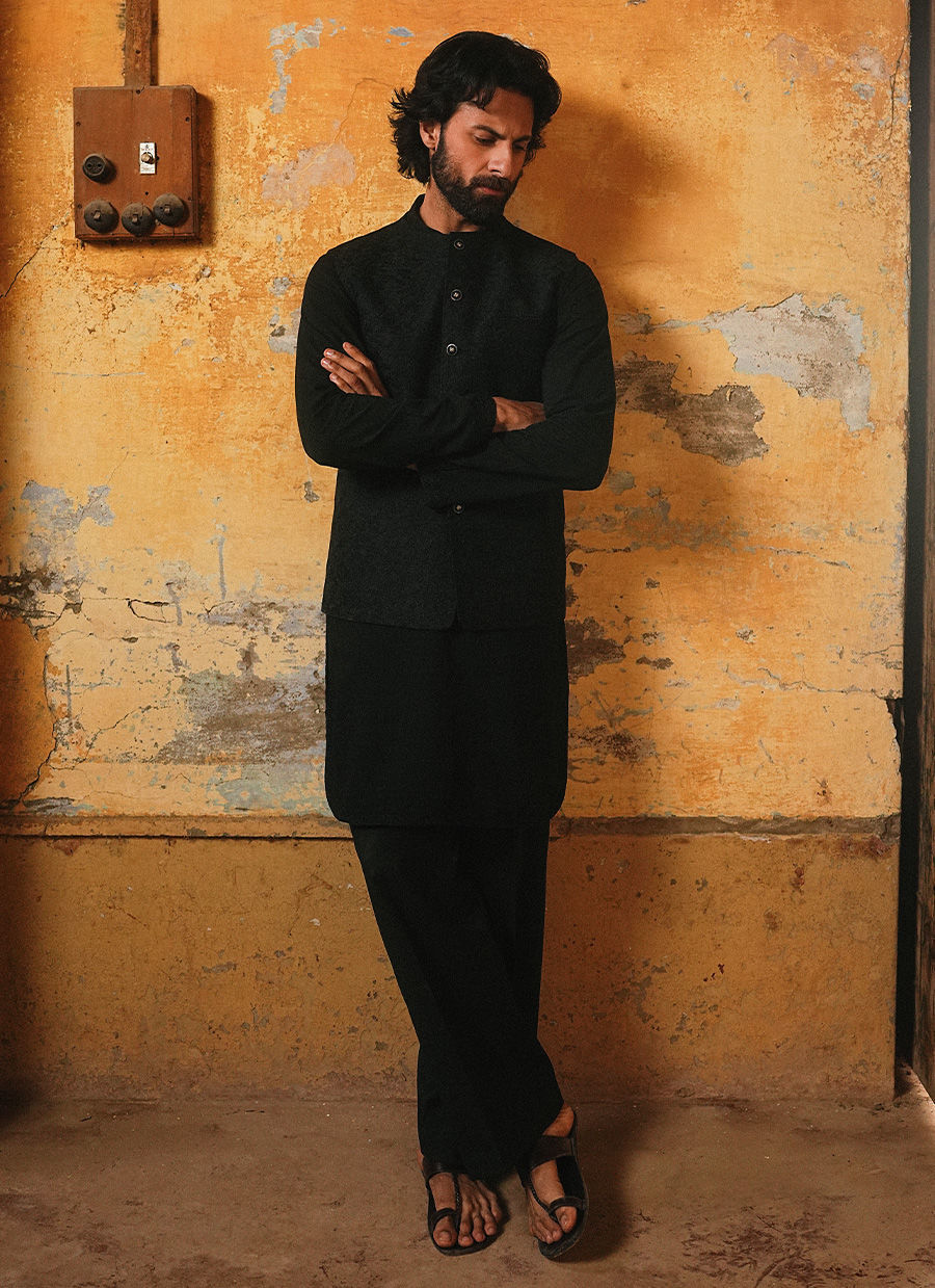 A refined fusion of textures and craftsmanship, this ensemble features a stylish waistcoat made from luxurious paper silk fabric, adorned with an all-over floral repeat that adds a graceful and sophisticated charm. The kurta is crafted from self cotton (jacquard), offering a soft feel with subtle woven detailing, and is beautifully enhanced with intricate Aari work for a touch of traditional elegance. Perfectly balanced between modern style and classic artistry, this outfit is ideal for festive gatherings and special occasions.