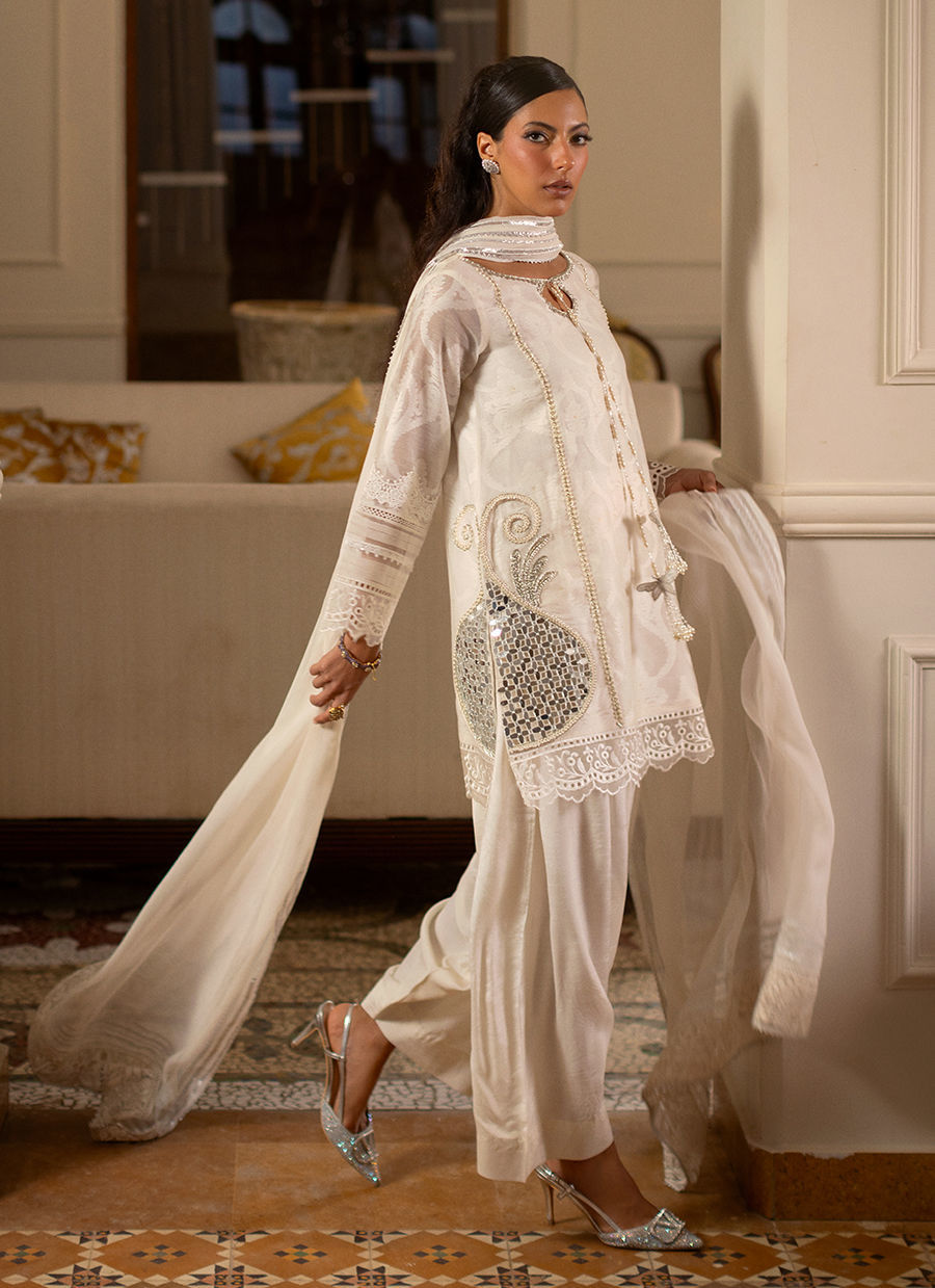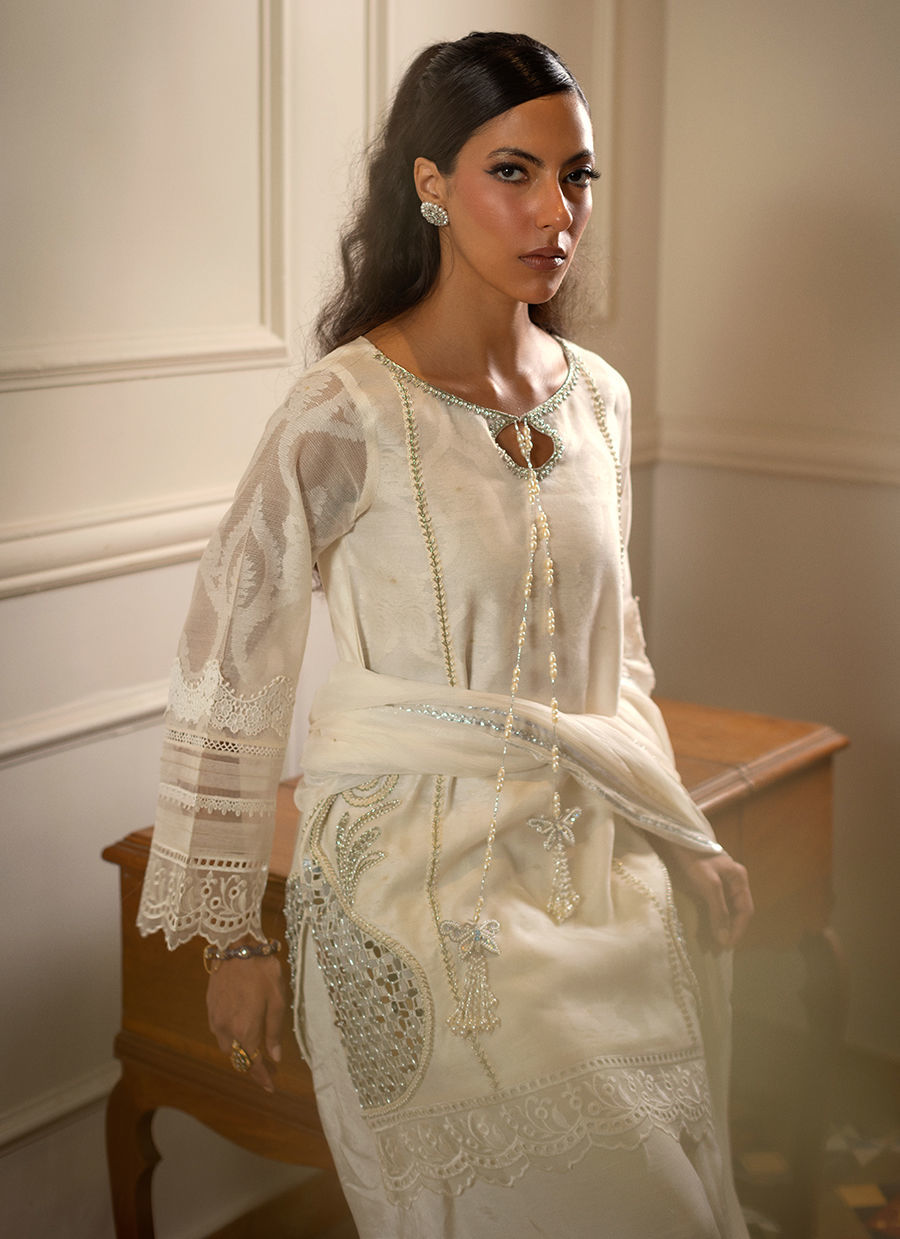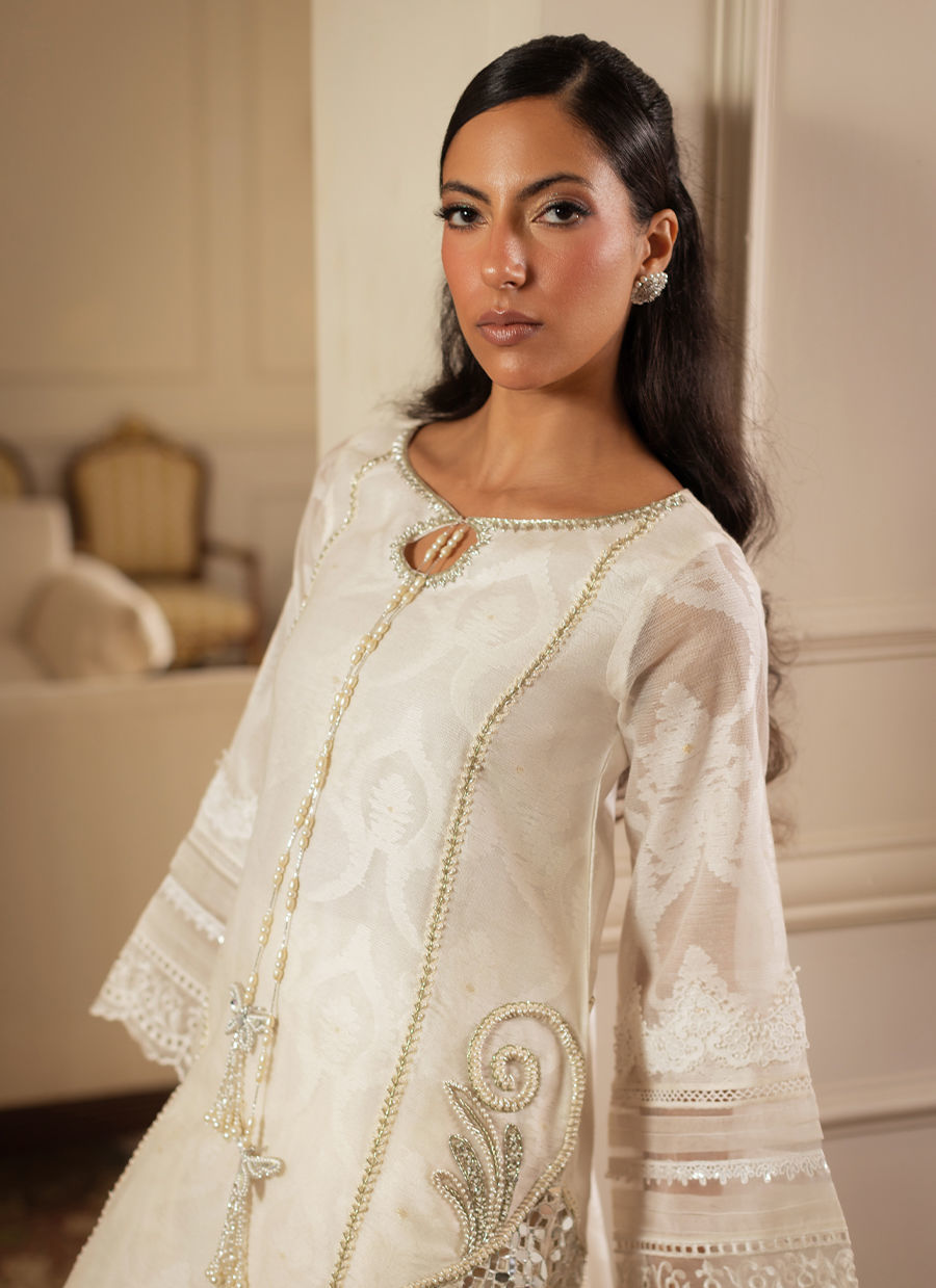 Zohreh - Knee length shirt in subtle ivory embossed silk net canvas featuring cutwork paisley details on centre front and back, the cutwork details are adorned with mirrors, pearls and subtle self on self resham. The hyderabadi neckline is adorned with handcrafted zardozi details and a statement dangling tassels. The outfit comes with matching farshi shalwar and a chiffon dupatta to set you apart this festive season.