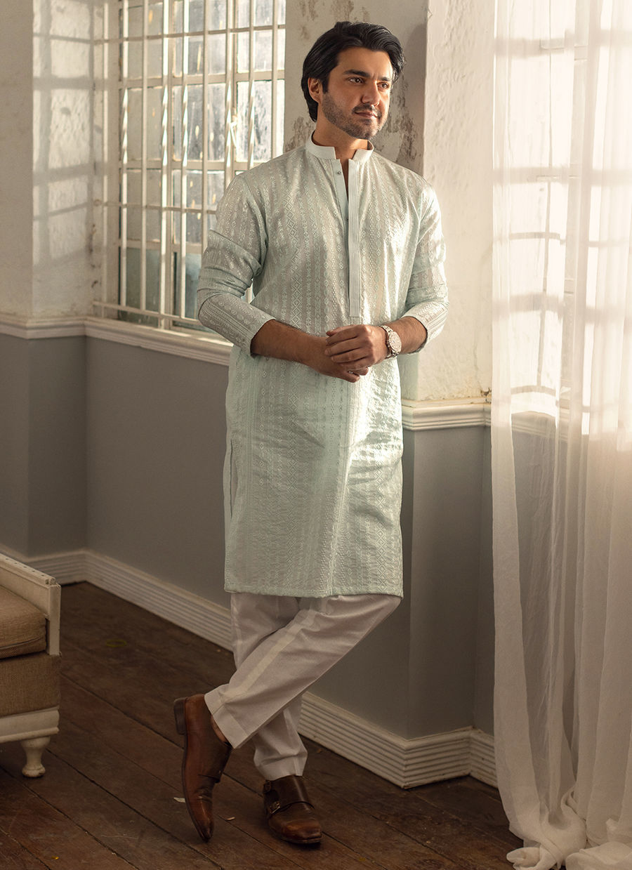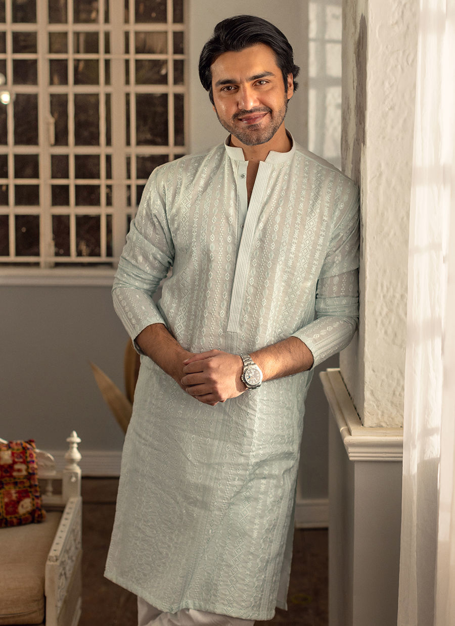 This self-embroidered kurta in an enchanting powder blue showcases intricate tone-on-tone embroidery . The neckline is elegantly adorned with a placket that features refined running stitch details. The collar is further enhanced with decorative anchor running stitch elements. This kurta is designed to be worn with straight cotton pants, providing a refined and cohesive look.